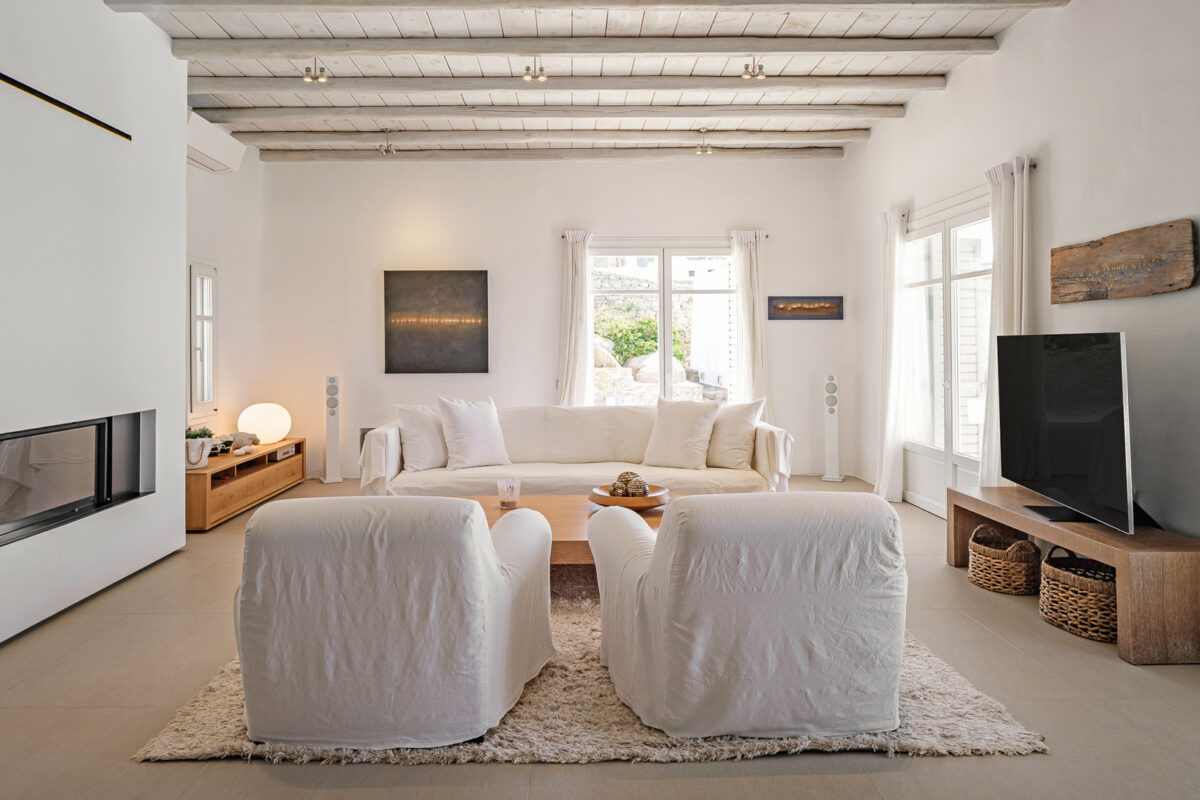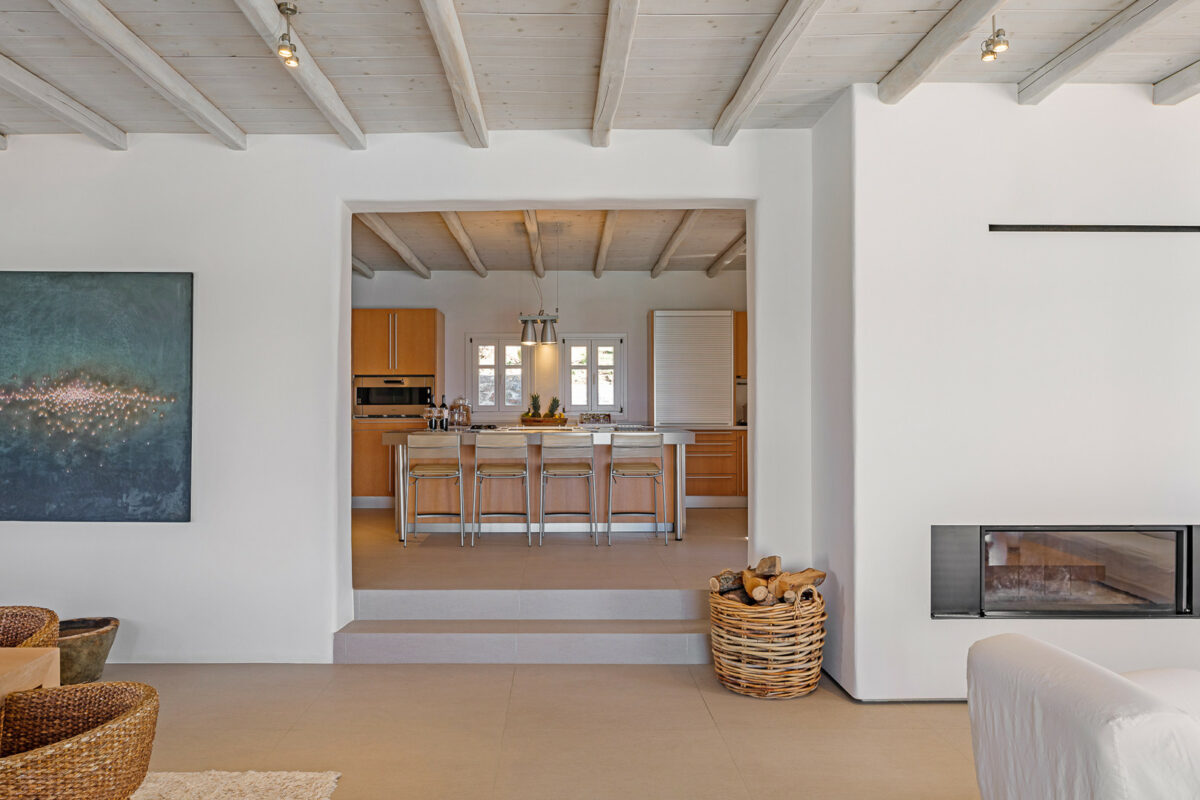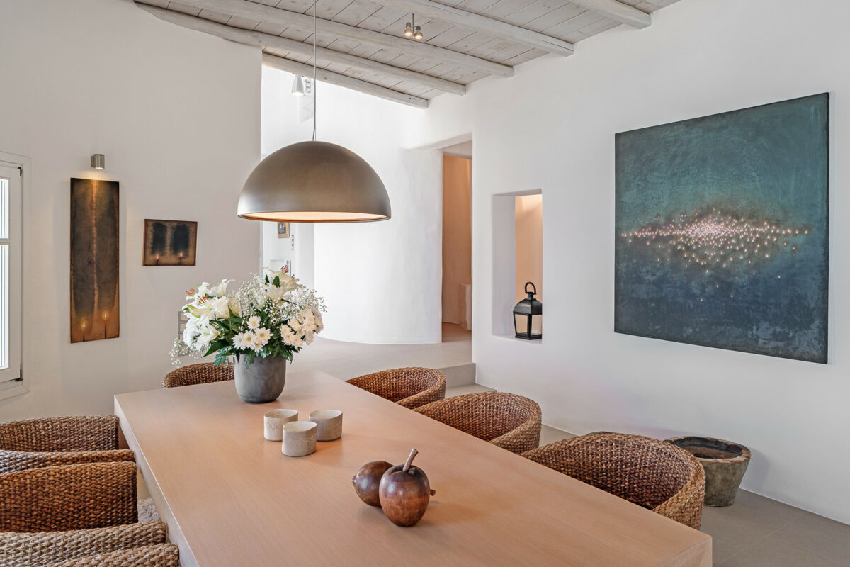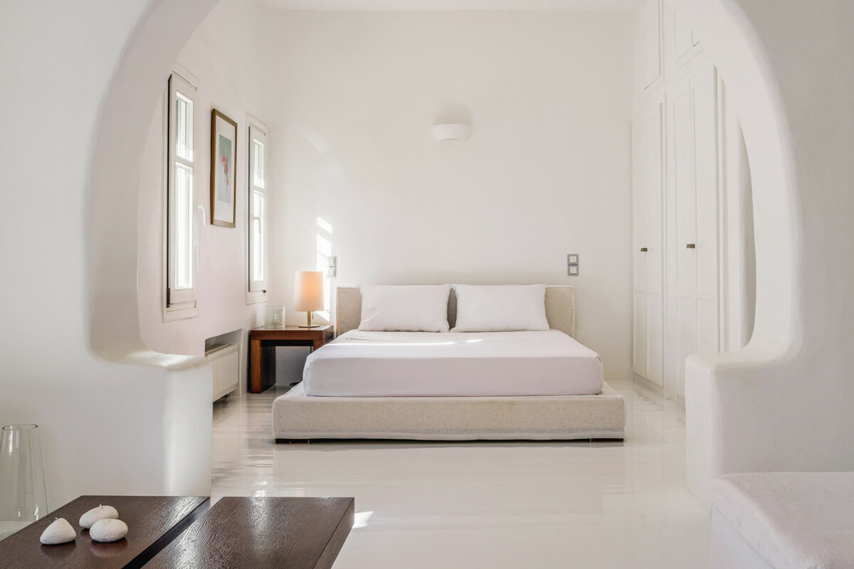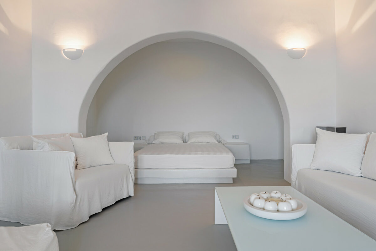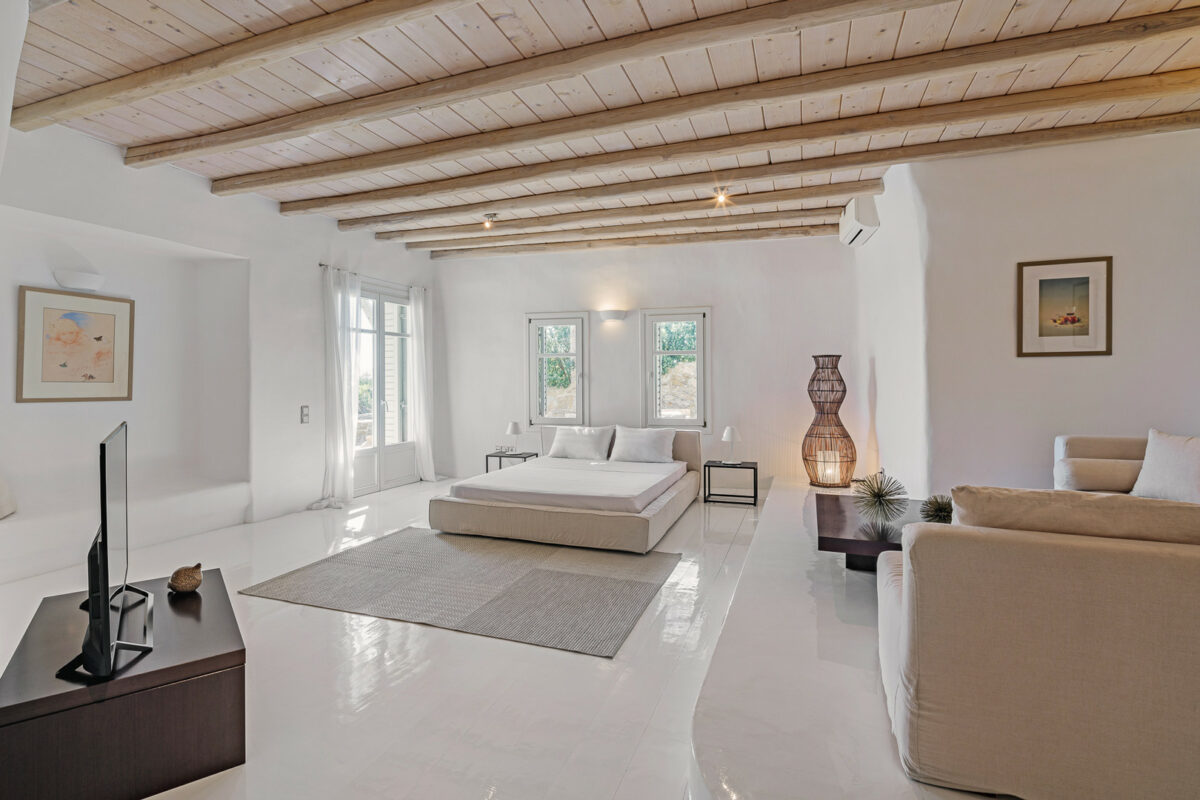 The property's design embraces the traditional Cycladic style with a modern twist, the combination of white plaster, wooden casings and ceilings, and cement mortar for the floors and bathrooms creates a cool and refreshing atmosphere. The minimalistic furniture and decor add to the overall ambiance, immersing guests in the charm of the Cycladic environment.