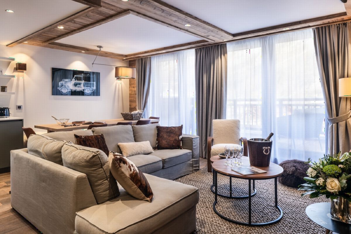 Décoré avec un revêtement en bois traditionnel, un mobilier confortable et un style général élégant, cet espace représente un véritable chez-soi alpin pour se reposer après une journée sur les pistes. Son agencement décloisonné garantit qu'il y a suffisamment d'espace pour que tout le groupe puisse se détendre ensemble, tout en étant suffisamment proche pour créer une atmosphère chaleureuse et familiale.