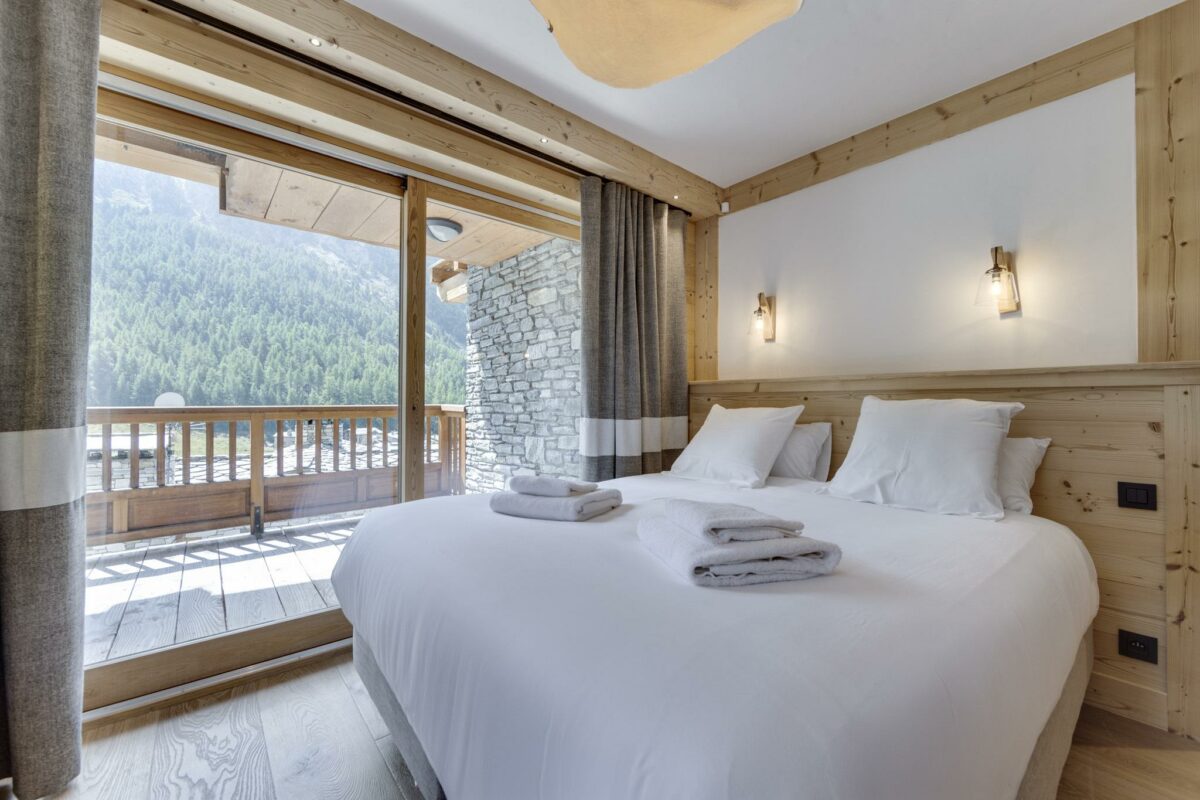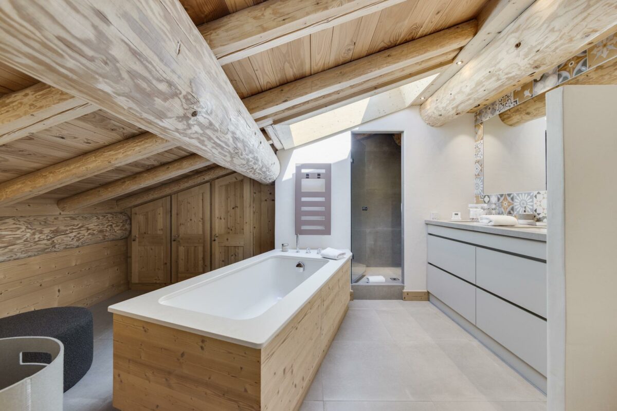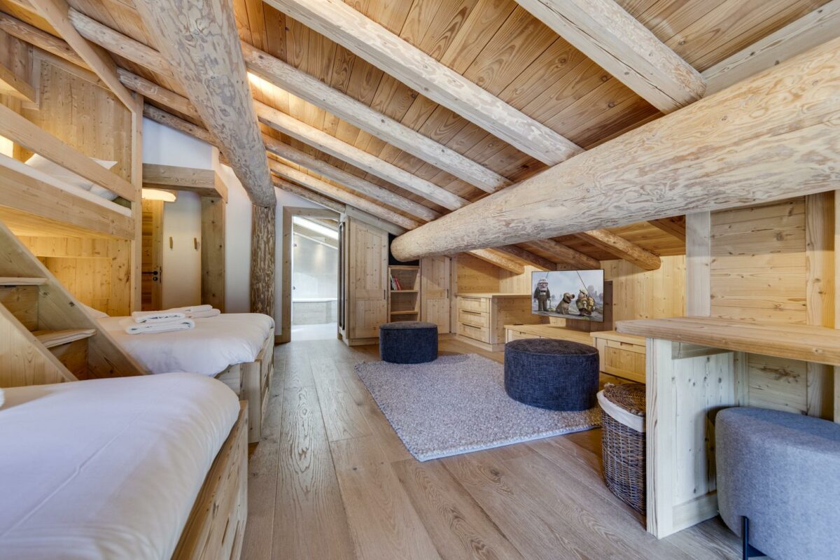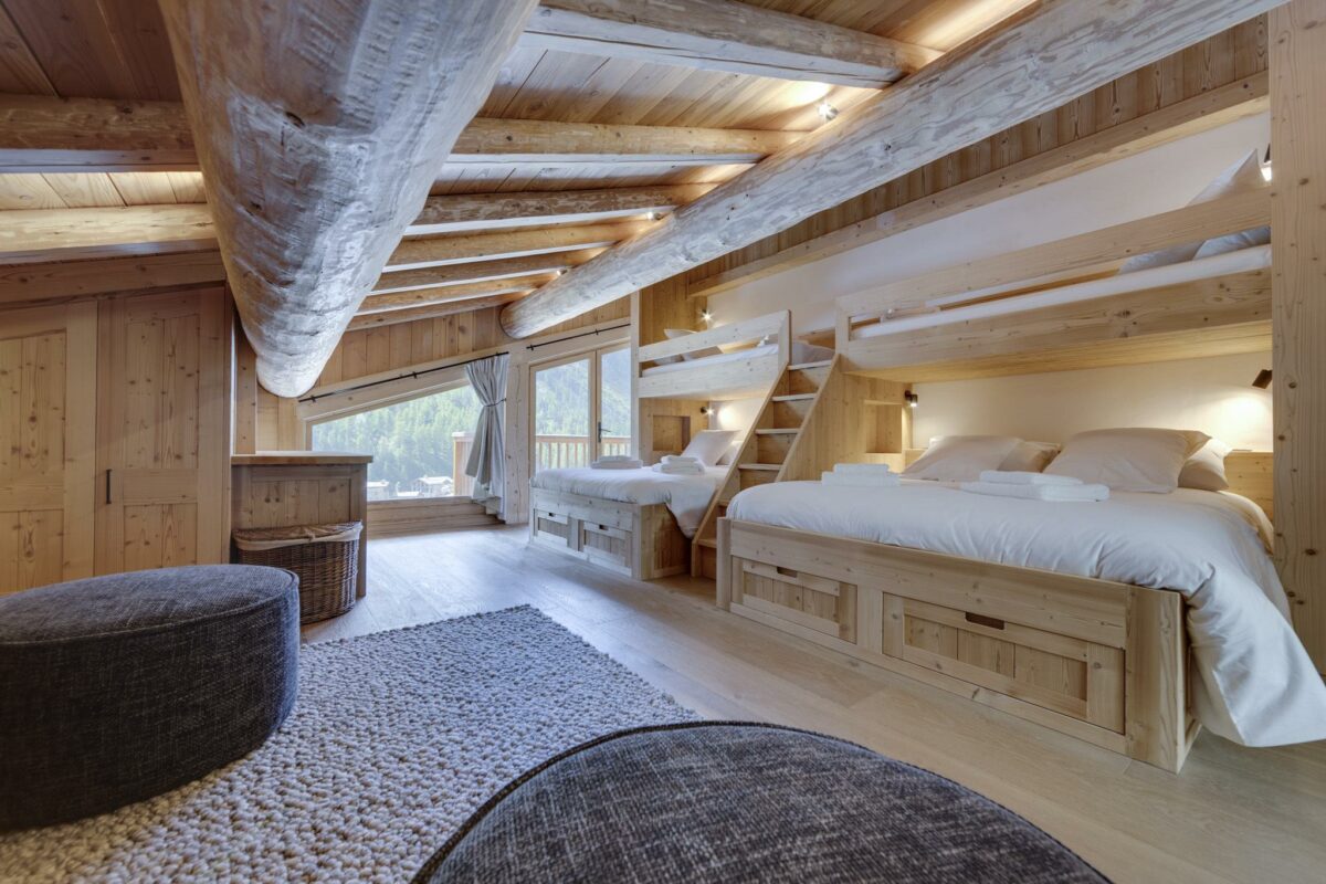 The sleeping area is spread over two floors. On the ground floor there are two double bedrooms with en suite bathrooms. The upper floor houses a master suite as well as a large family room, capable of accommodating six people. The latter offers a breathtaking view and has, surprisingly, the highest balcony in Val d’Isère!