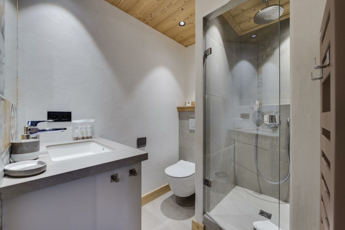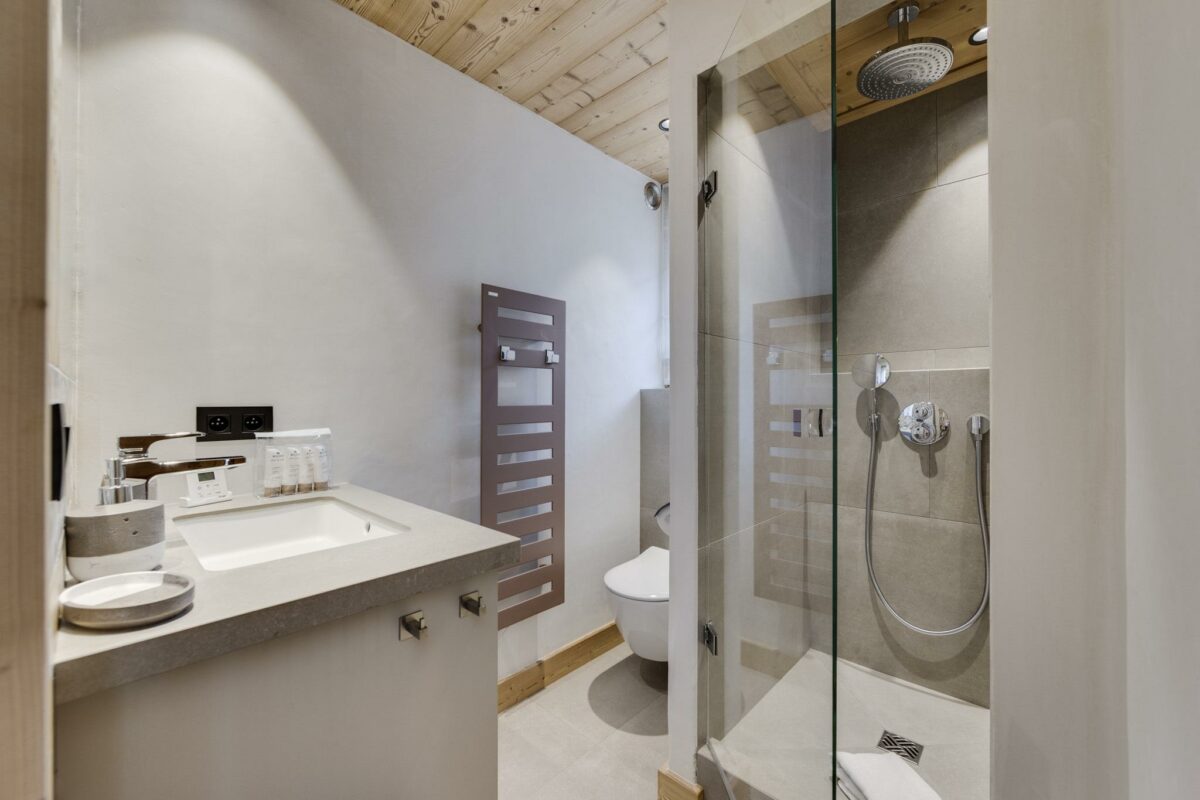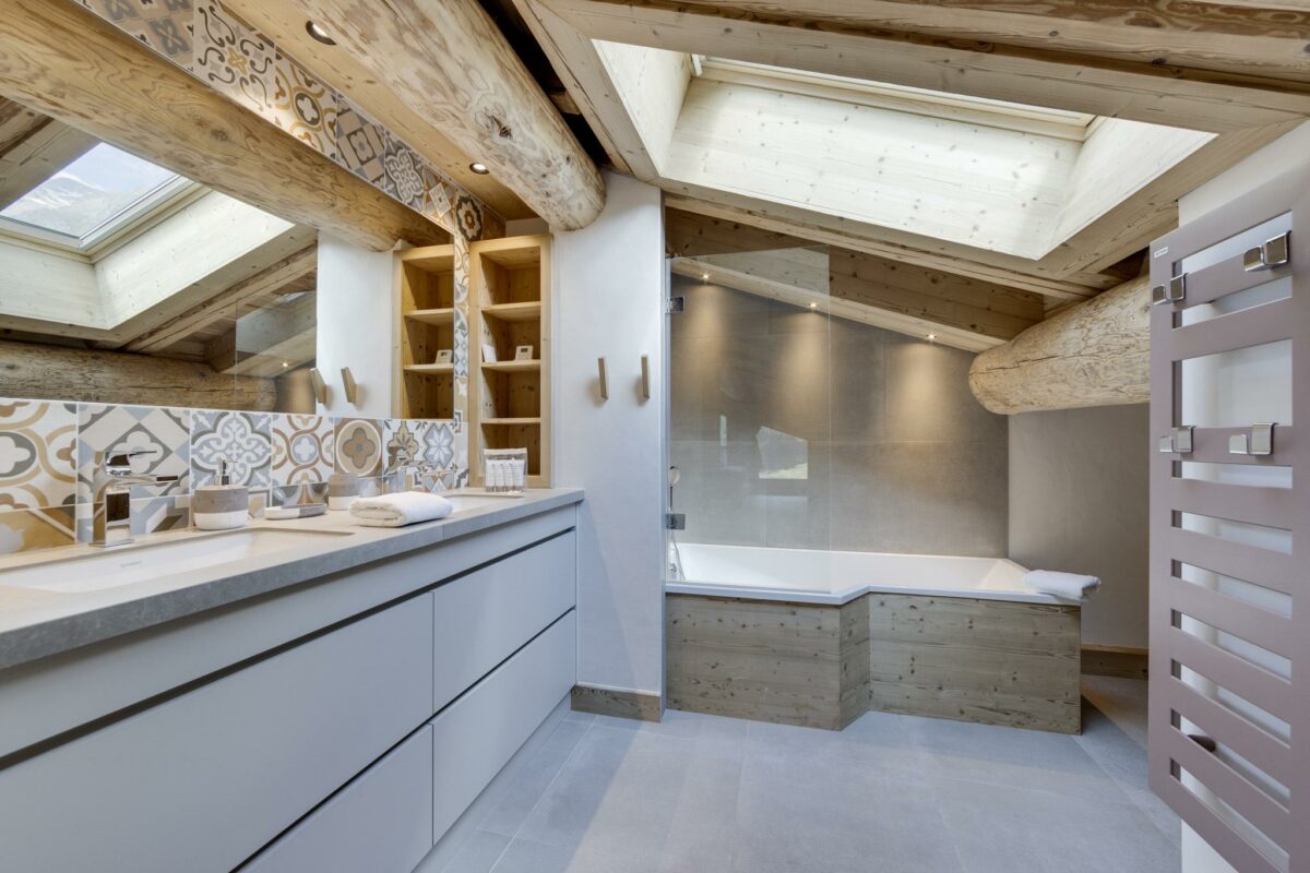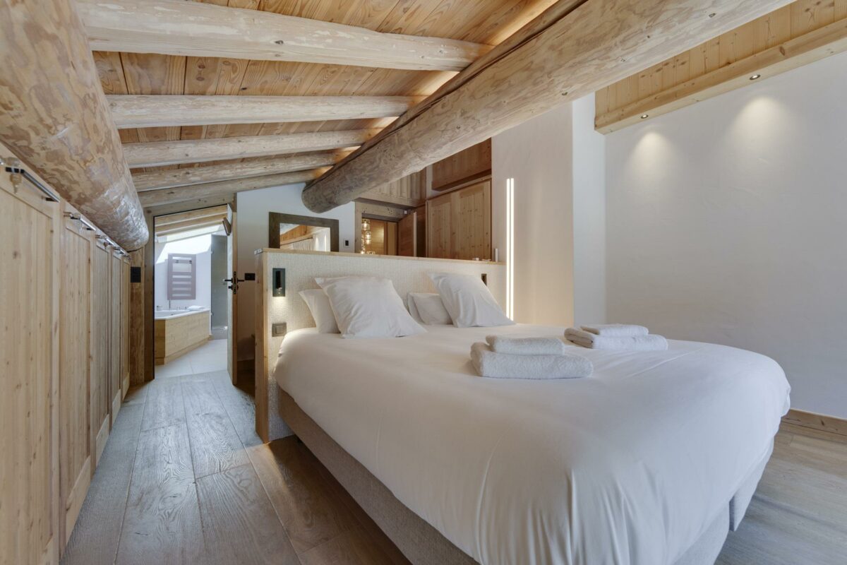 The sleeping area is spread over two floors. On the ground floor there are two double bedrooms with en suite bathrooms. The upper floor houses a master suite as well as a large family room, capable of accommodating six people. The latter offers a breathtaking view and has, surprisingly, the highest balcony in Val d’Isère!