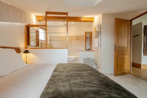 > Chambre n°1 : Lit double (160cm), salle de bain ouverte