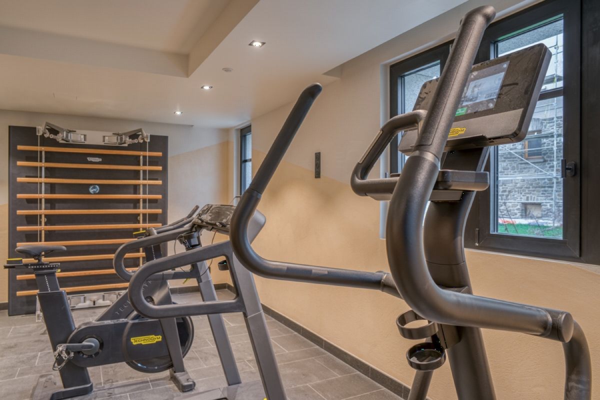 > Gym equipped with 4 machines: a treadmill, an elliptical