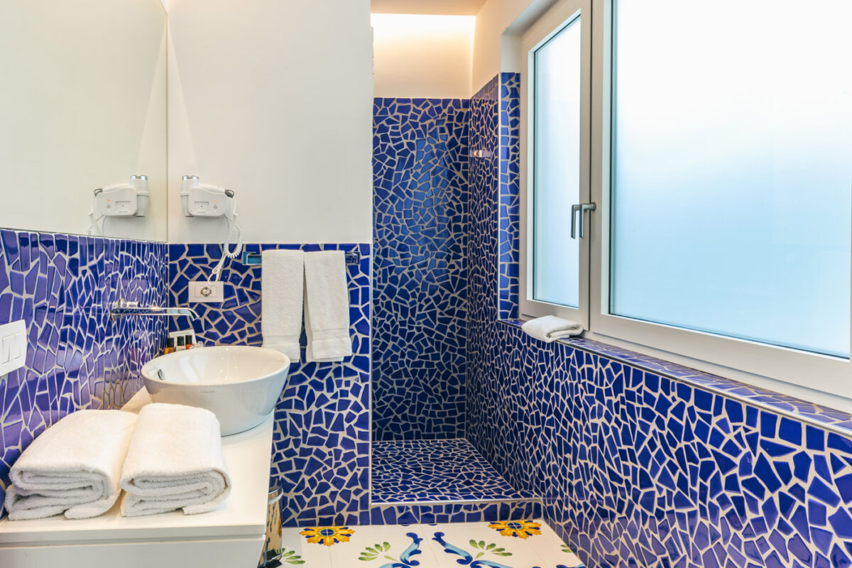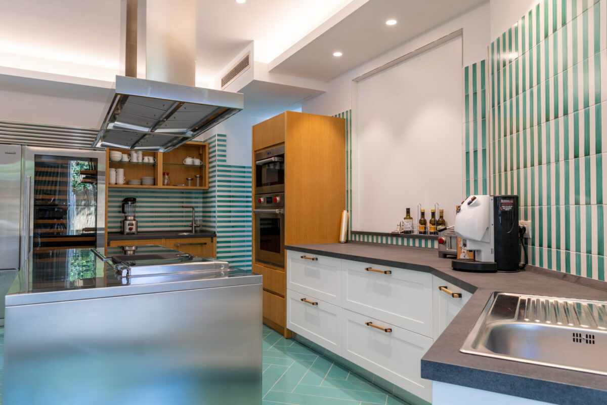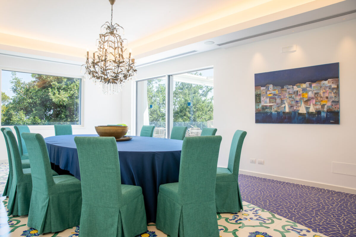 The spacious modern and colorful living room and the expansive dining room are inviting and perfectly furnished for entertaining. The multitude of large windows create an atmosphere that feels open and airy. Besides the high-end materials used, such as marble floors, beautiful original railing along the staircase, vivacious hand painted Vietri ceramic tiles, luxurious fabrics, many extra steps were taken in designing the perfect vacation villa that exudes style and elegance. A timeless professional kitchen filled with contemporary elements offers the perfect toolset and the ideal white canvas to inspire the Master Chef in you, or the chef to hire! Enjoy the villa's private swimming pool with a lounge area and sun deck, as well as a spotless manicured garden where you can relax. The furnished panoramic terrace and several balconies offer great views of the Gulf and Mt. Vesuvius.