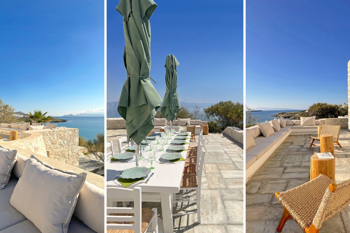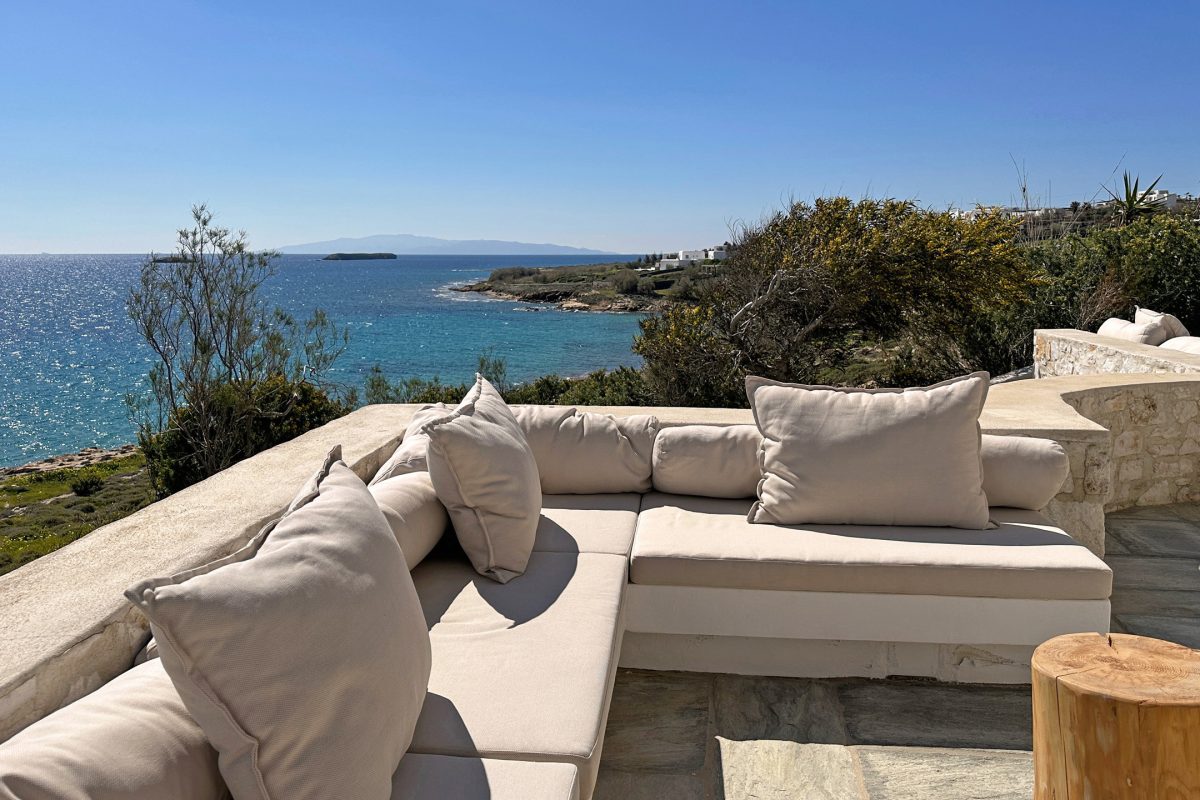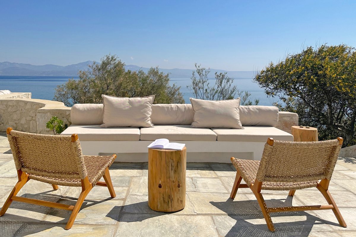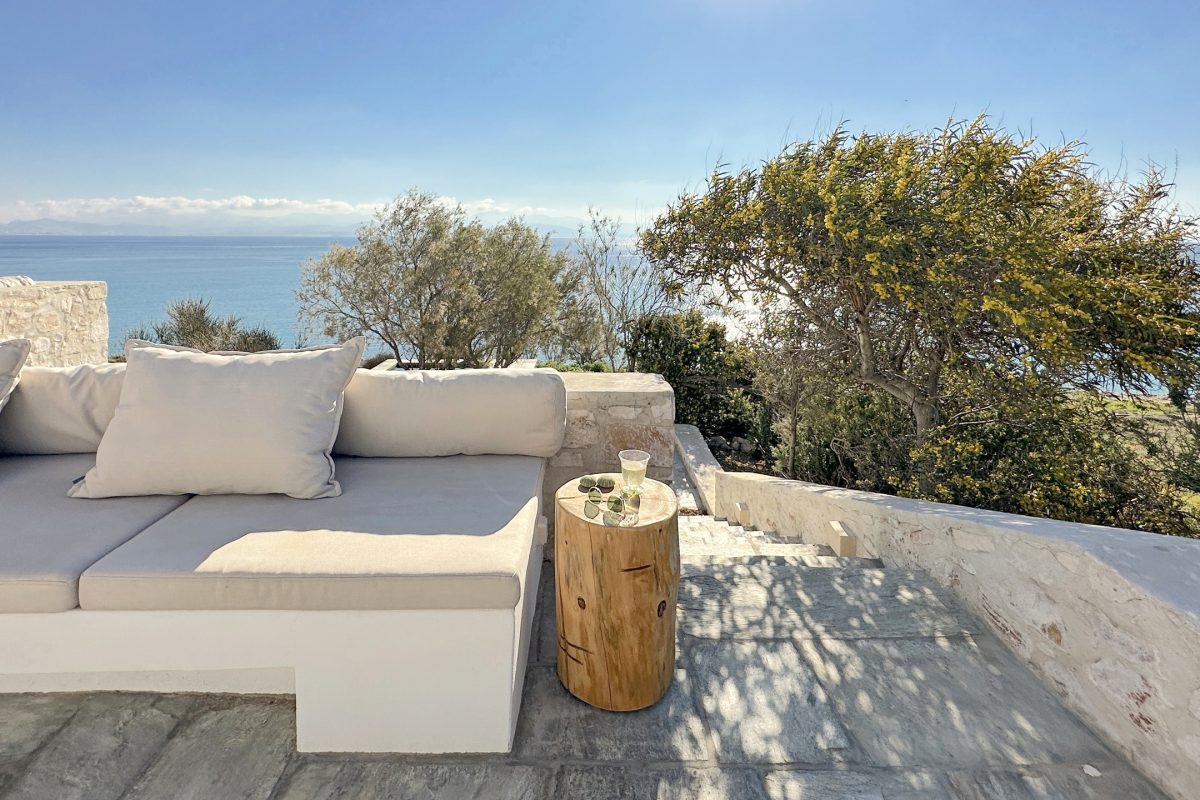 The outdoor spaces are thoughtfully designed and optimized to make the most of the unparalleled views. Comfortable sofas and cushions are arranged for relaxing in the sun with the sea as a stunning backdrop, alongside a shaded dining area under two large umbrellas. Adding to the charm is a small pool nestled by the sea, almost hidden among the rocks, offering the perfect spot to unwind with an aperitif.