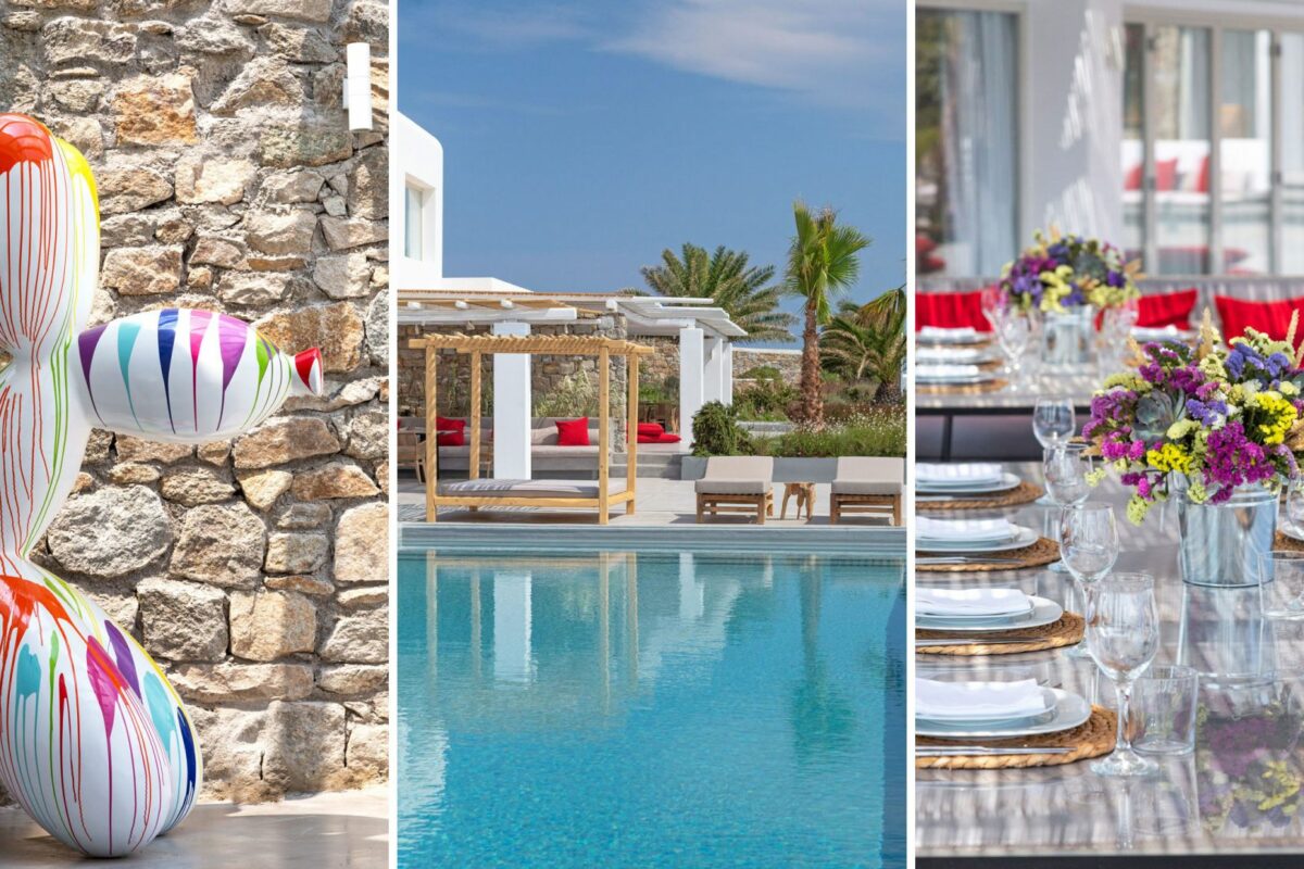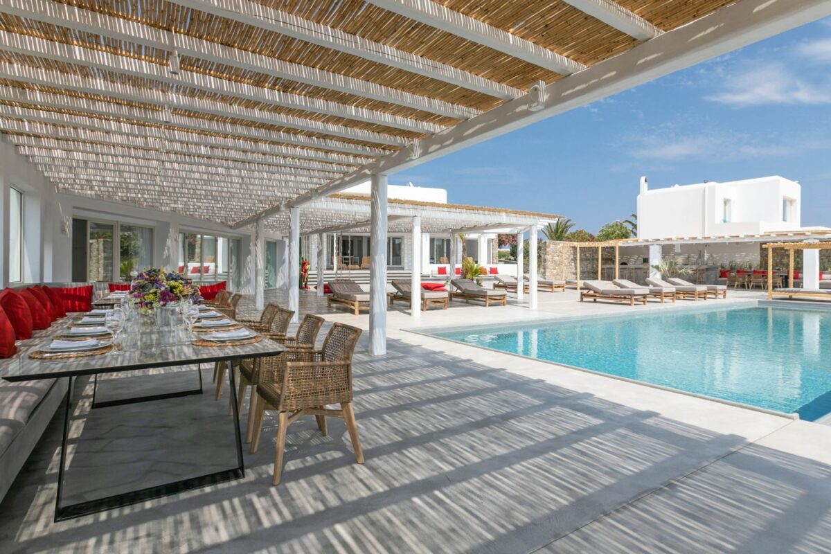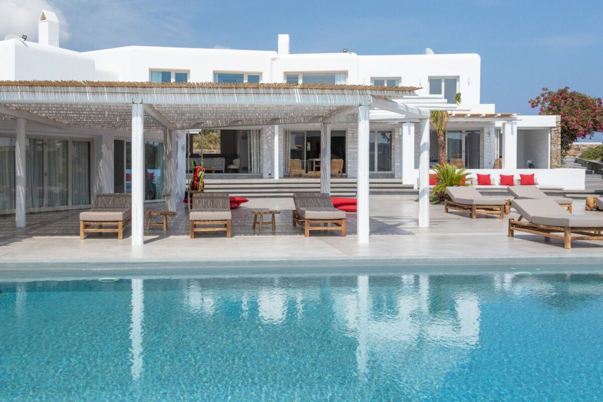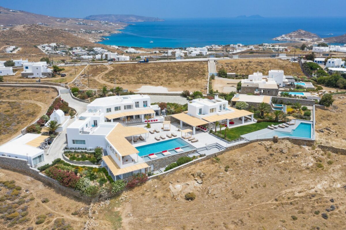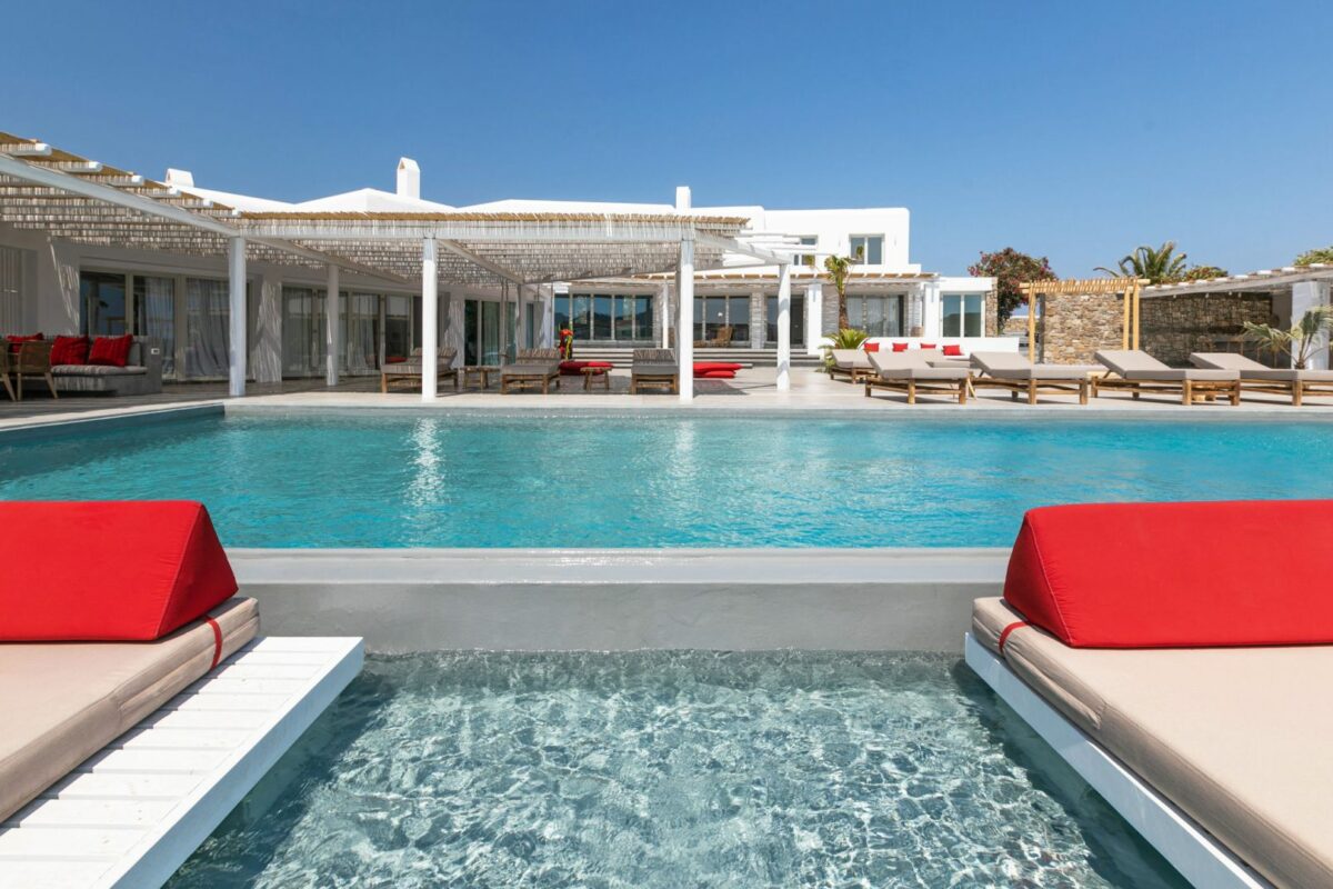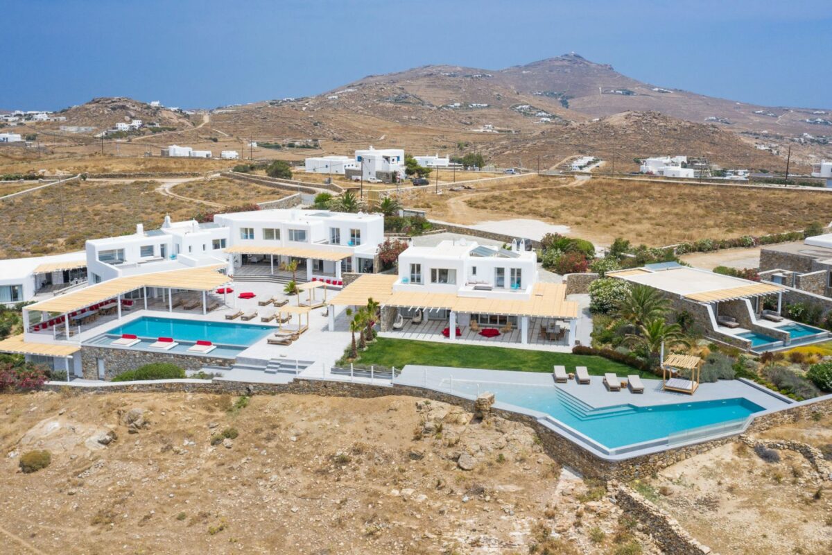 The Villa is one of the largest private properties available for rent on Mykonos. Combining a location with access to a handful of beaches, copious amounts of outdoor space, 2 swimming pools and 20 bedrooms it represents the ultimate retreat for a large family reunion, a grand celebration or just a simple relaxing holiday for numerous groups. The estate overlooks Kalo Livadi, a bay on the map of anyone who likes a great beach club experience at one of the island's iconic spots.