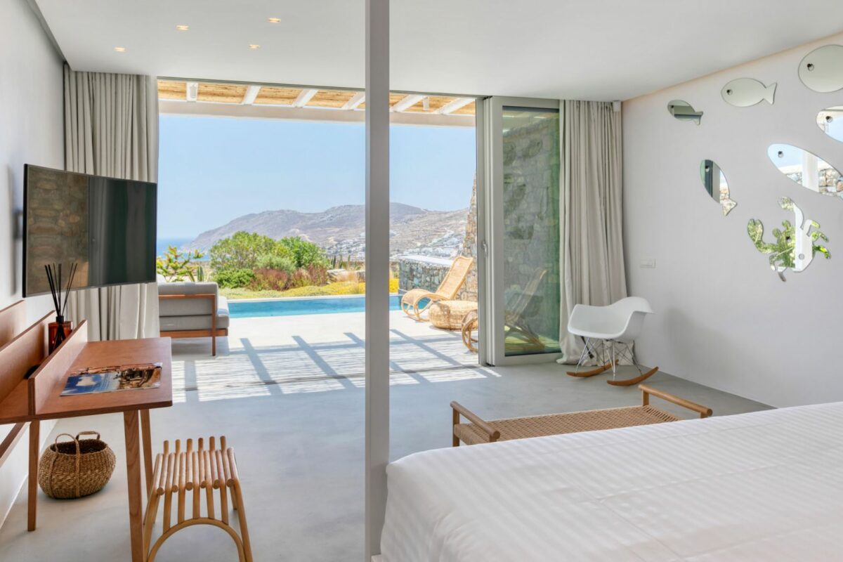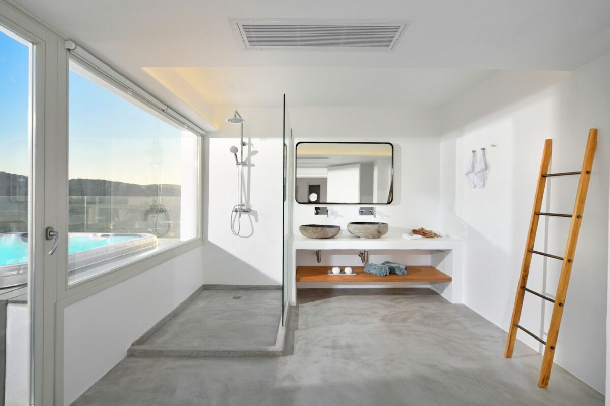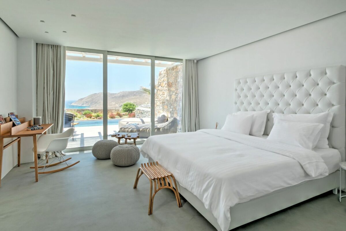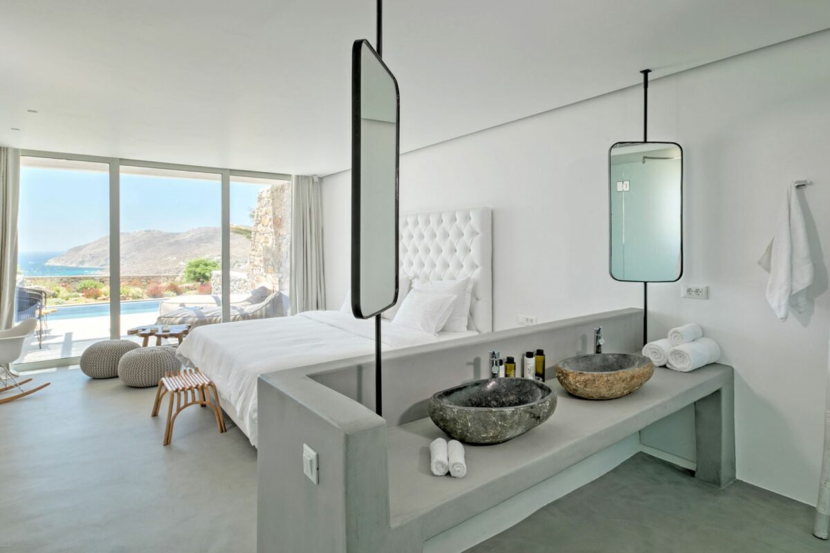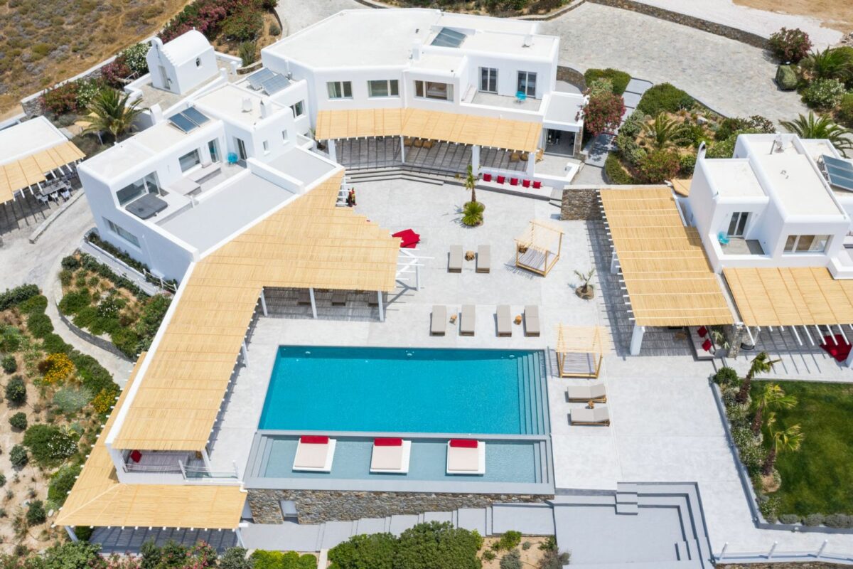 The 20 bedrooms are approximately split evenly between the three main units + 2 bungalows + 2 pools suite. The overall decor of the estate is tasteful with a minimal approach and a visible respect for the typical Cycladic architecture. Each unit has its own dedicated living room and as with all summer residences, they each open up onto the pool terraces. Thanks to its 2016 inauguration the estate features all modern amenities throughout, including a few unique ones like the aforementioned professional kitchen or micro-wave WiFi connection.