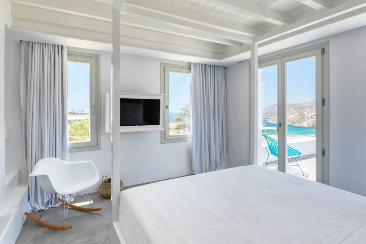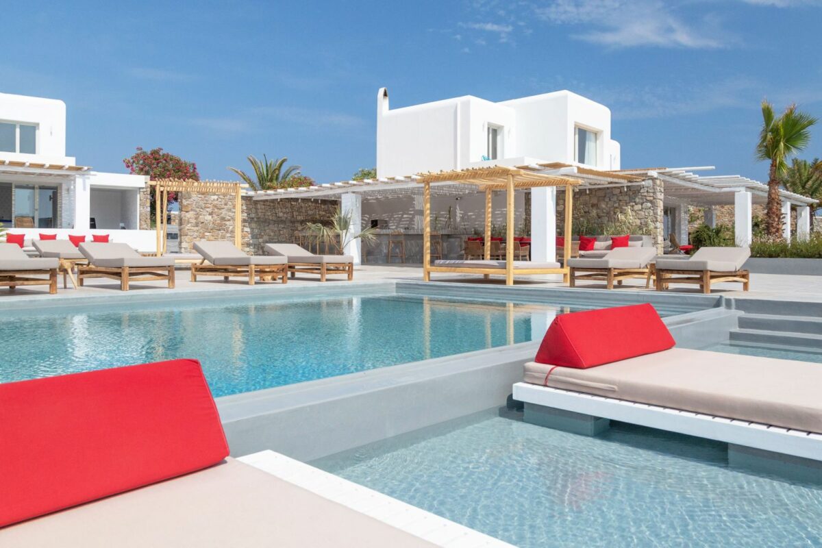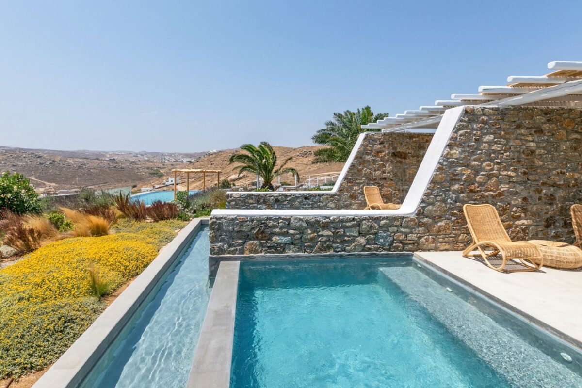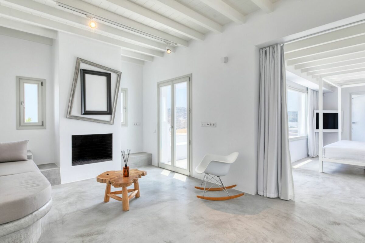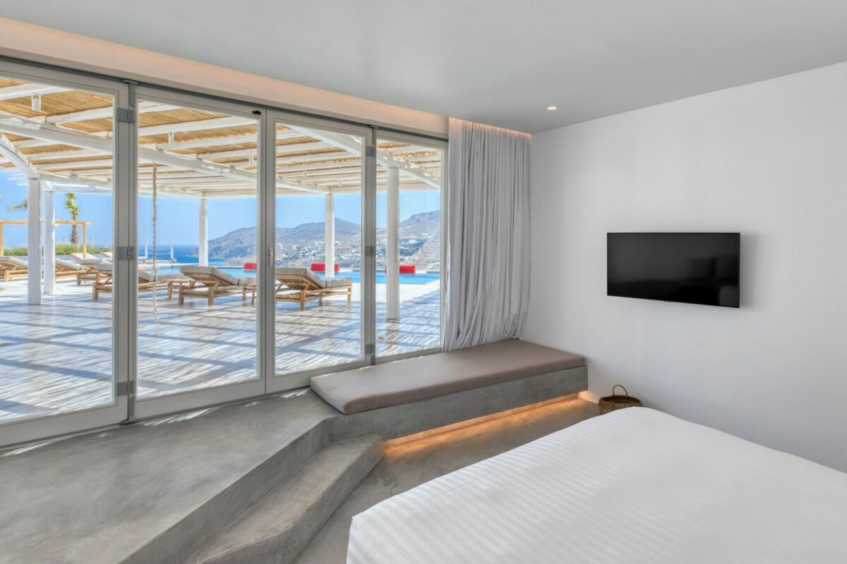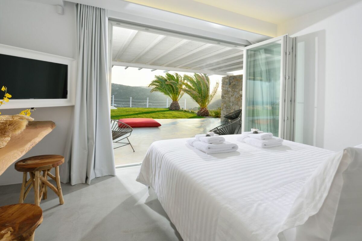 The 20 bedrooms are approximately split evenly between the three main units + 2 bungalows + 2 pools suite. The overall decor of the estate is tasteful with a minimal approach and a visible respect for the typical Cycladic architecture. Each unit has its own dedicated living room and as with all summer residences, they each open up onto the pool terraces. Thanks to its 2016 inauguration the estate features all modern amenities throughout, including a few unique ones like the aforementioned professional kitchen or micro-wave WiFi connection.
