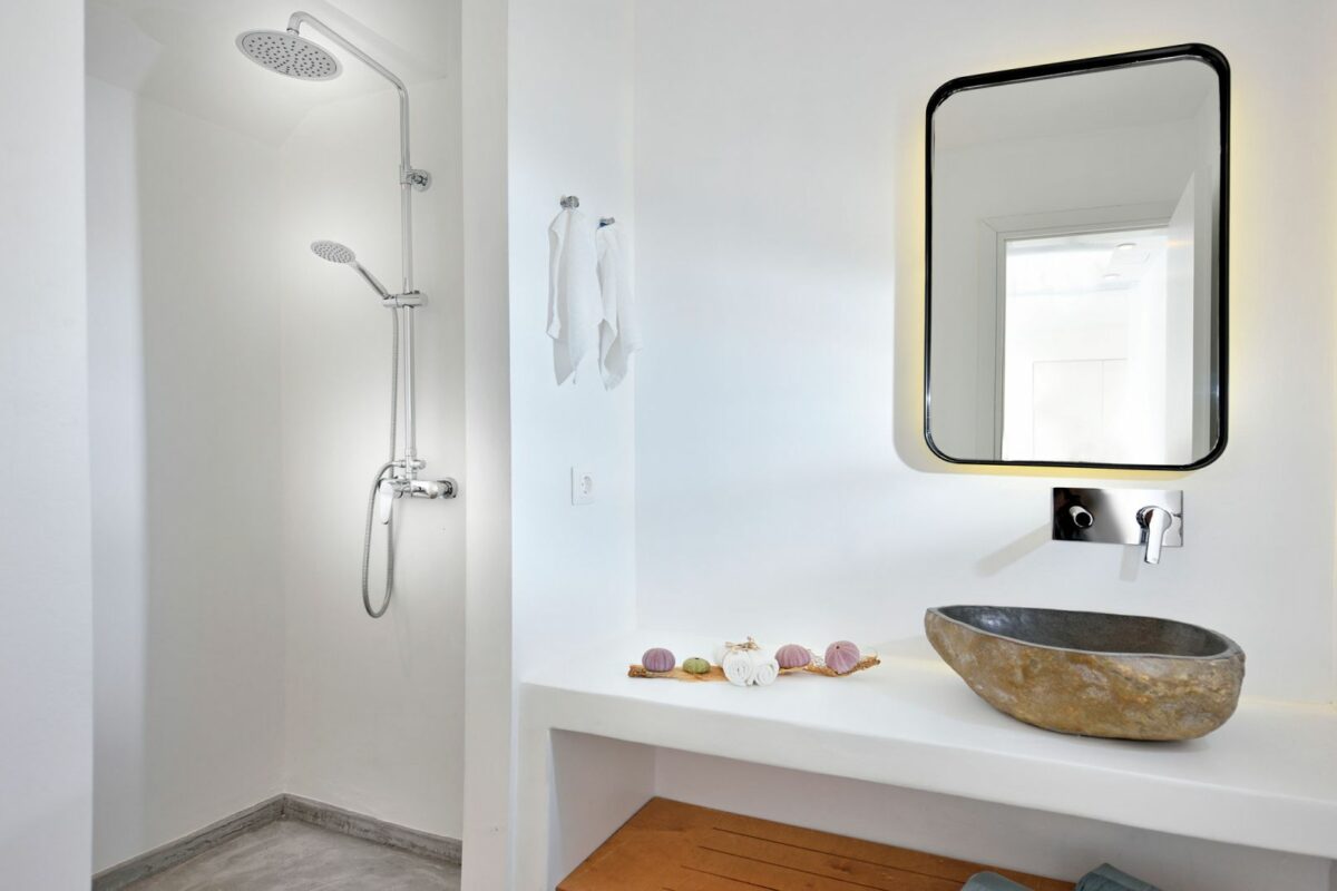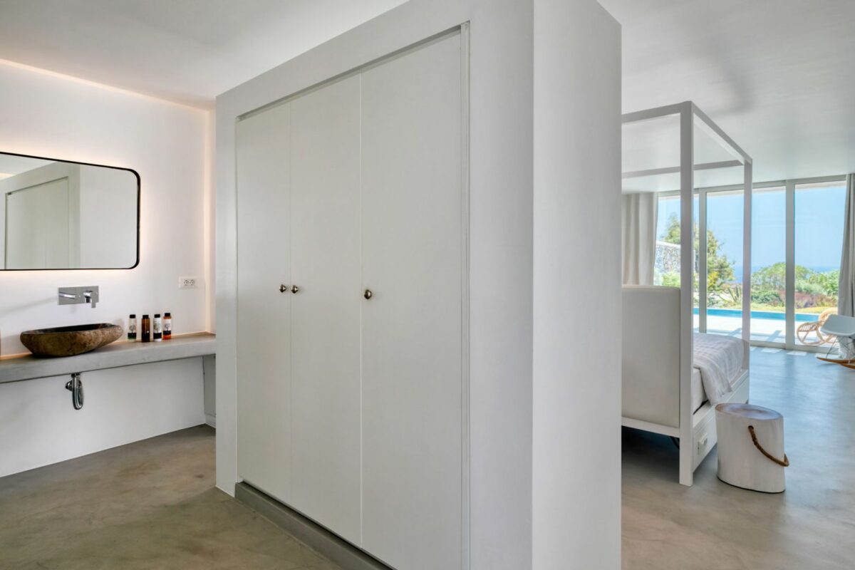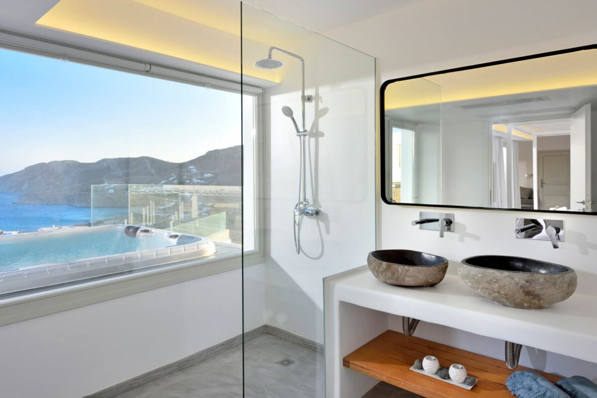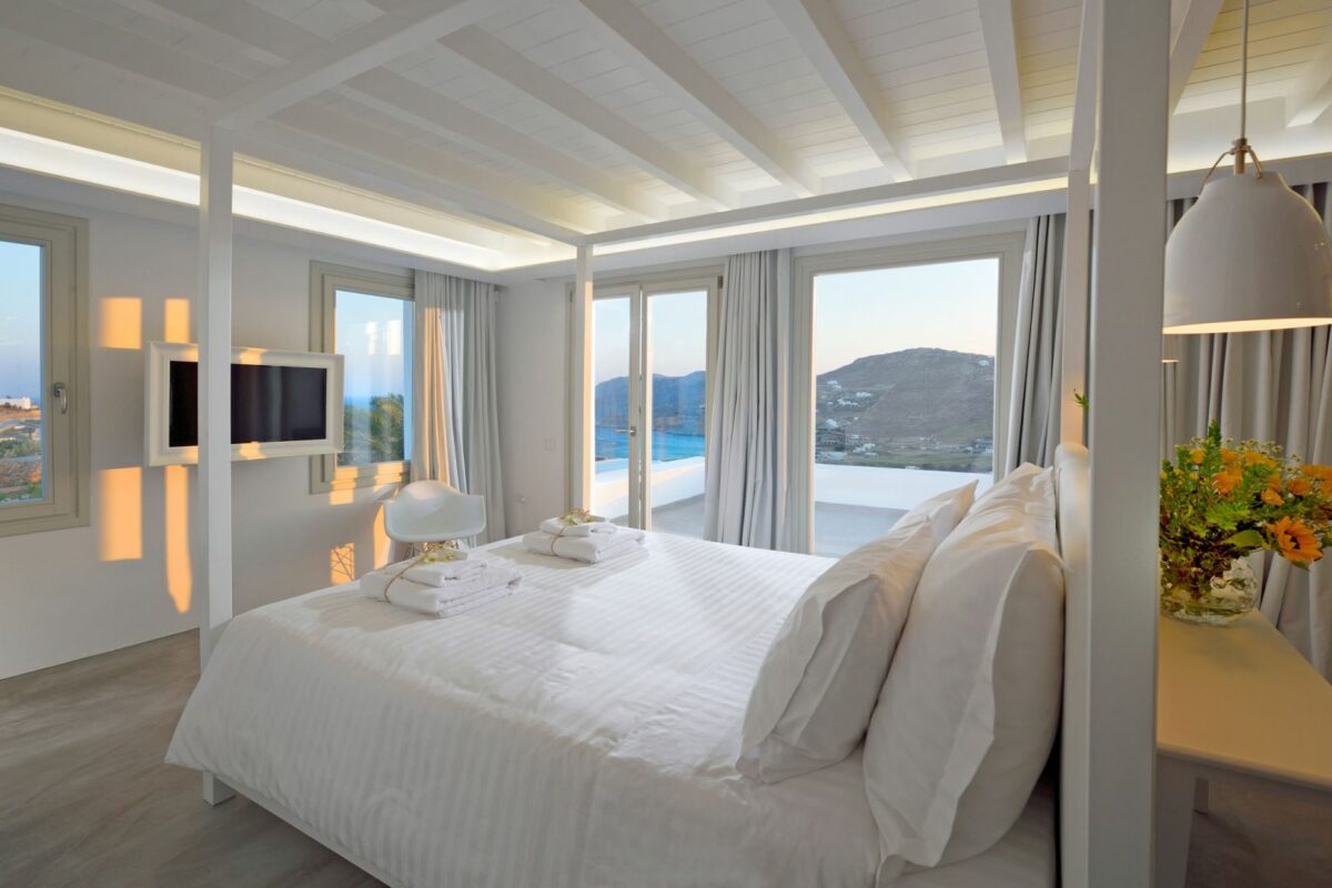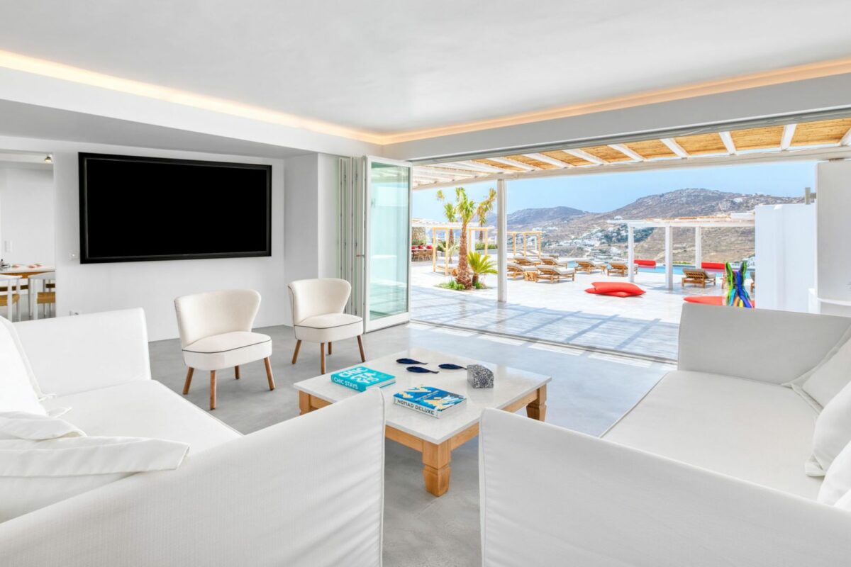 The 20 bedrooms are approximately split evenly between the three main units + 2 bungalows + 2 pools suite. The overall decor of the estate is tasteful with a minimal approach and a visible respect for the typical Cycladic architecture. Each unit has its own dedicated living room and as with all summer residences, they each open up onto the pool terraces. Thanks to its 2016 inauguration the estate features all modern amenities throughout, including a few unique ones like the aforementioned professional kitchen or micro-wave WiFi connection.