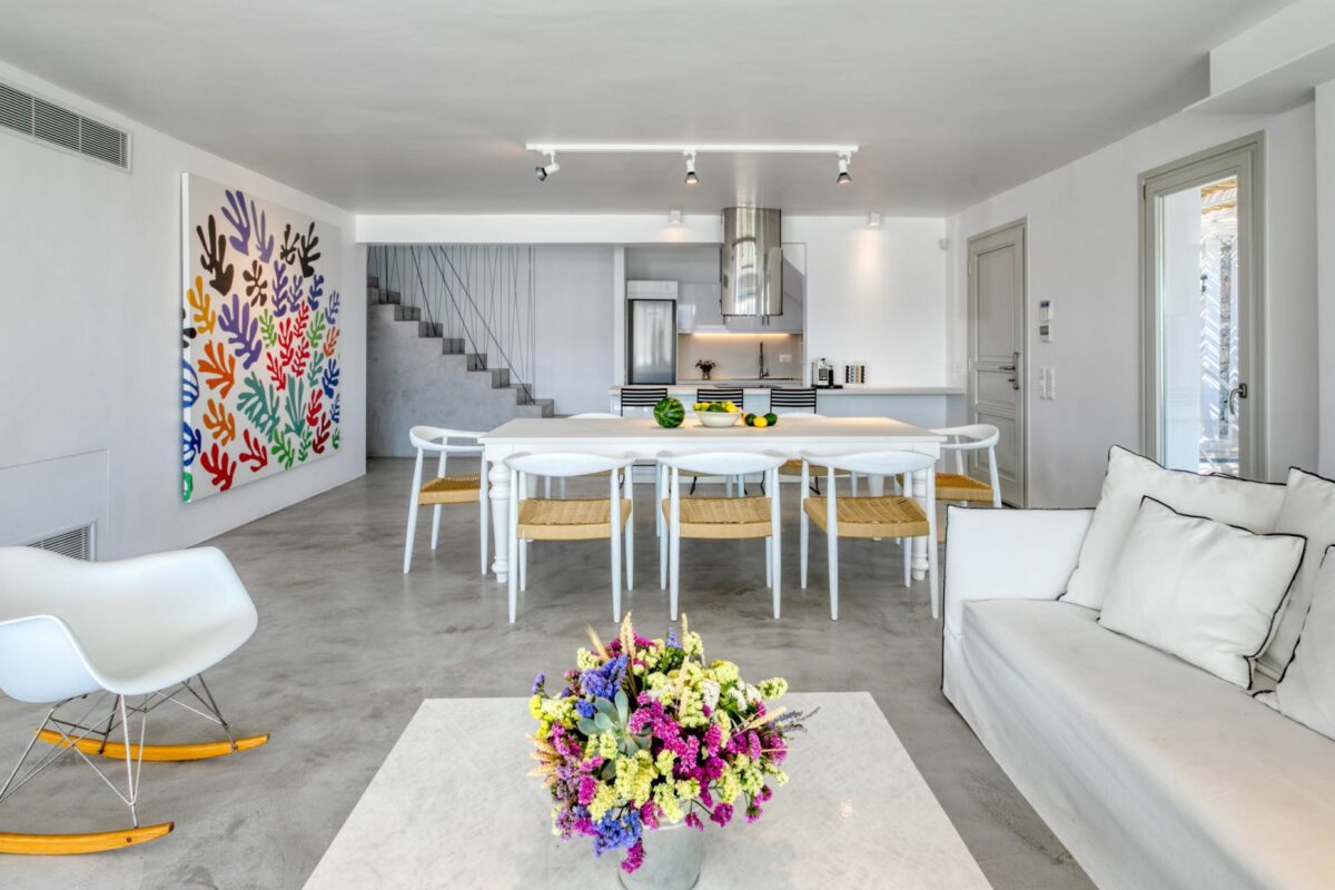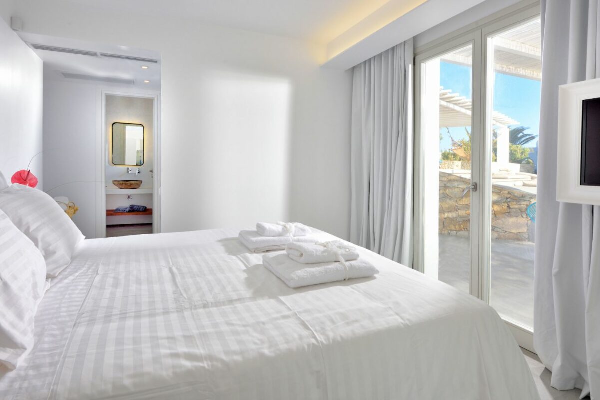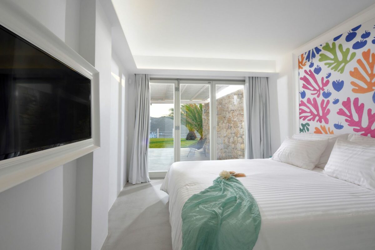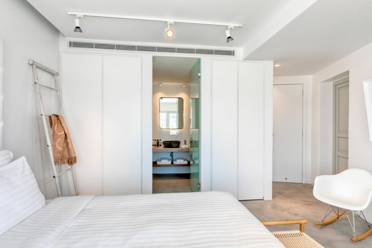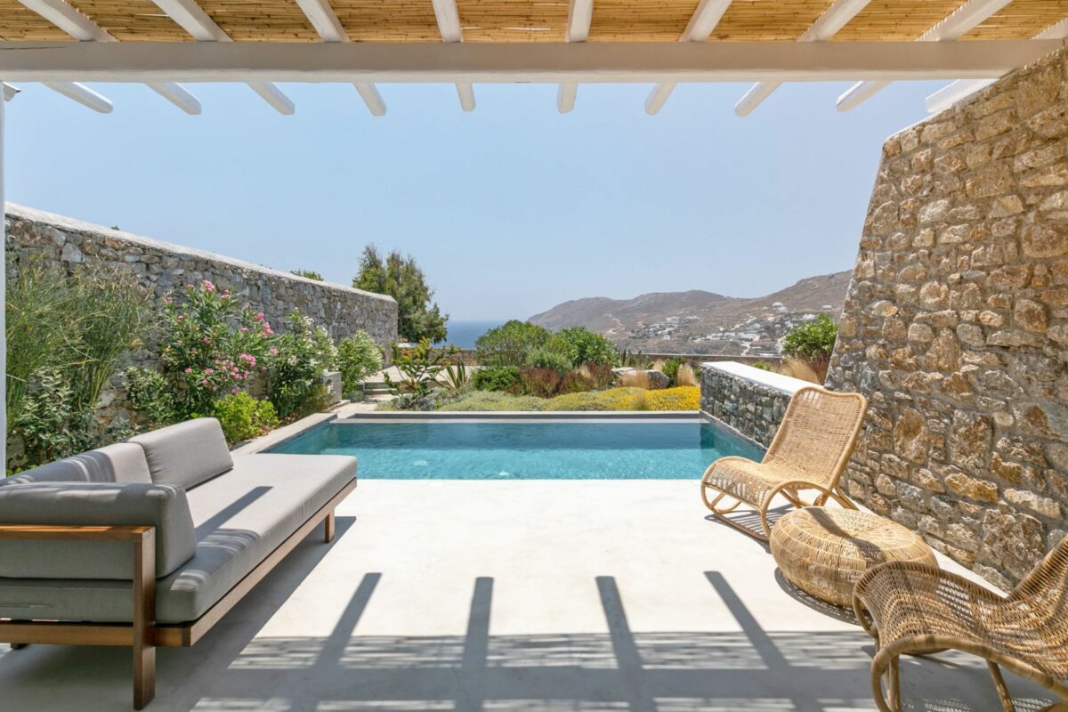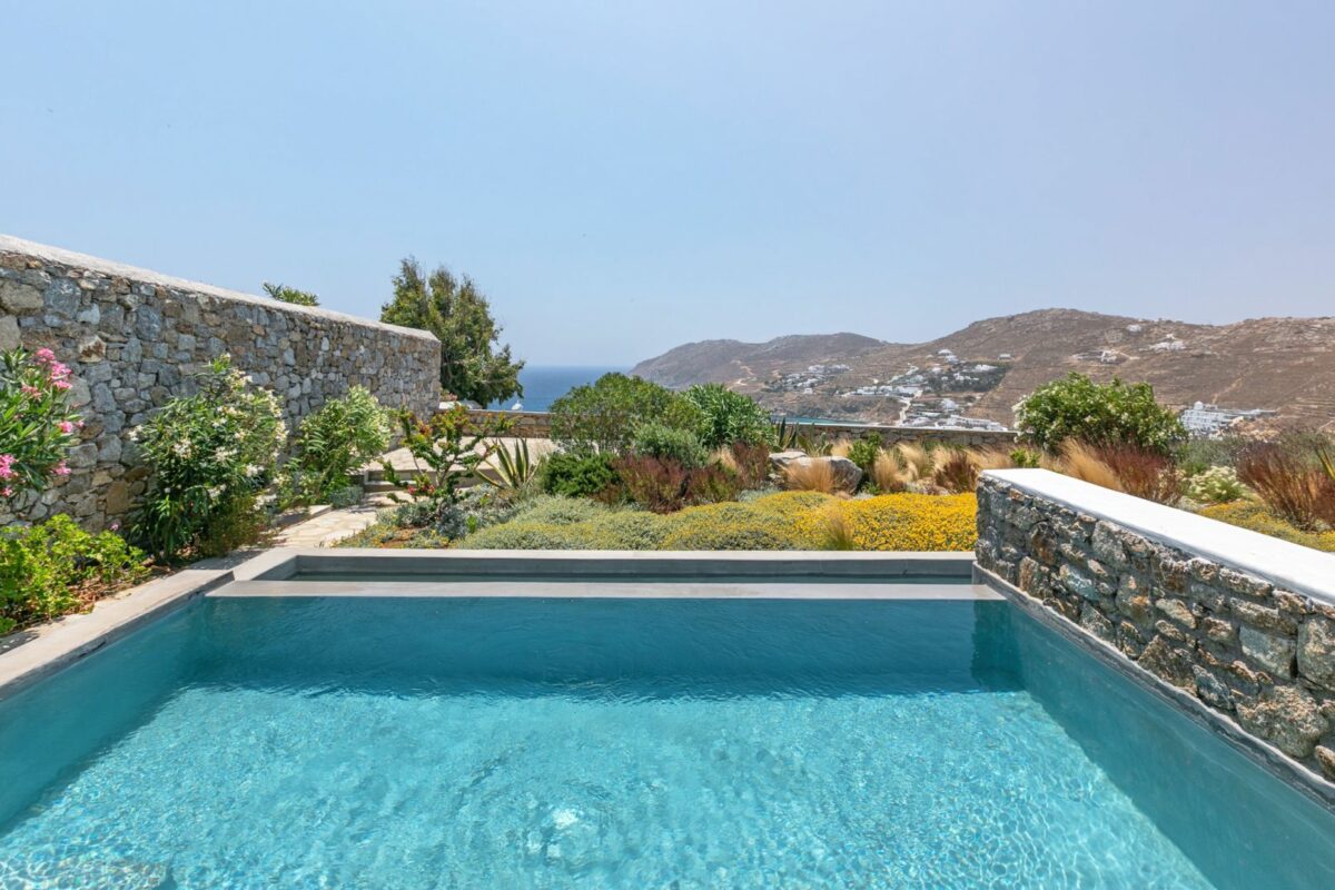 The 20 bedrooms are approximately split evenly between the three main units + 2 bungalows + 2 pools suite. The overall decor of the estate is tasteful with a minimal approach and a visible respect for the typical Cycladic architecture. Each unit has its own dedicated living room and as with all summer residences, they each open up onto the pool terraces. Thanks to its 2016 inauguration the estate features all modern amenities throughout, including a few unique ones like the aforementioned professional kitchen or micro-wave WiFi connection.