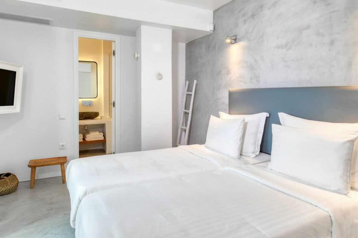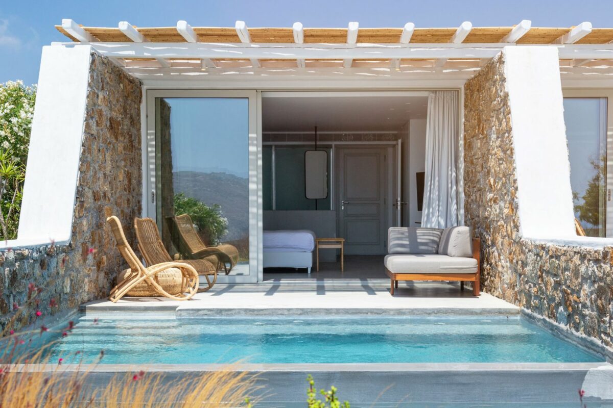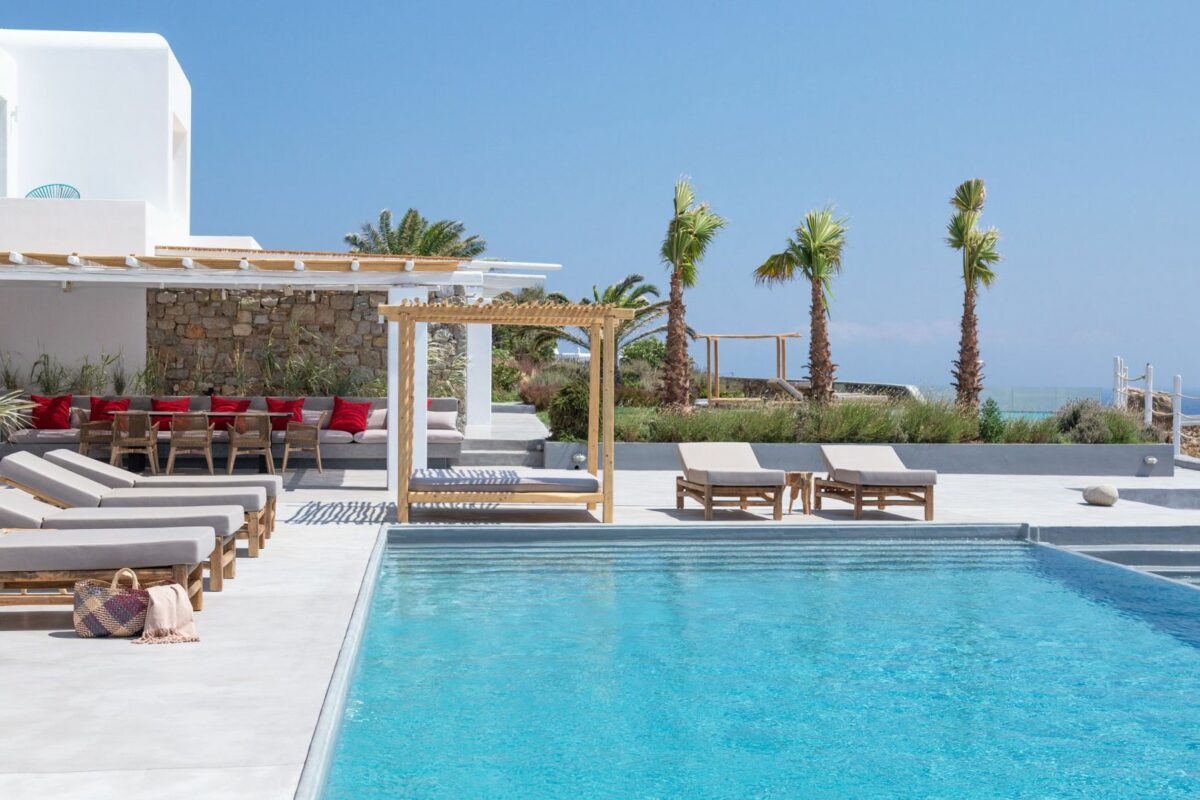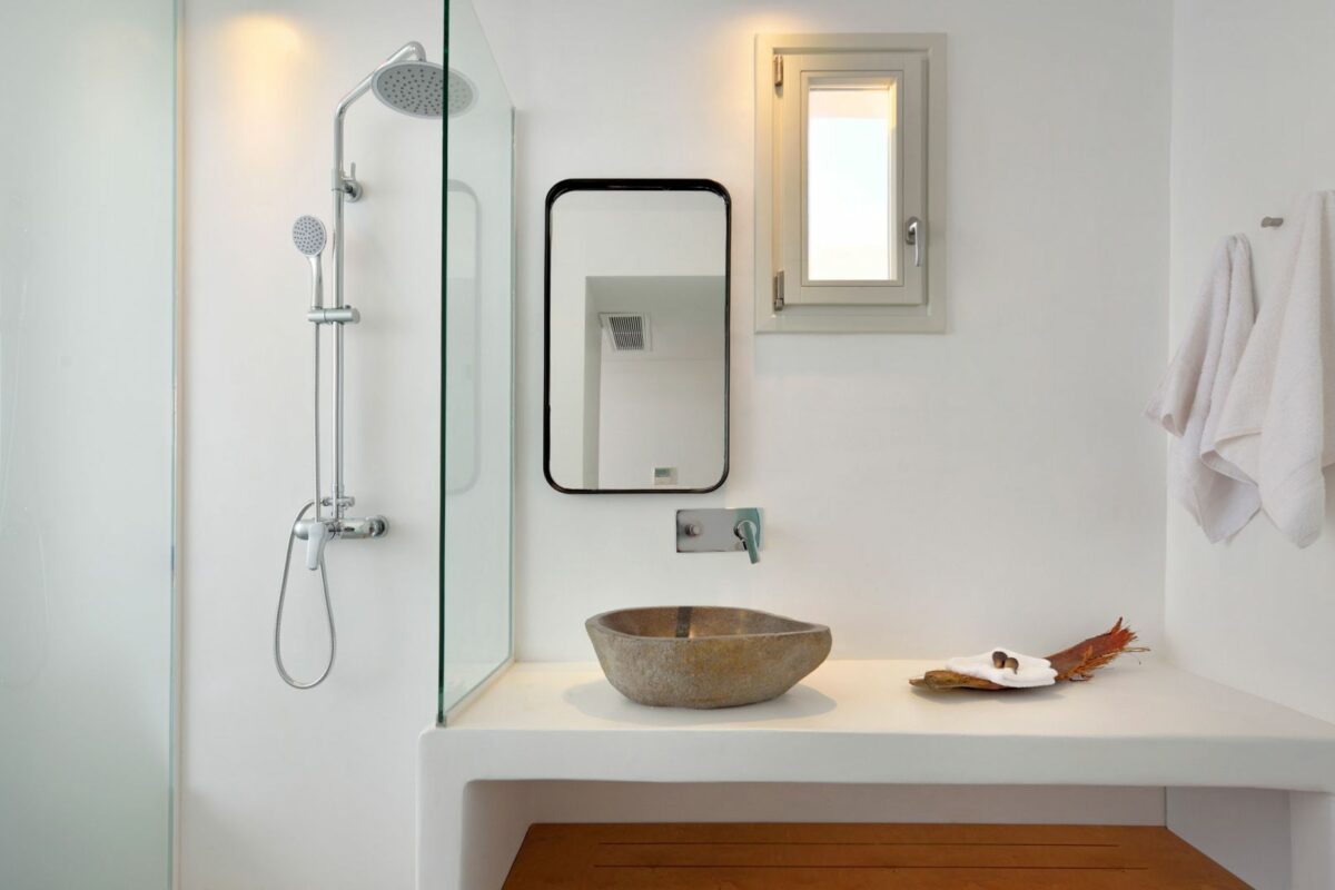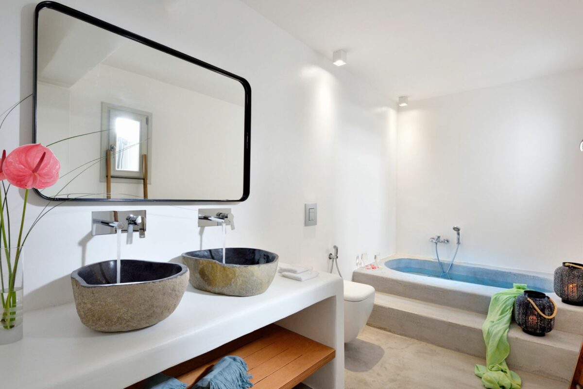 The 20 bedrooms are approximately split evenly between the three main units + 2 bungalows + 2 pools suite. The overall decor of the estate is tasteful with a minimal approach and a visible respect for the typical Cycladic architecture. Each unit has its own dedicated living room and as with all summer residences, they each open up onto the pool terraces. Thanks to its 2016 inauguration the estate features all modern amenities throughout, including a few unique ones like the aforementioned professional kitchen or micro-wave WiFi connection.