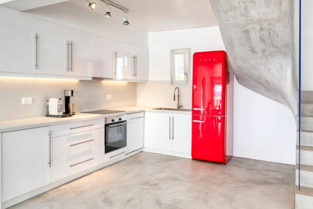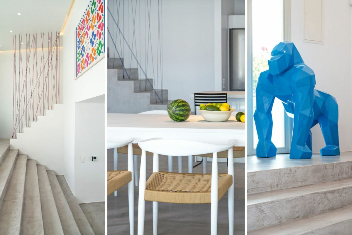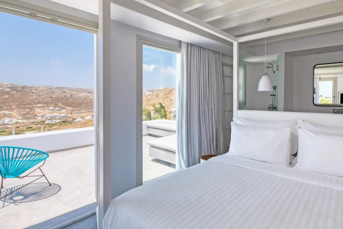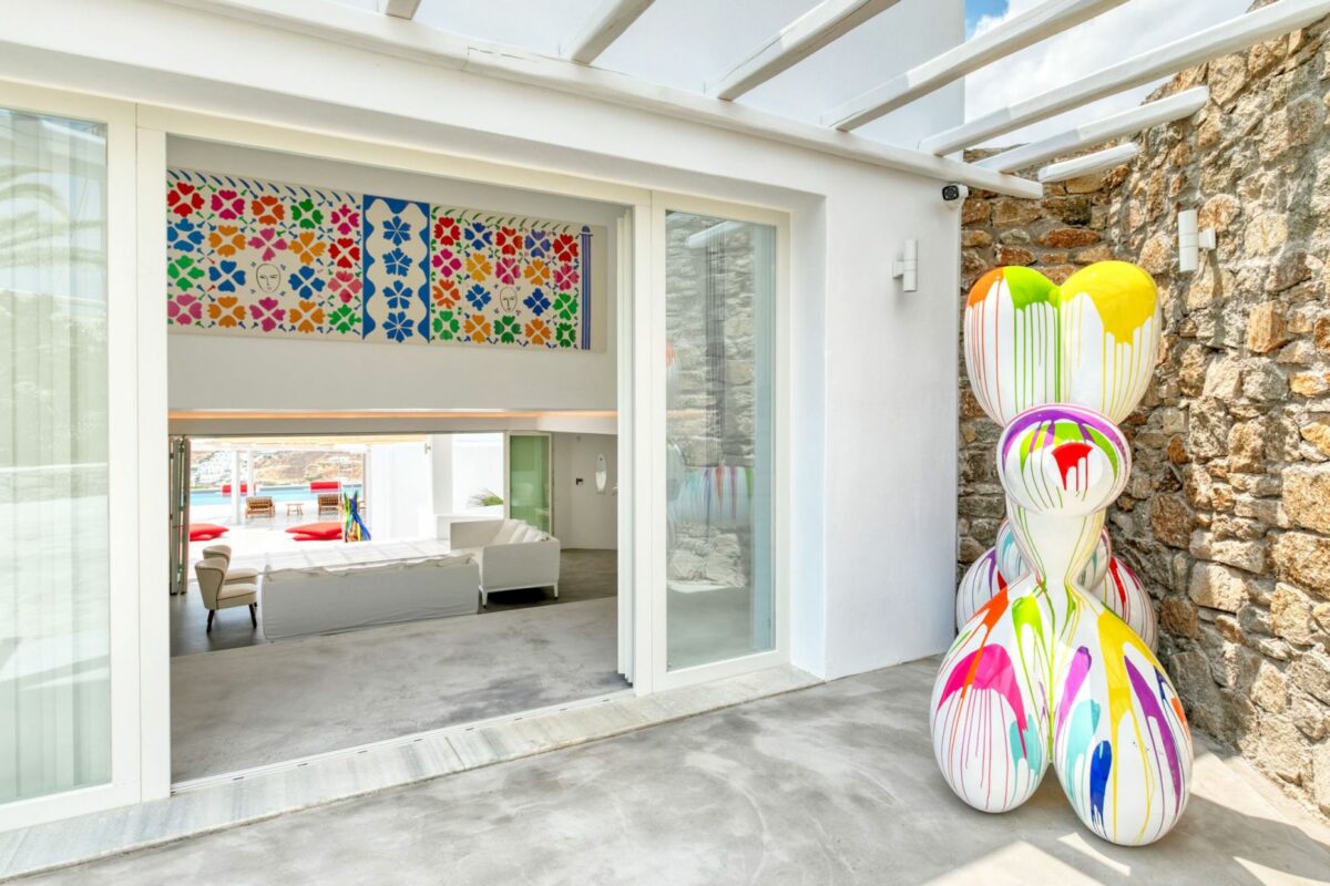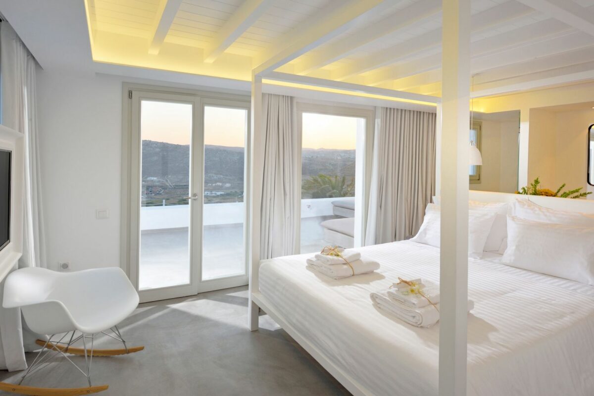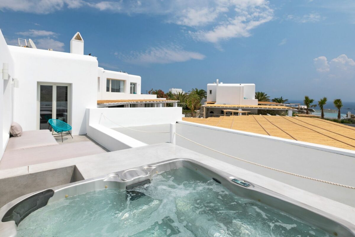 The 20 bedrooms are approximately split evenly between the three main units + 2 bungalows + 2 pools suite. The overall decor of the estate is tasteful with a minimal approach and a visible respect for the typical Cycladic architecture. Each unit has its own dedicated living room and as with all summer residences, they each open up onto the pool terraces. Thanks to its 2016 inauguration the estate features all modern amenities throughout, including a few unique ones like the aforementioned professional kitchen or micro-wave WiFi connection.