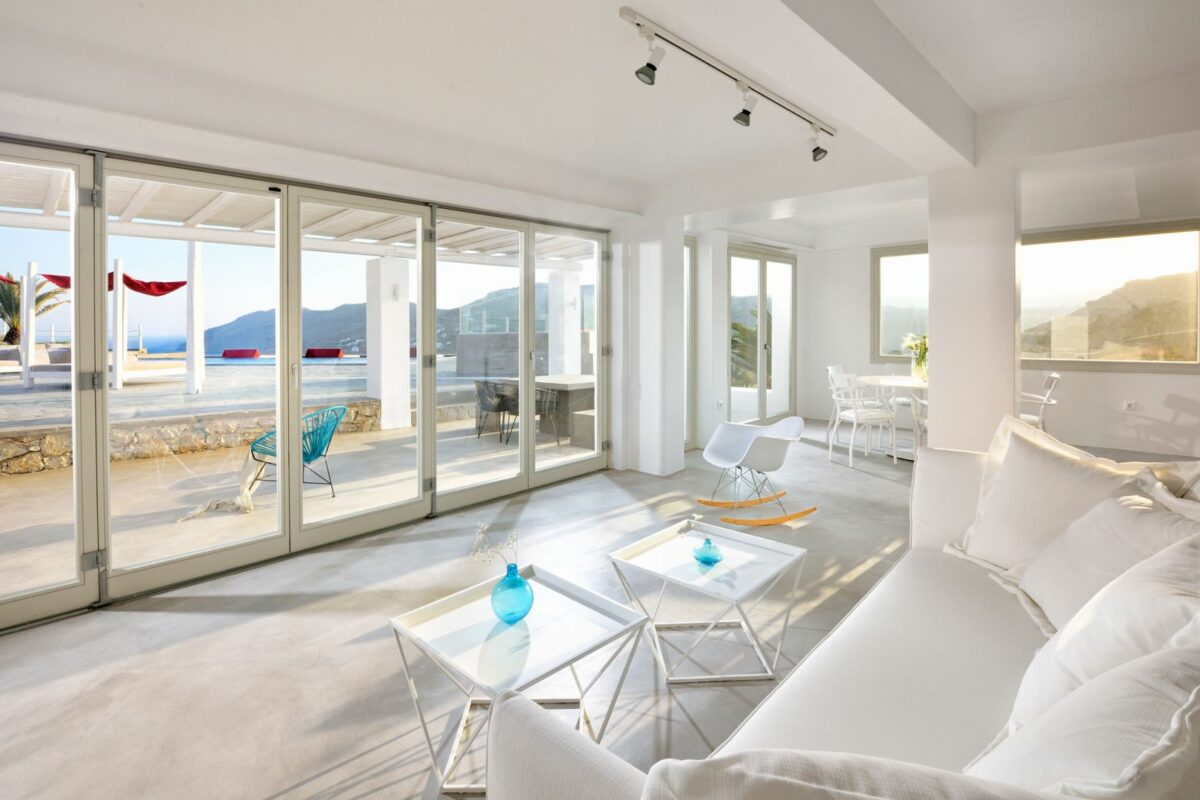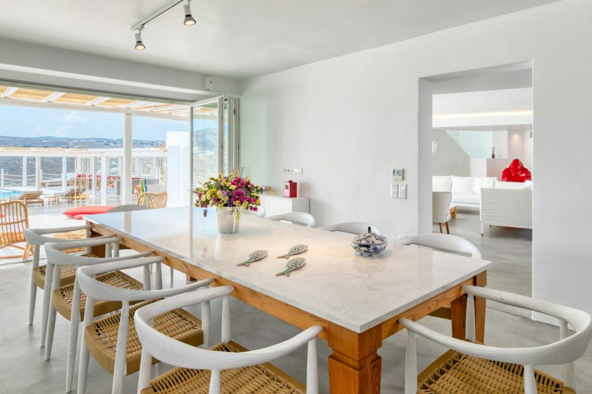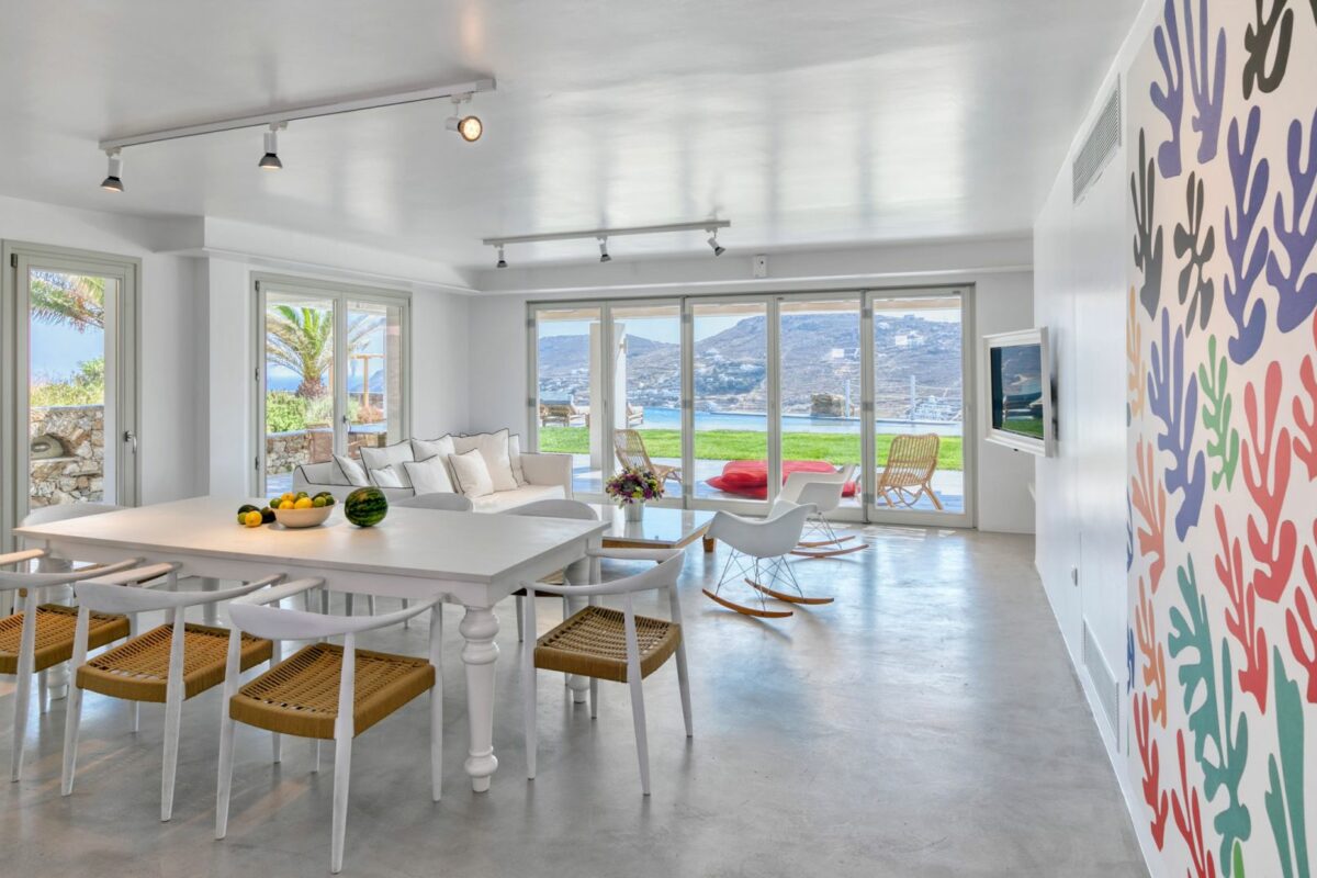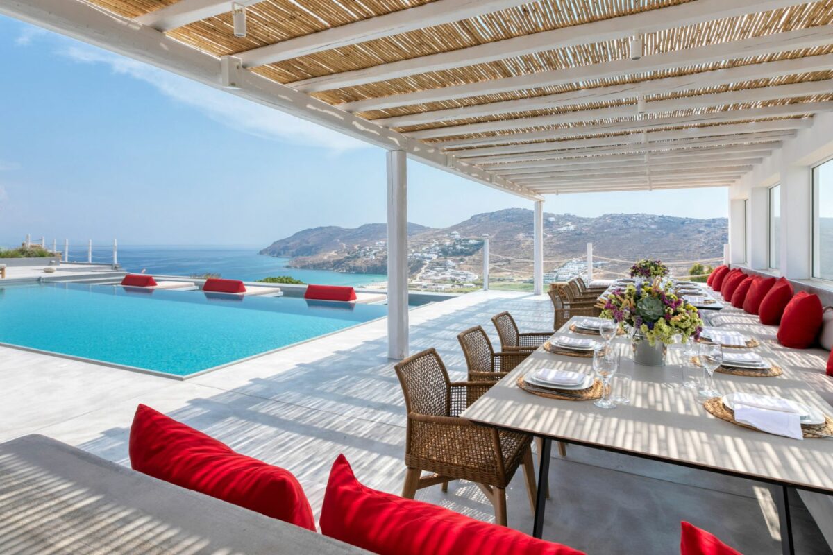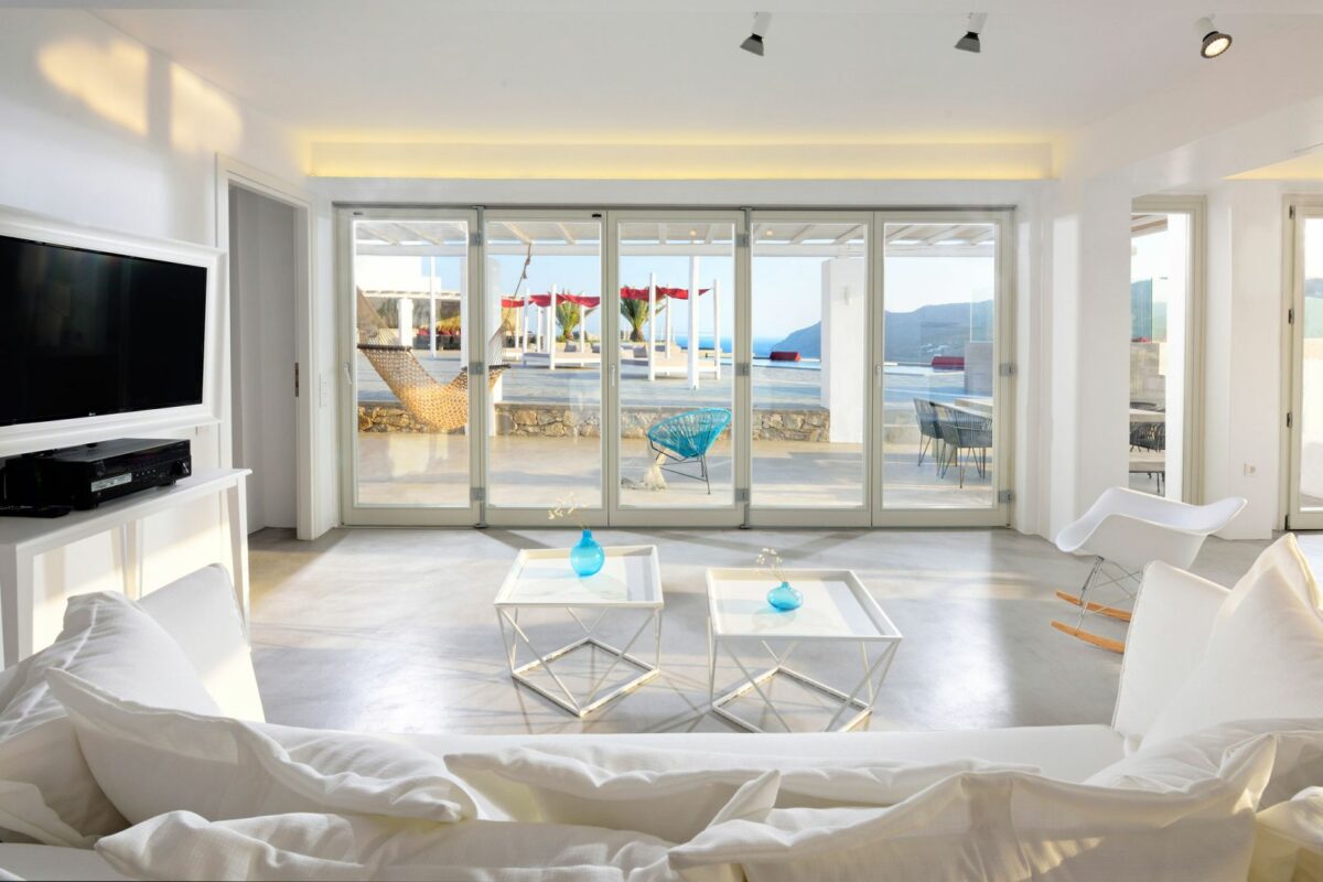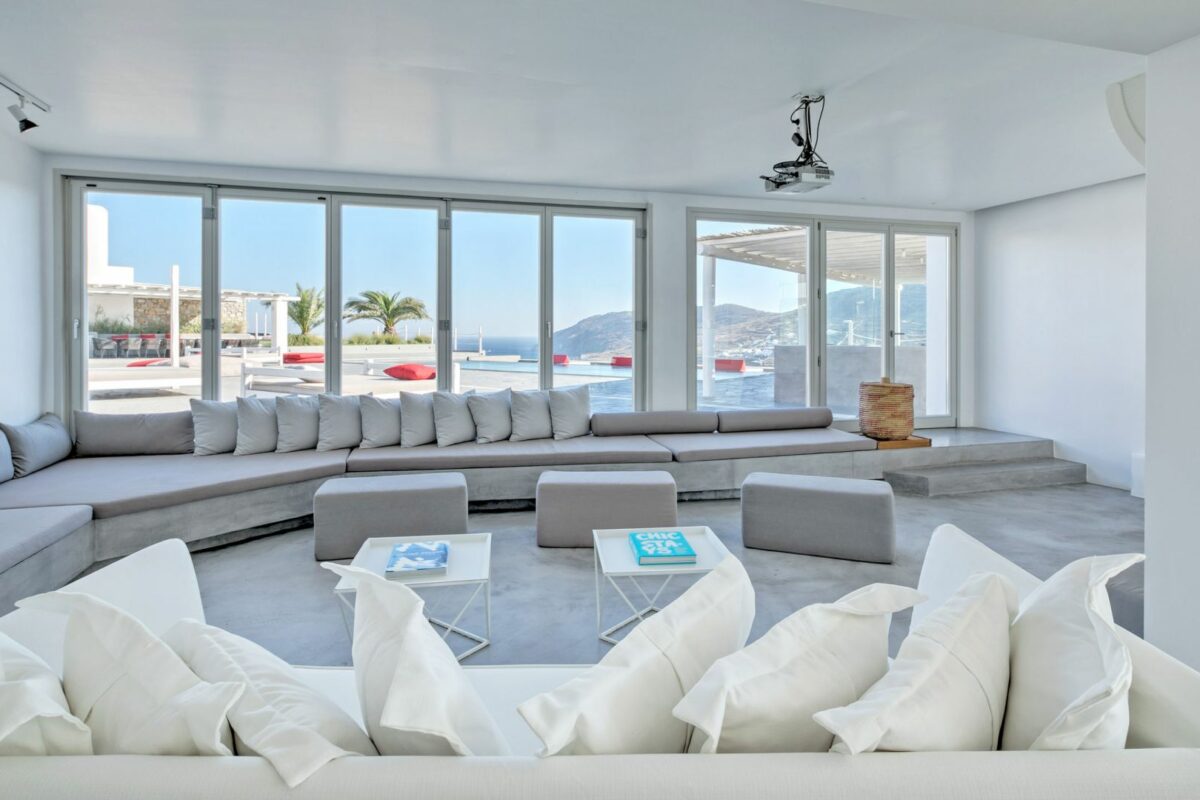Not only is this beach a short drive away but so are beaches like Agia Anna, Kalafatis and Lia, each unique in their own right. The massive front terrace was specifically designed to assure a large group could stretch out and have options on how to spend their time outdoors at the estate. A geometry-inspired infinity pool was conceived in a lateral, panoramic position backed by a unique insert of perfectly maintained lawn. The second, larger pool is just a few steps away with its stylish built in day beds and surrounded by an extensive open space.