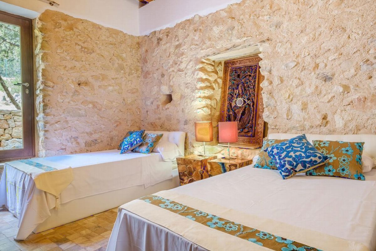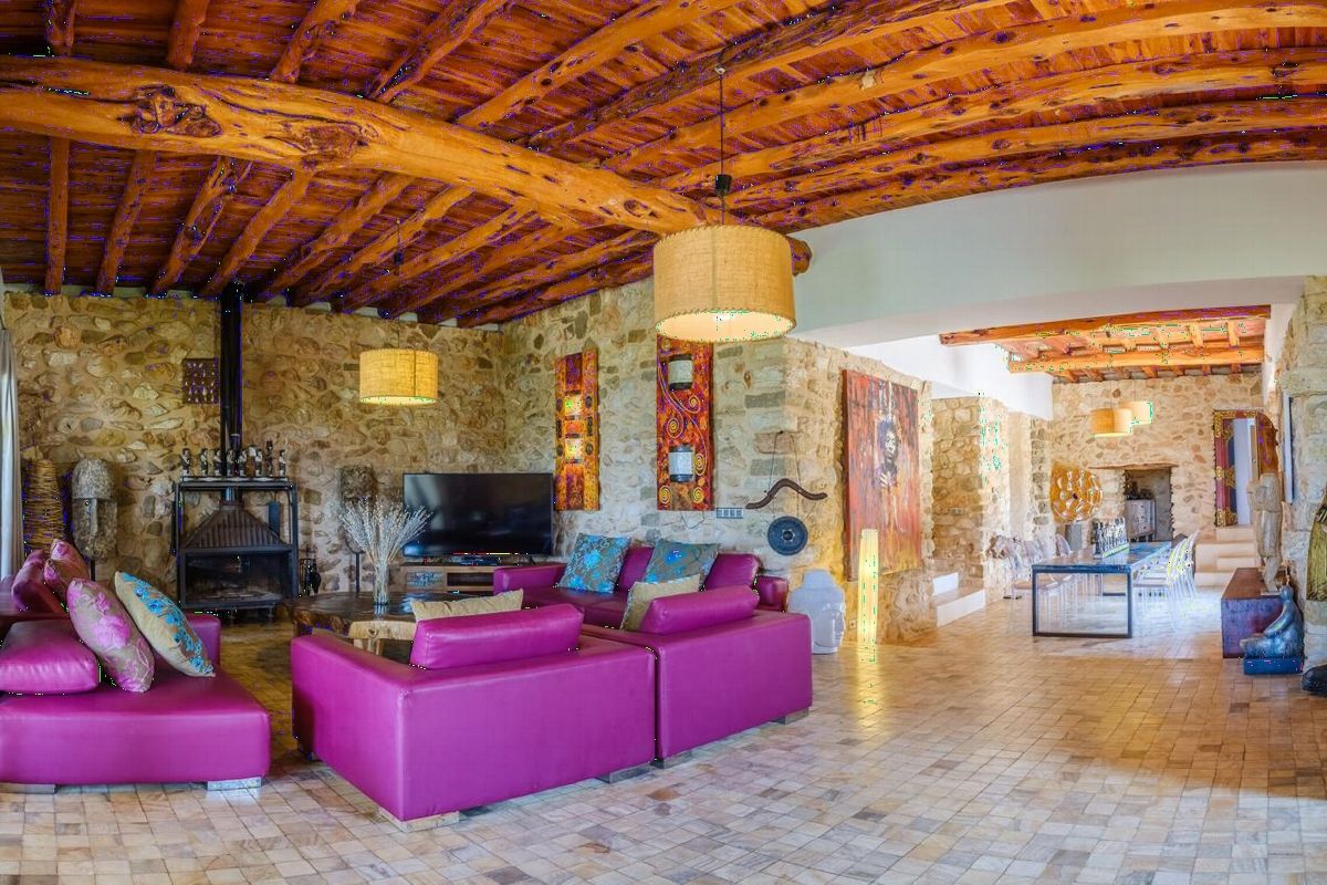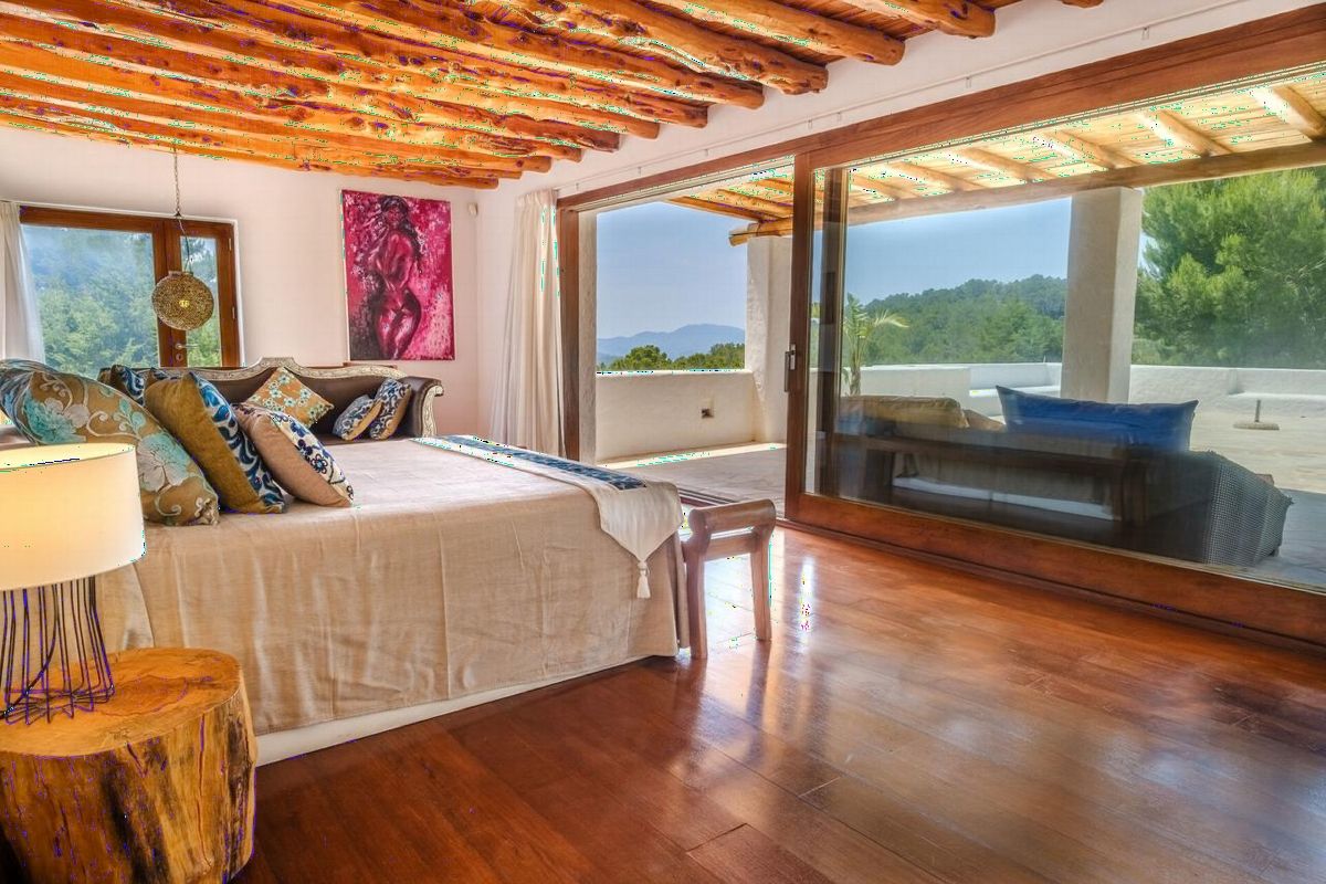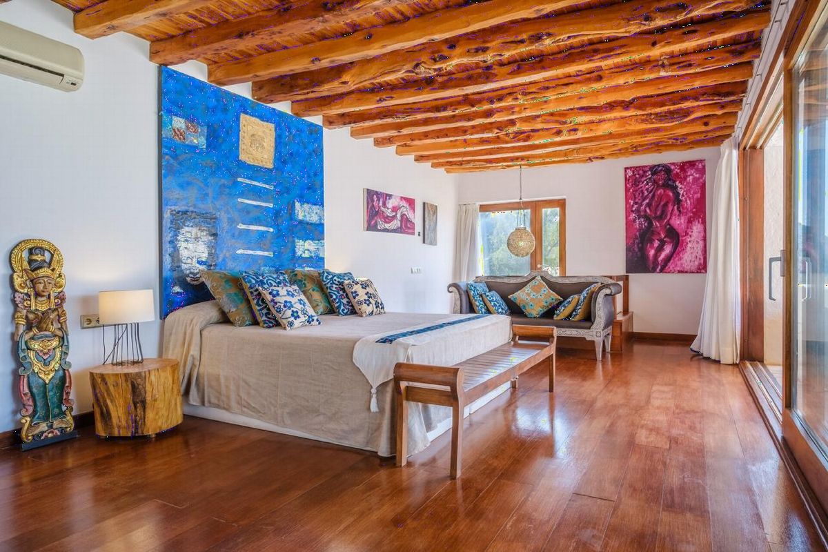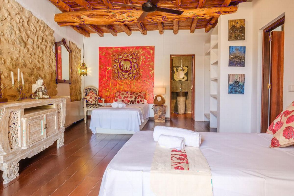 A central corridor connects the bedrooms on the upper floor, each exuding its unique character and charm. Can Savasana boasts five double bedrooms, with three having ensuite bathrooms, while the remaining two share a bathroom. The master bedroom offers an expansive 100-square-meter private terrace, boasting the most coveted sunset and sea views on the property. The suites on the lower floor provide guests with a serene escape, away from the sunset terraces above. All bedrooms are equipped with Air Conditioning, and many feature mounted ceiling fans for comfort.