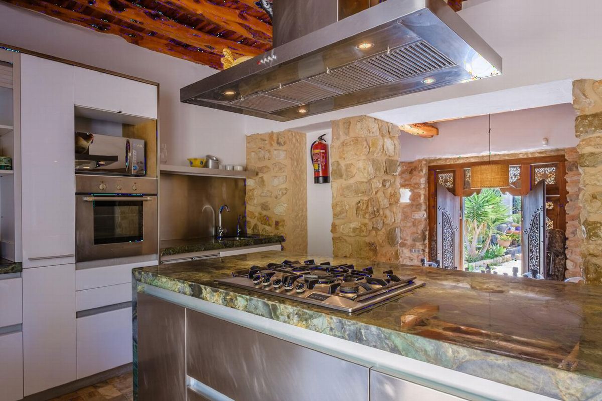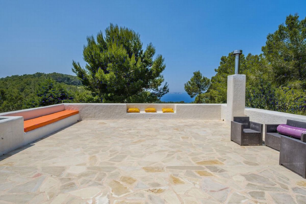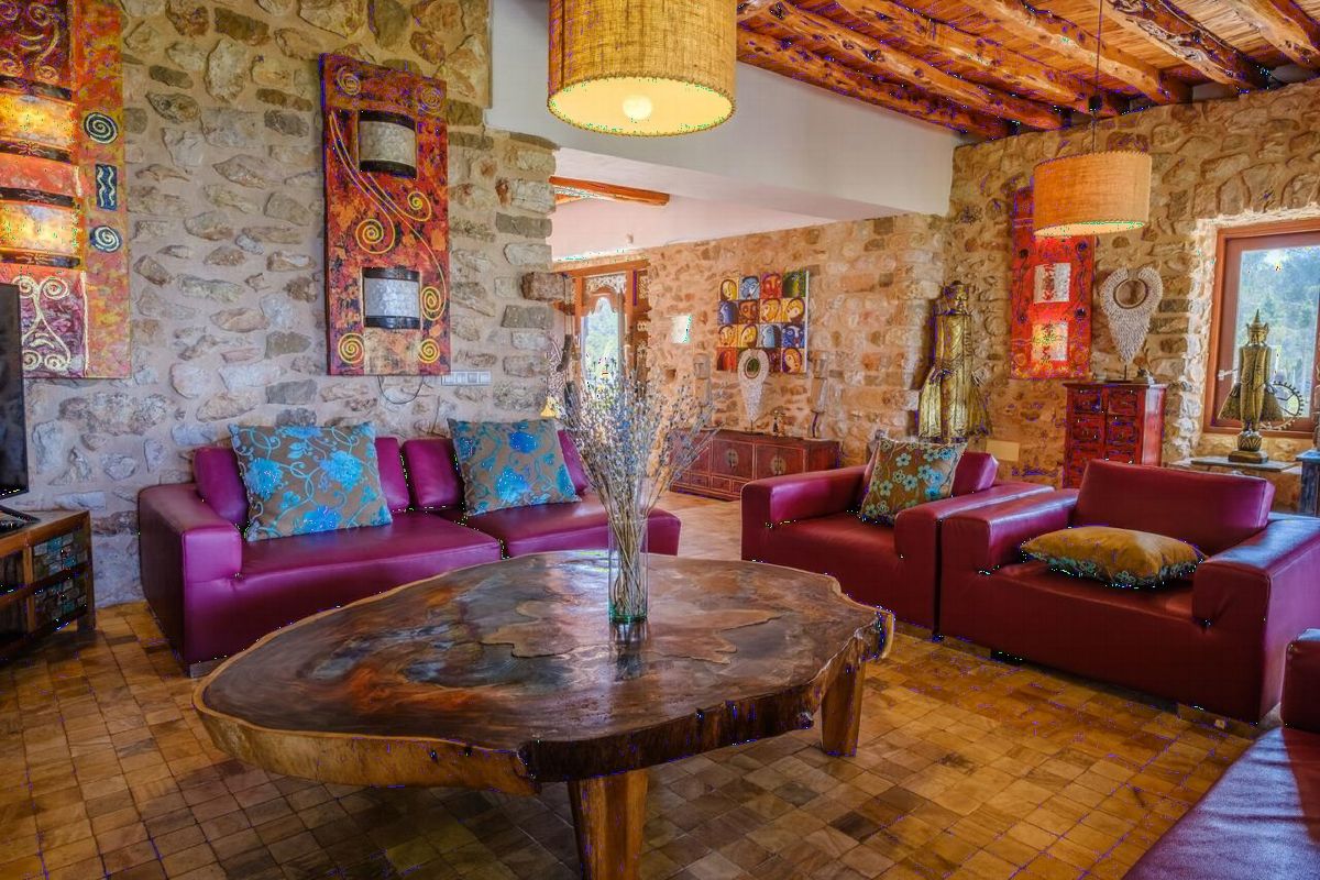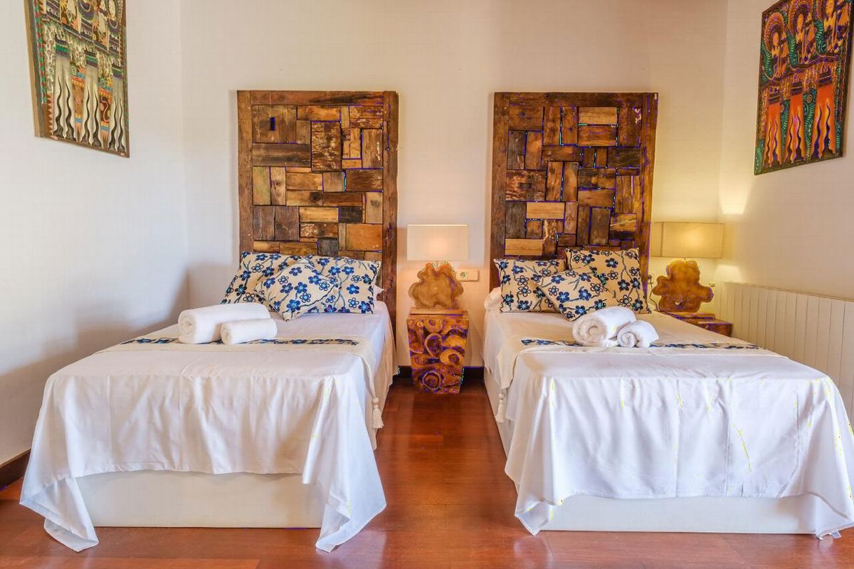 A central corridor connects the bedrooms on the upper floor, each exuding its unique character and charm. Can Savasana boasts five double bedrooms, with three having ensuite bathrooms, while the remaining two share a bathroom. The master bedroom offers an expansive 100-square-meter private terrace, boasting the most coveted sunset and sea views on the property. The suites on the lower floor provide guests with a serene escape, away from the sunset terraces above. All bedrooms are equipped with Air Conditioning, and many feature mounted ceiling fans for comfort.