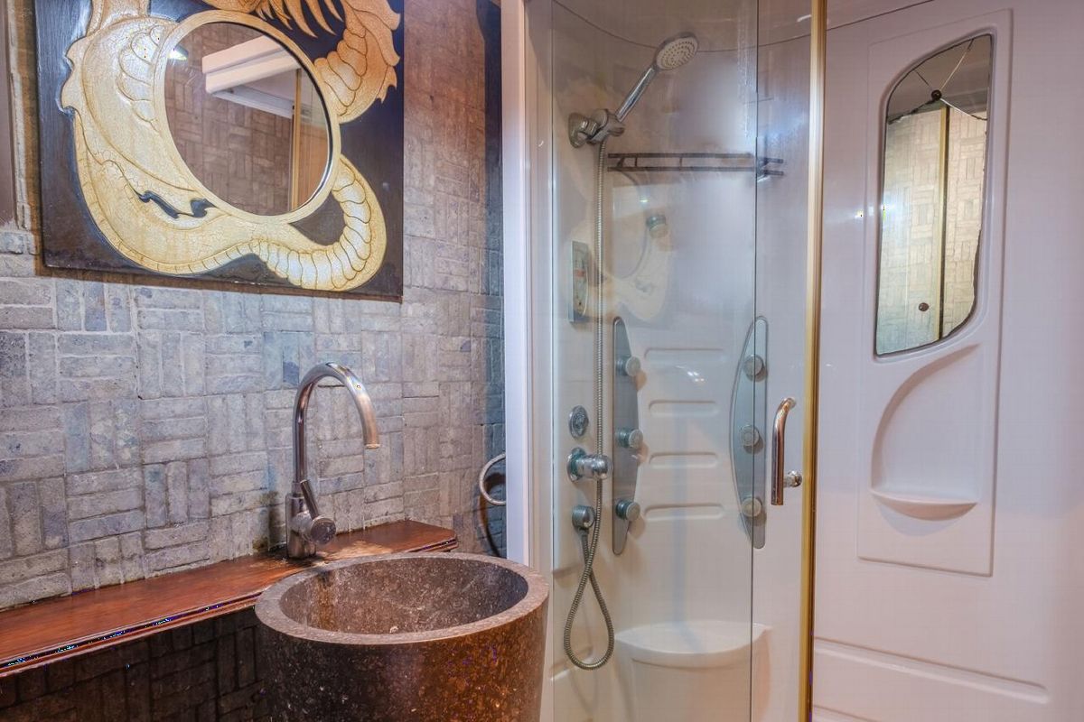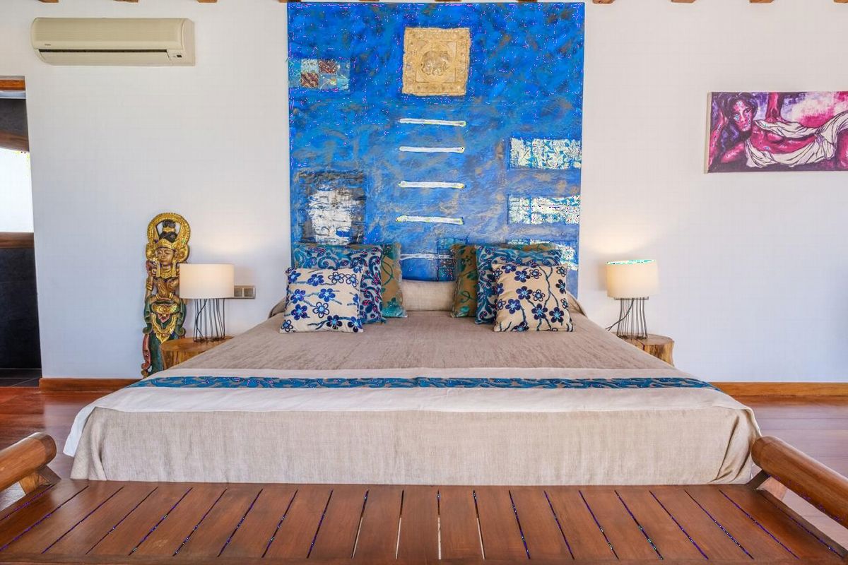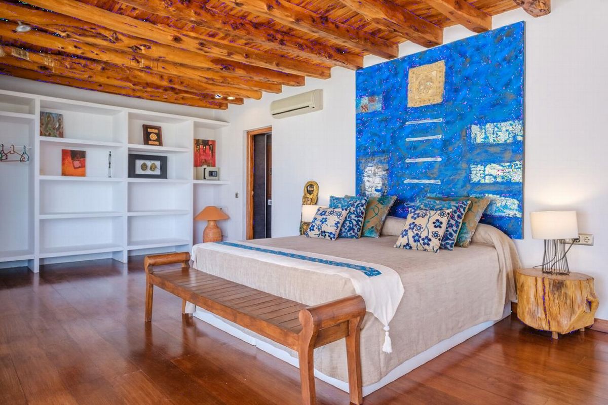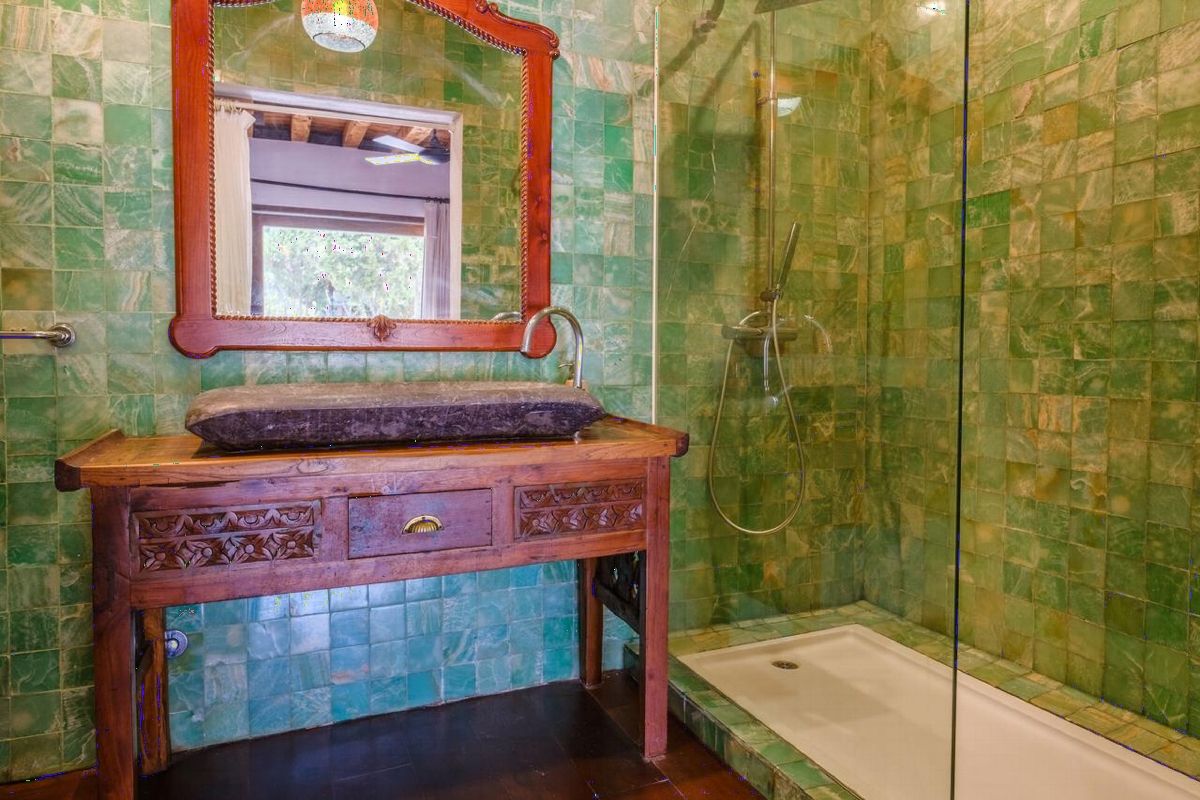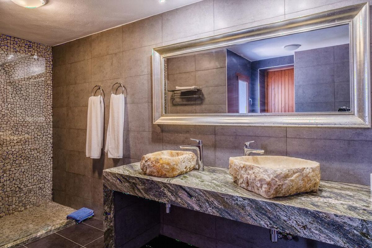 A central corridor connects the bedrooms on the upper floor, each exuding its unique character and charm. Can Savasana boasts five double bedrooms, with three having ensuite bathrooms, while the remaining two share a bathroom. The master bedroom offers an expansive 100-square-meter private terrace, boasting the most coveted sunset and sea views on the property. The suites on the lower floor provide guests with a serene escape, away from the sunset terraces above. All bedrooms are equipped with Air Conditioning, and many feature mounted ceiling fans for comfort.