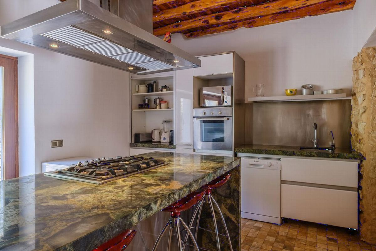 Can Savasana is a splendid transformation of the historic finca, offering expansive dimensions, a spacious layout, and lofty ceiling heights for those with a taste for grandeur. While preserving traditional rural elements, the house features thoughtful modernizations. The design showcases local craftsmanship with the use of natural materials such as native stone, exposed timber beams, wooden window frames, and shutters. Contemporary touches, including polished concrete floors and updated fixtures, add a touch of sophistication. The kitchen combines a traditional country style with a modern, sociable layout.