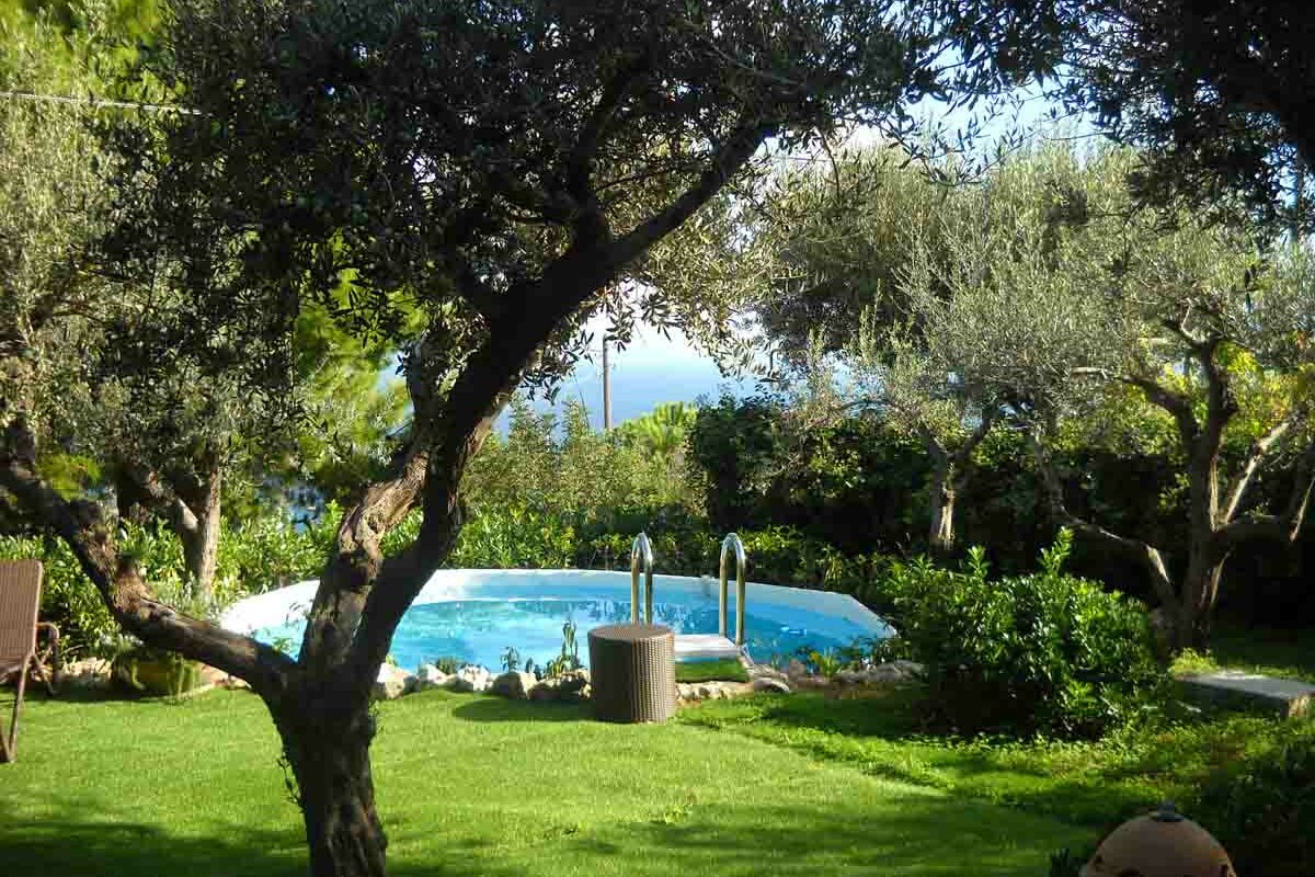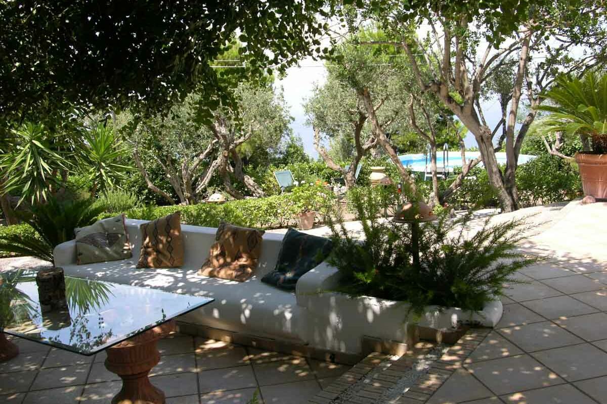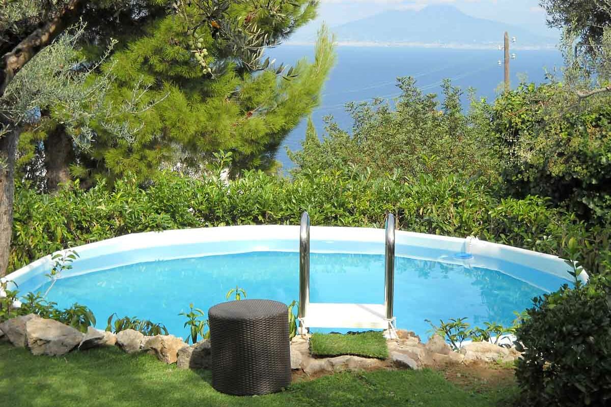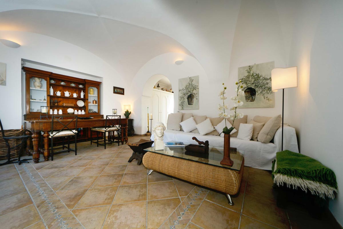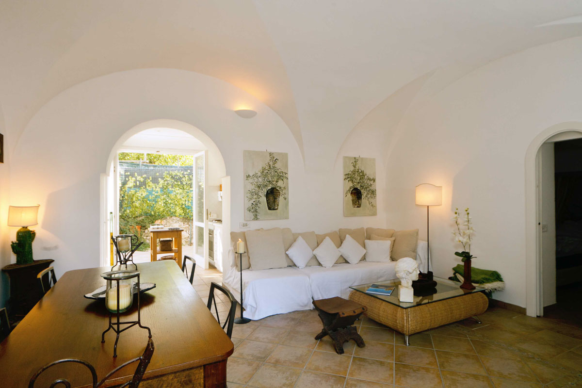 Open sitting room and dining room with beamed ceiling, large sofa, and dining table with seating for 6. The impeccable interiors balance clean, contemporary lines with antique pieces. The bright, professionally equipped kitchen is adjacent to the external courtyard with a bbq and crystal and wrought iron breakfast table. The doorway from the sitting room opens onto a large whitewashed terrace furnished with sofas and tables with seating for up to 10, perfect for lounging and dining al fresco. Small outdoor courtyard. A private circular, a partially above- ground pool is positioned among a garden of trees and laurels and looks out onto the bay and Mt. Vesuvius.