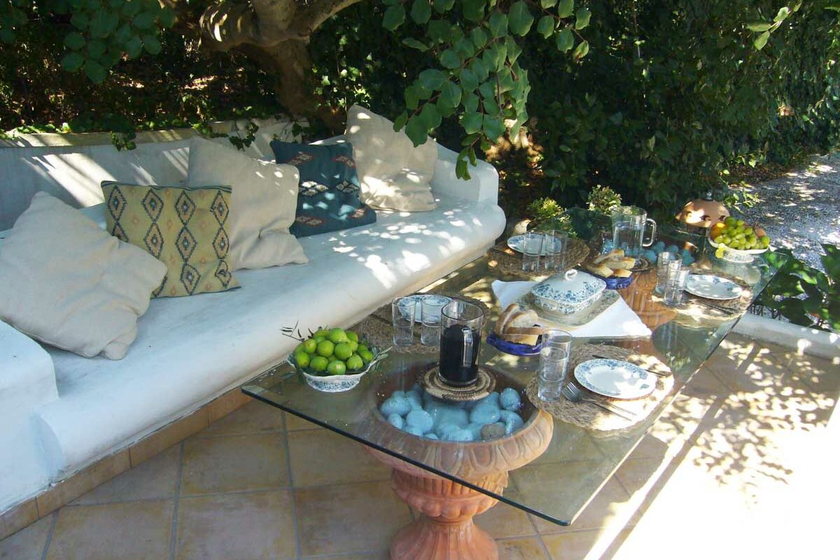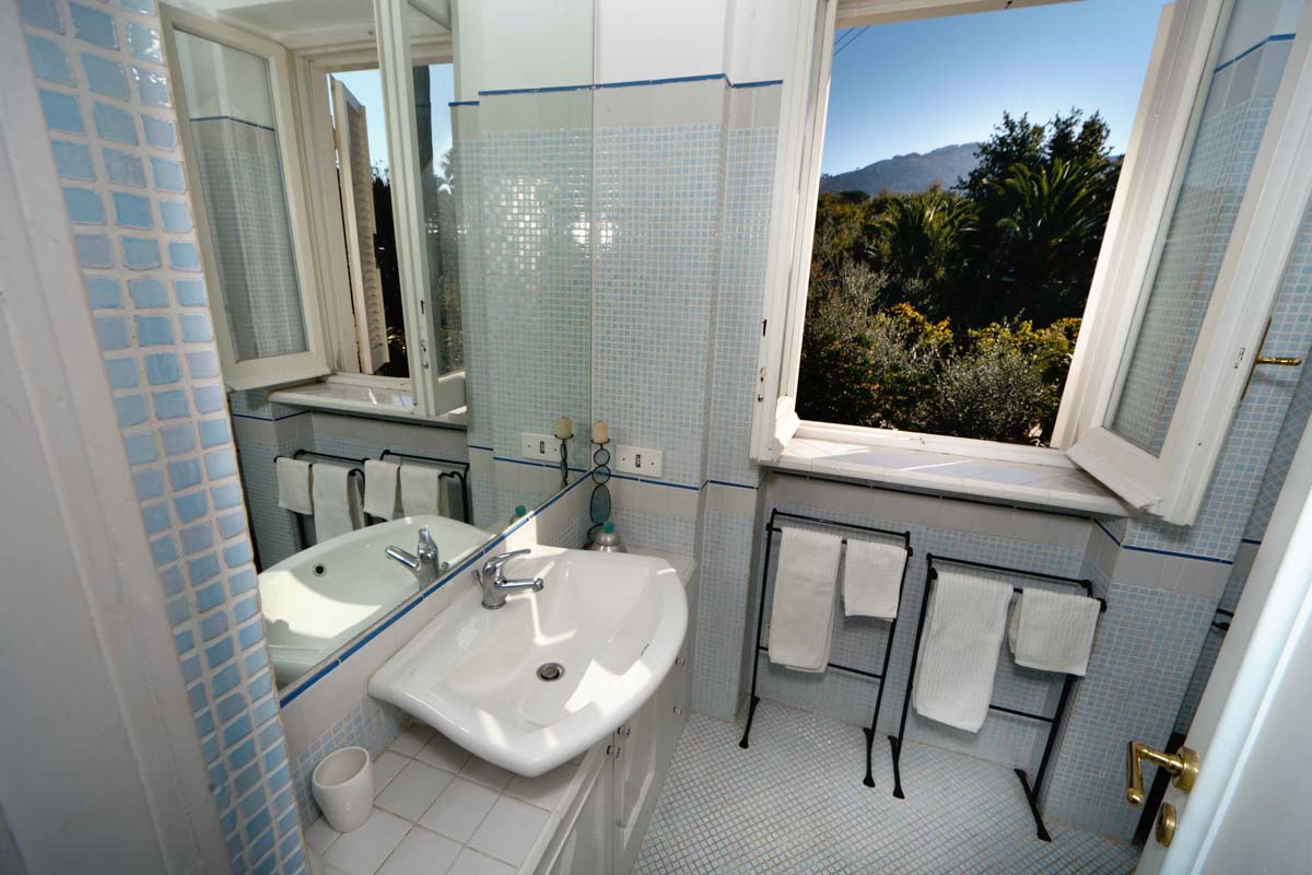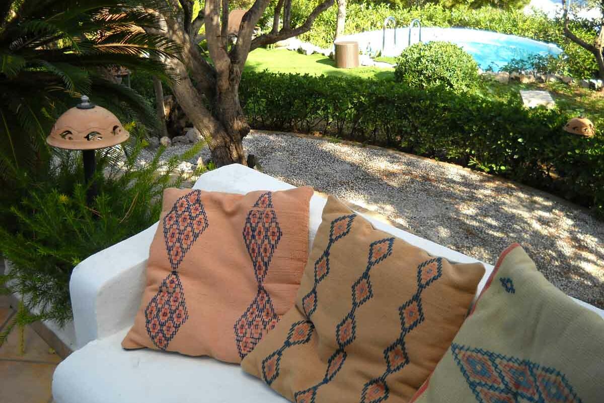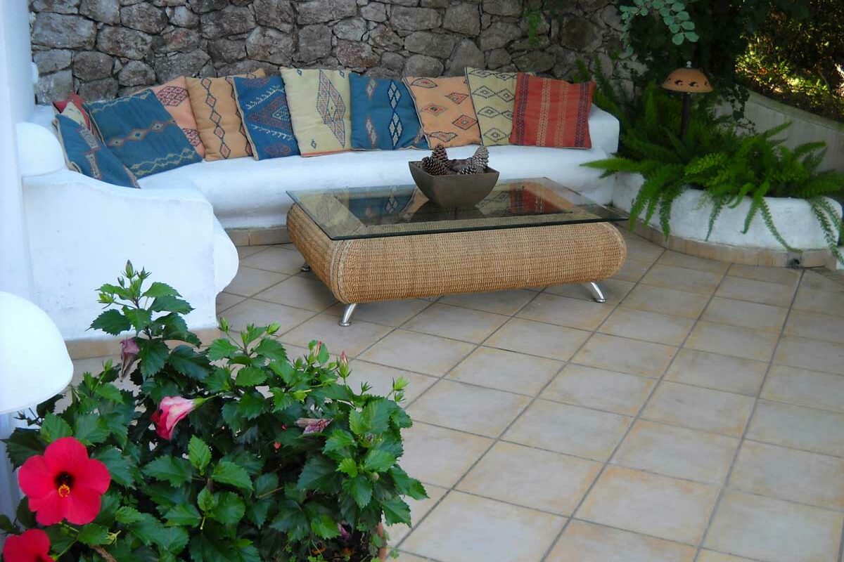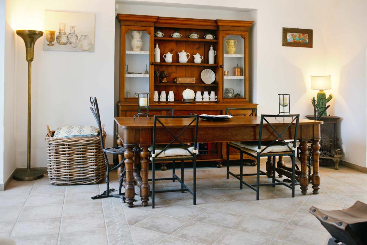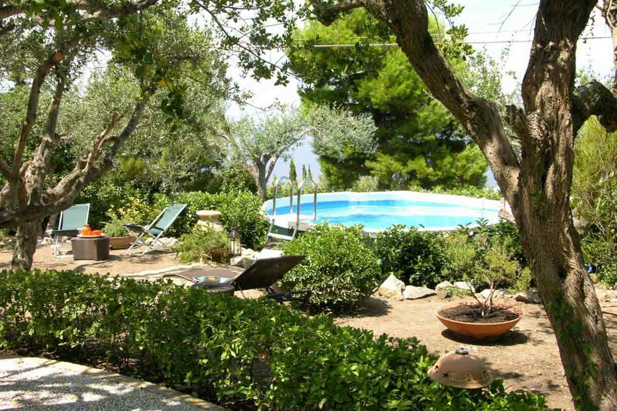 Open sitting room and dining room with beamed ceiling, large sofa, and dining table with seating for 6. The impeccable interiors balance clean, contemporary lines with antique pieces. The bright, professionally equipped kitchen is adjacent to the external courtyard with a bbq and crystal and wrought iron breakfast table. The doorway from the sitting room opens onto a large whitewashed terrace furnished with sofas and tables with seating for up to 10, perfect for lounging and dining al fresco. Small outdoor courtyard. A private circular, a partially above- ground pool is positioned among a garden of trees and laurels and looks out onto the bay and Mt. Vesuvius.