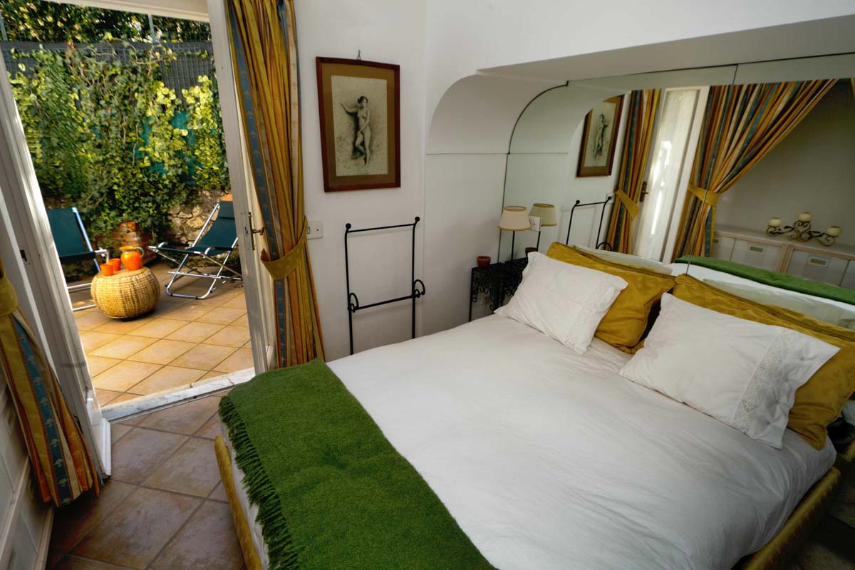 Queen bedroom opens onto a small flowered outdoor courtyard.
