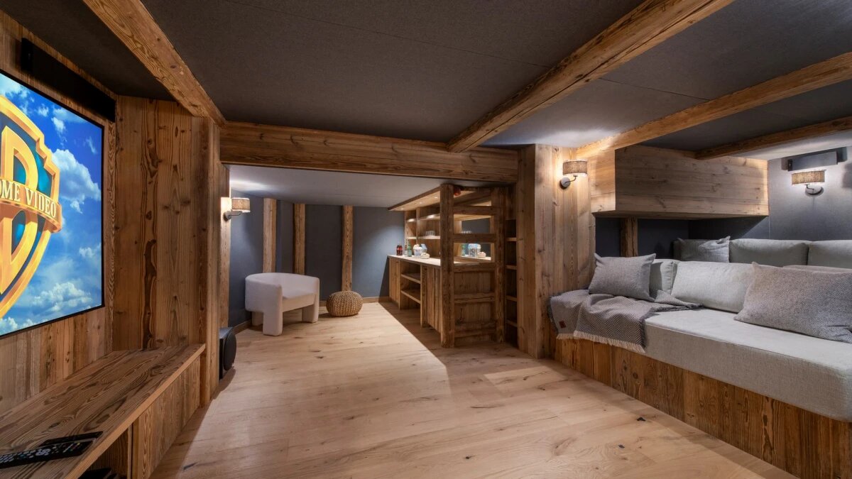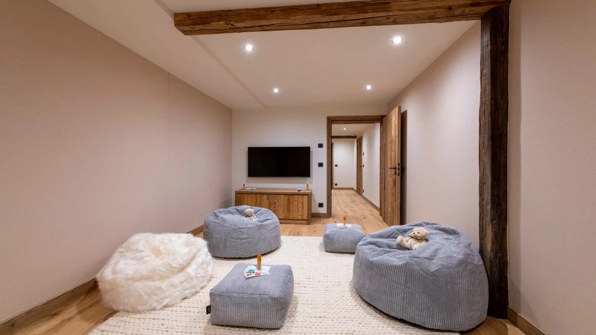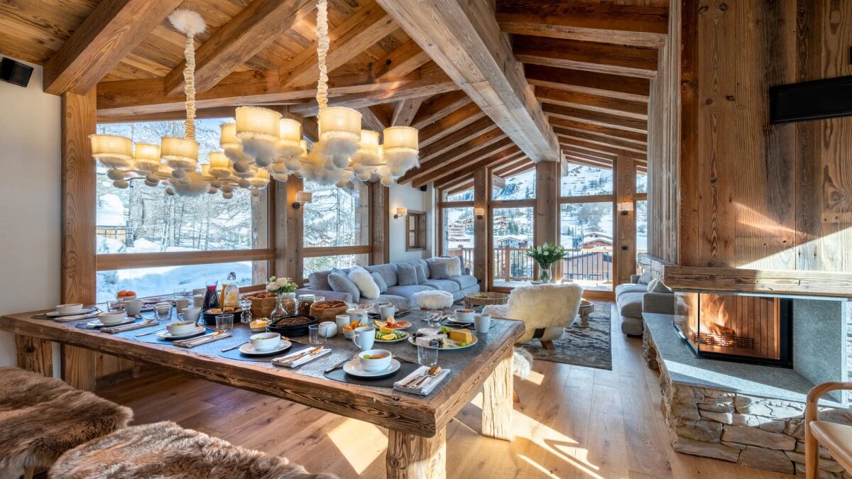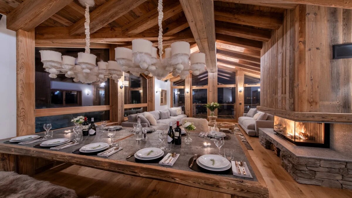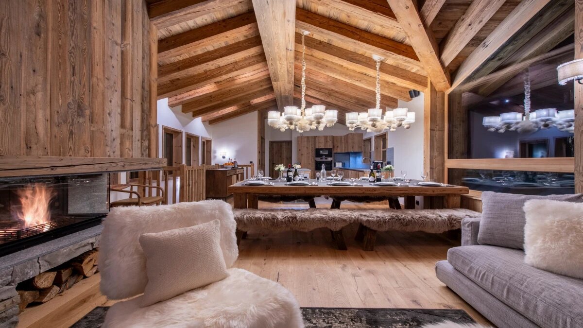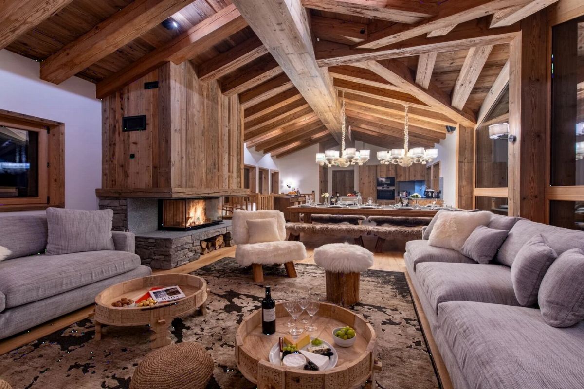 L'espace de vie principal au dernier étage est baigné de lumière naturelle pendant la journée, grâce aux hauts plafonds à double voûte du chalet, aux grandes baies vitrées et à la triple exposition nord, ouest et sud. A la tombé de la nuit, installez-vous dans les canapés accueillants, agrémentés de fourrures et de meubles design, enveloppés dans la chaleur du foyer au bois.
