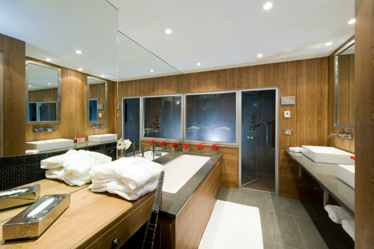 Les étages inférieurs abritent quatre chambres en suite, décorées avec soin dans un esprit montagnard chaleureux. Chaque chambre est dotée d'un balcon, permettant de profiter d'une belle lumière naturelle. La chambre principale offre un espace bien-être, avec une salle de bain équipée d’une douche hammam, pour une relaxation totale après une journée en plein air. Un jacuzzi extérieur est aussi accessible, permettant de savourer des instants de détente en toute intimité.