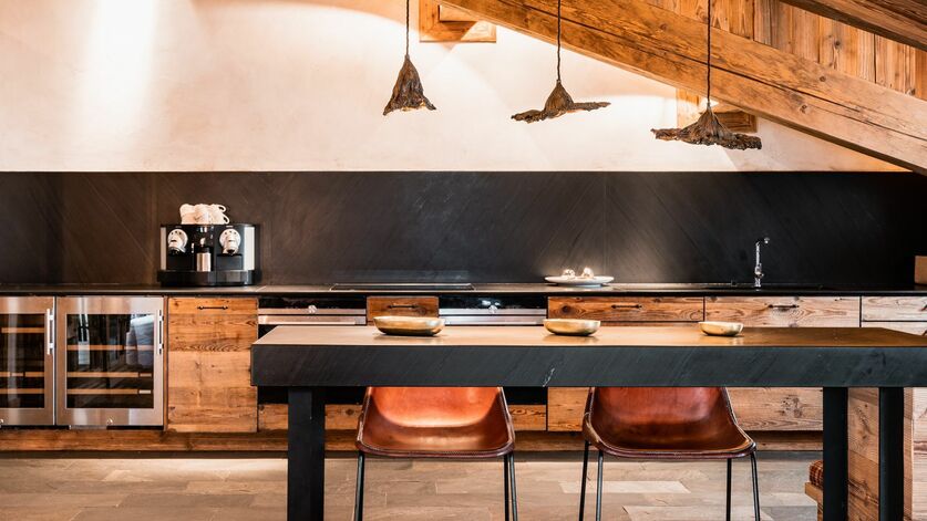 The main living space of Chalet Chène, radiant with its design, is located on the top floor. Sumptuous, brightly colored sofas surround a stone fireplace that immediately captures the attention. High vaulted ceilings made from recycled wood embody the classic charm of Alpine chalets, giving this space an authentic atmosphere. Large windows let in natural light, but you also have the option of closing the thick curtains to create a more intimate mountain ambiance.