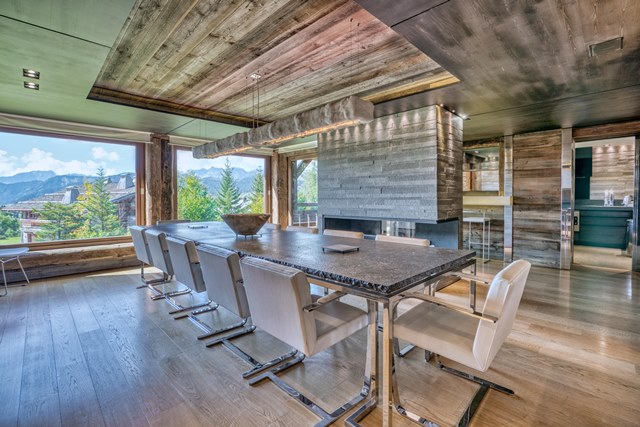 > Dining room for 12 people with fireplace