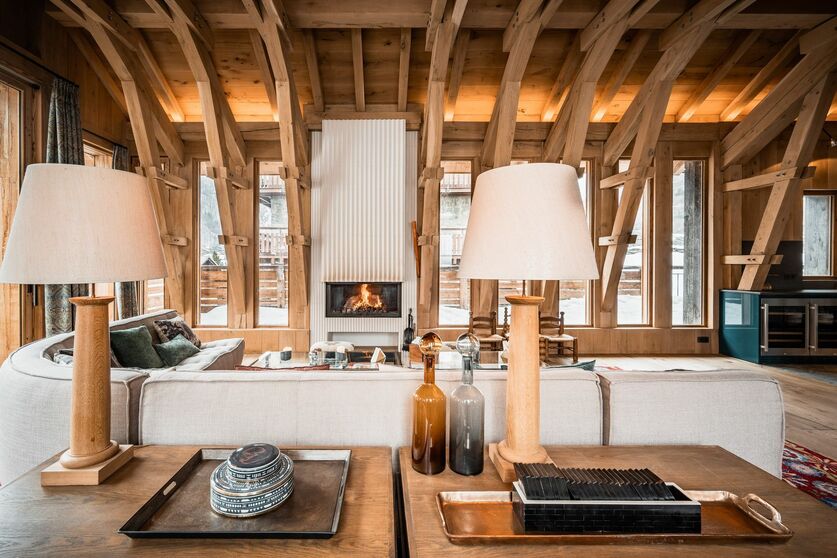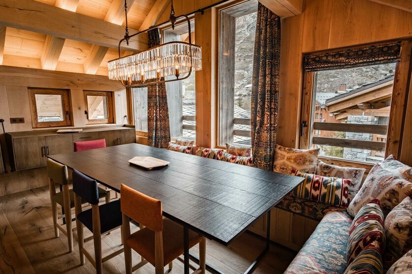 Baptisé d'après son impressionnant plafond cathédrale, l'espace de vie ouvert du Chalet La Grange bénéficie d'une abondance de lumière naturelle, permettant d'apprécier pleinement la vue panoramique sur la Face de Bellevarde. Le décor en bois naturel apparent crée une ambiance alpine traditionnelle, idéale pour se détendre près de la cheminée. Réunis confortablement autour de la table à manger, les convives peuvent prolonger leurs conversations tout en dégustant les délices concoctés par votre chef.