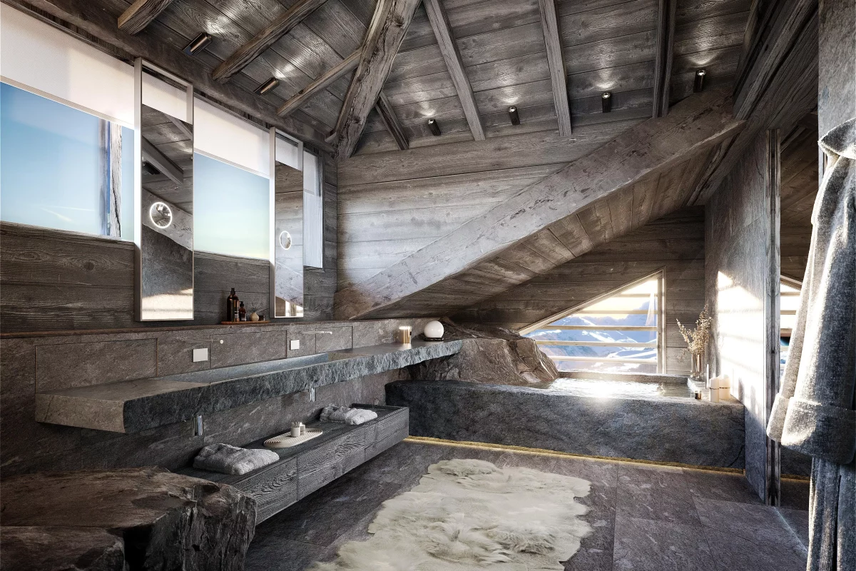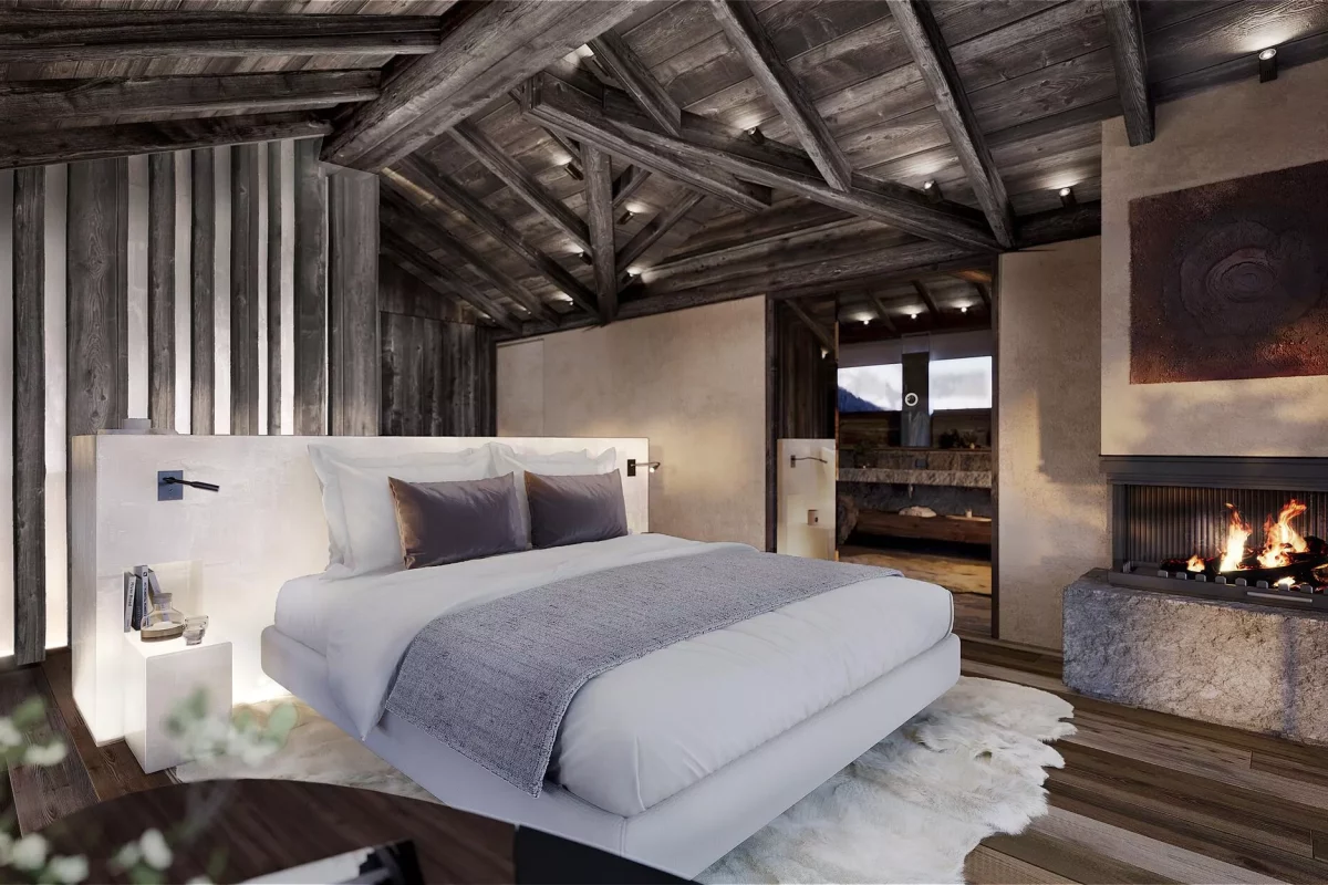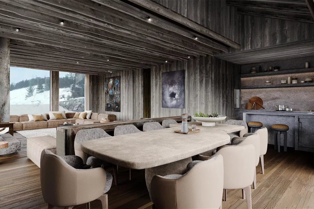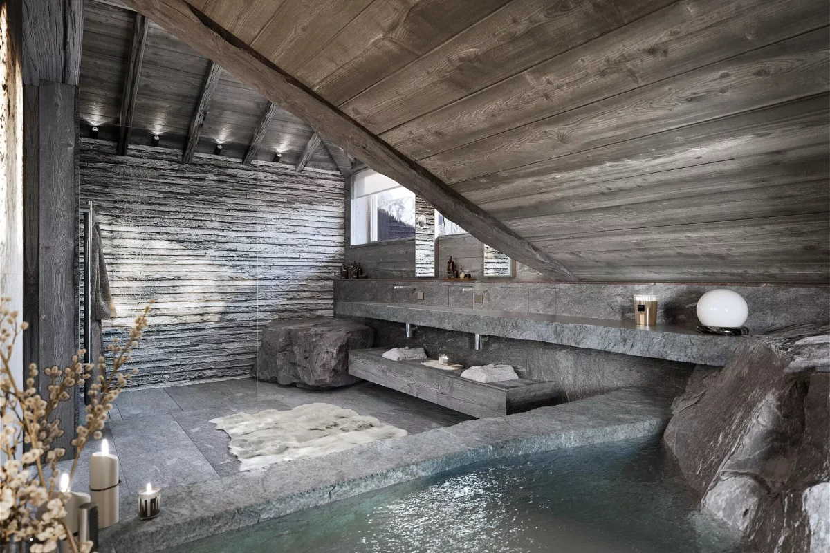 The interior is modern, featuring solid wood, natural stone, and high-end textiles. One of the chalet’s standout features is its wellness area, which includes an indoor swimming pool, diving pool, jacuzzi, sauna, hammam, fitness room, and massage room. A private cinema, night club, and wine tasting cellar are also part of the chalet’s exclusive amenities.