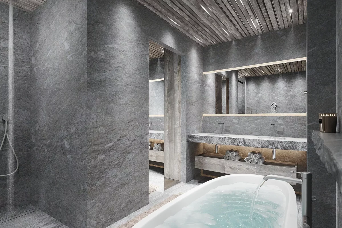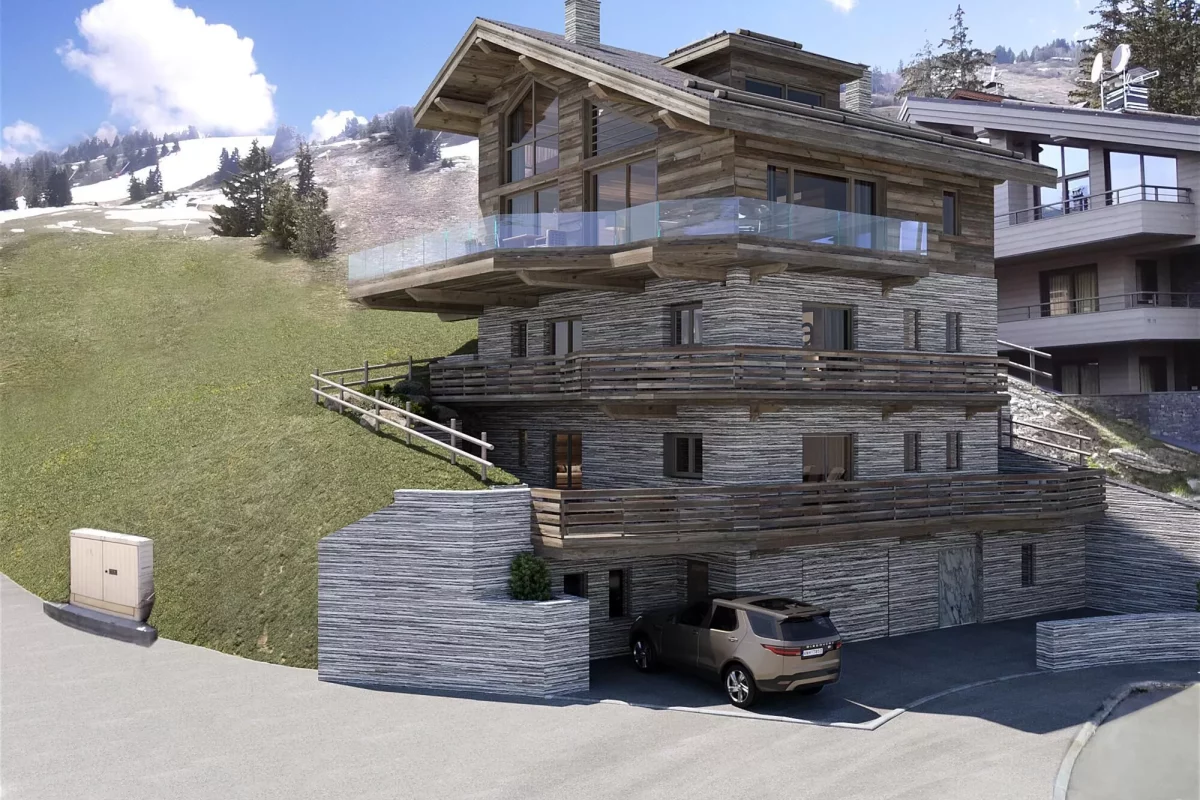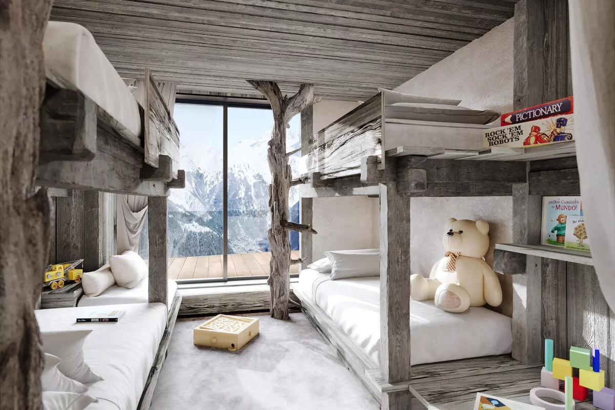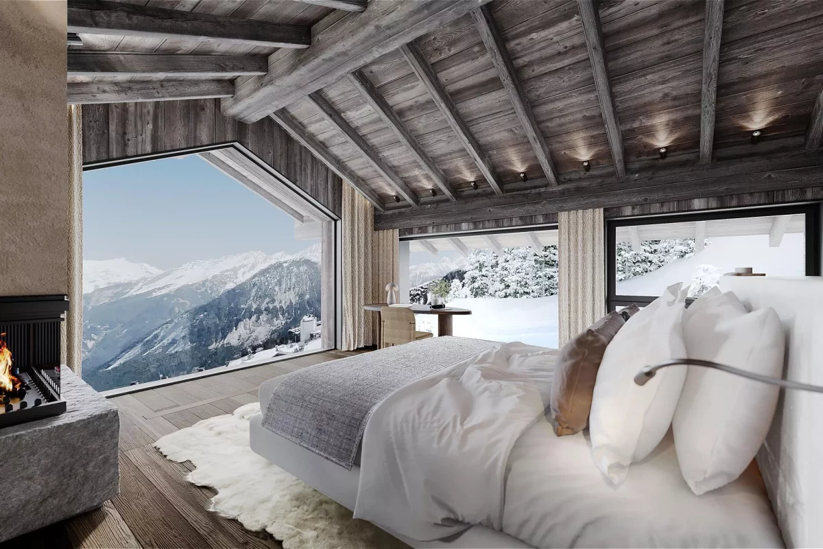 The interior is modern, featuring solid wood, natural stone, and high-end textiles. One of the chalet’s standout features is its wellness area, which includes an indoor swimming pool, diving pool, jacuzzi, sauna, hammam, fitness room, and massage room. A private cinema, night club, and wine tasting cellar are also part of the chalet’s exclusive amenities.