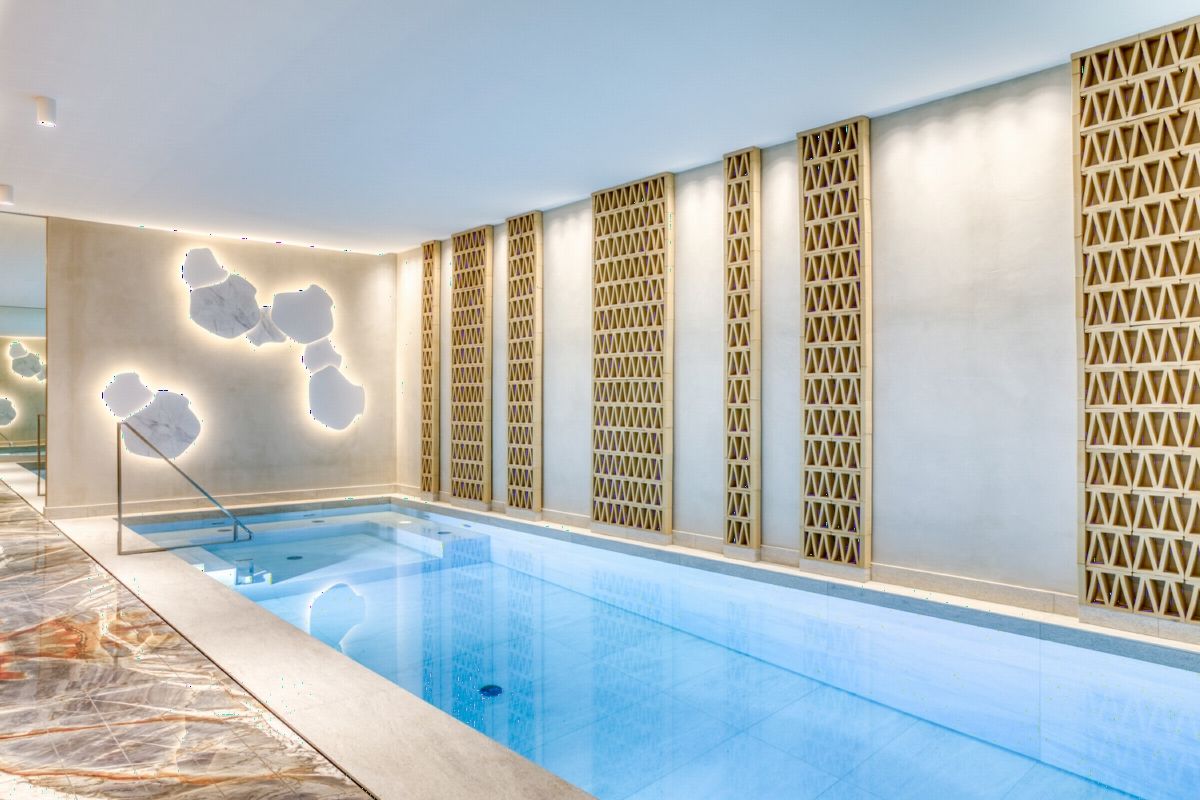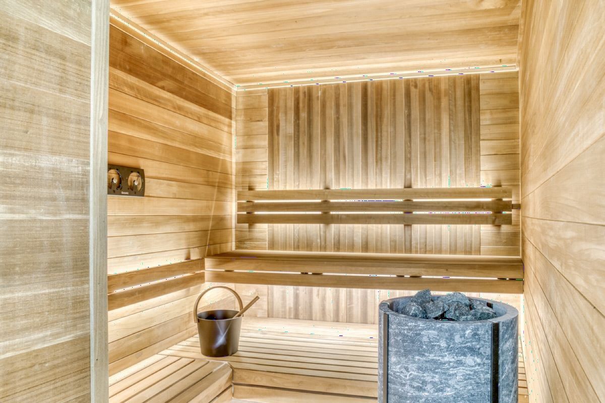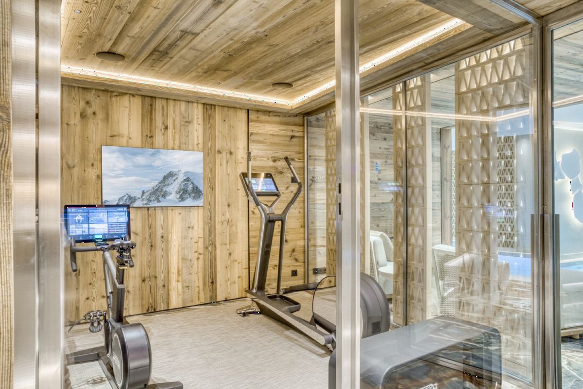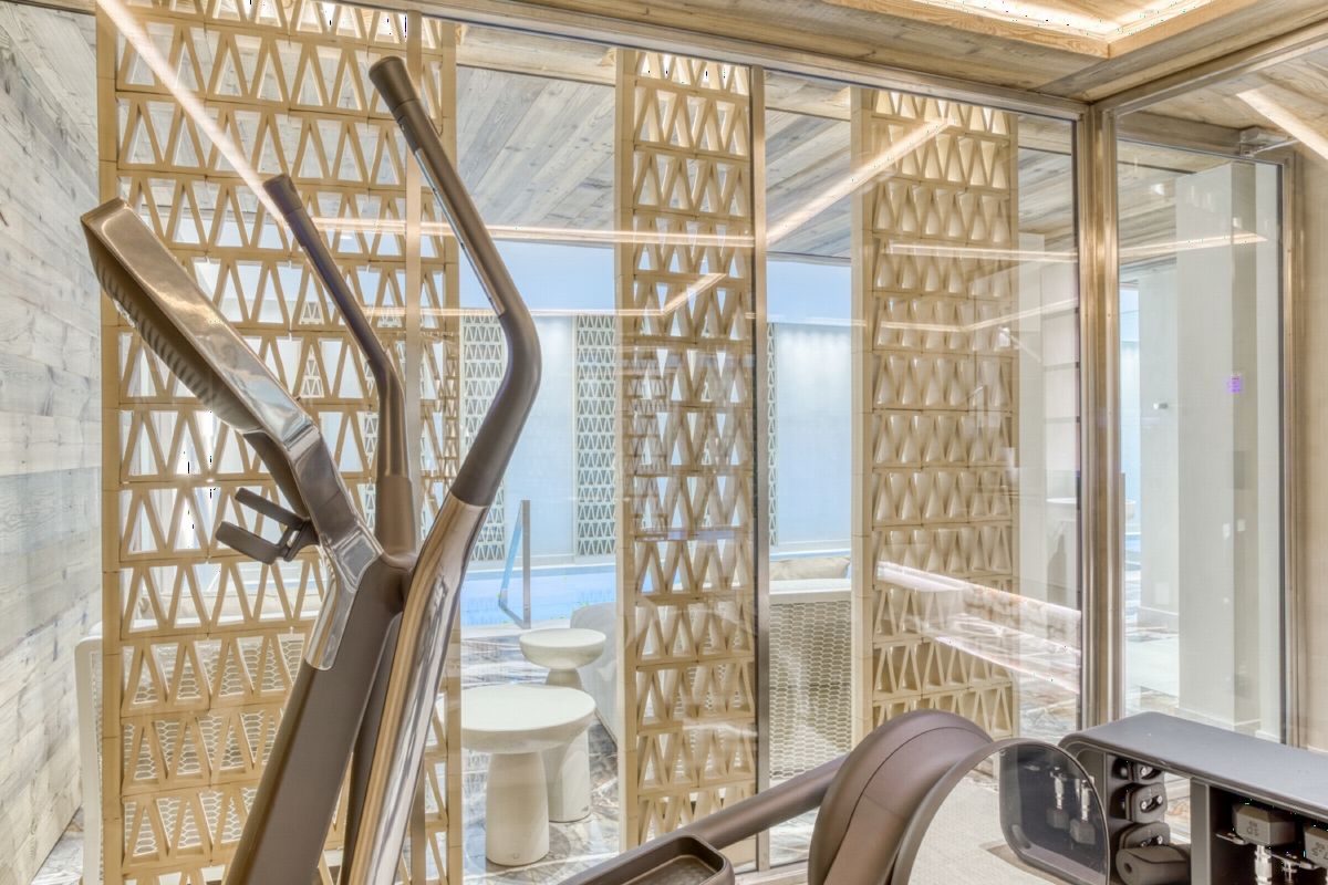> Espace spa : piscine intérieure avec jets de jacuzzi, hammam, sauna, salle de sport avec vélo électrique, machine elliptique et quelques poids, tv, douche et toilettes