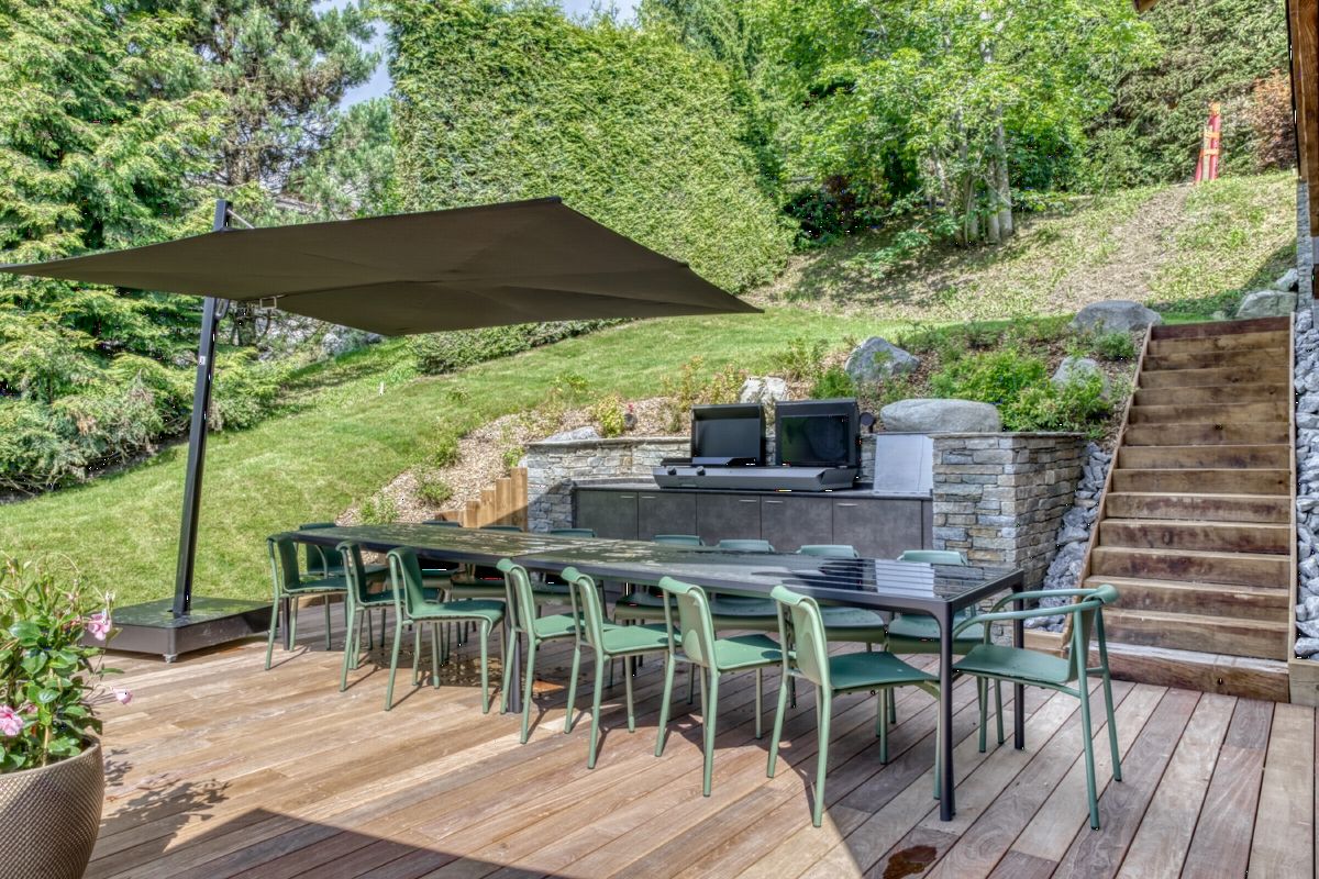 > Grande terrasse extérieure avec piscine, cuisine d’été équipée d'une plancha et d'une table pour 14 personnes