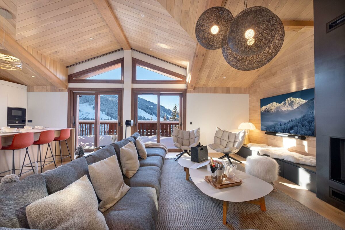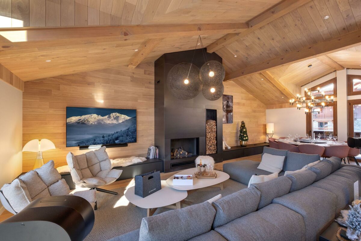 L'espace de vie principal se situe au dernier étage, sous une magnifique charpente en bois apparente. Cette configuration permet de profiter pleinement des vues panoramiques sur les pistes de Courchevel Village et Courchevel 1850, ainsi que sur les majestueux paysages de la Vanoise.