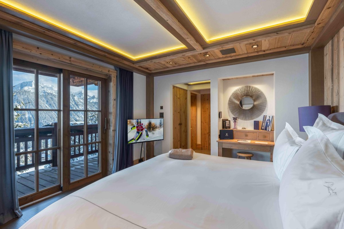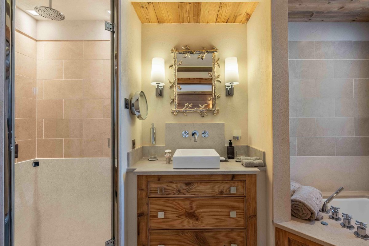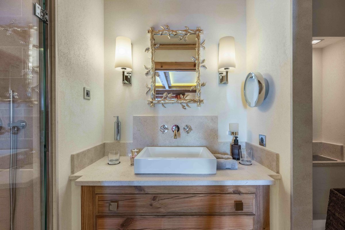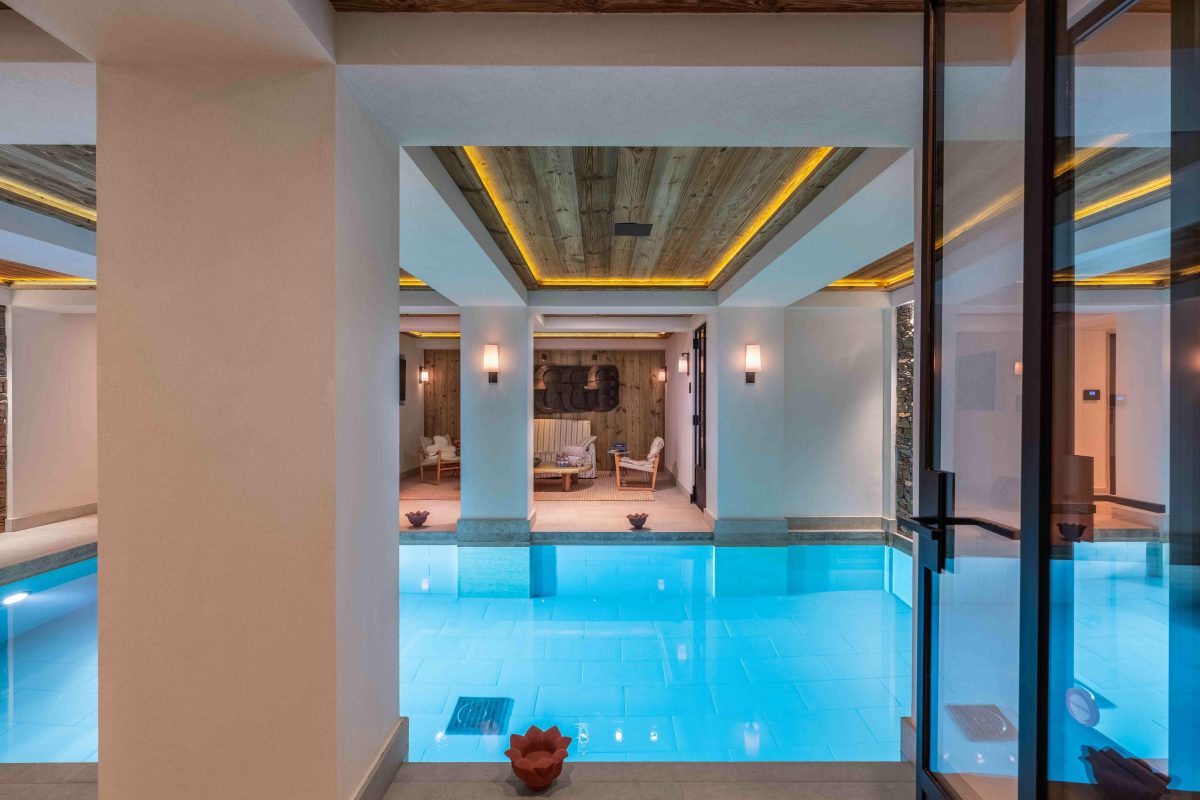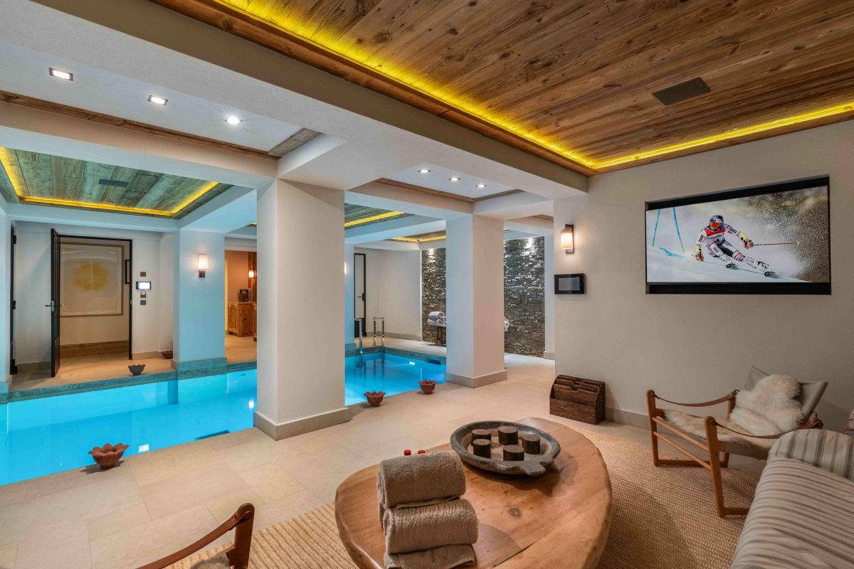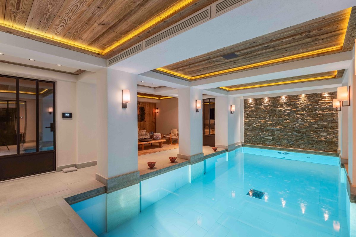 This prestigious chalet is equipped with a private ski-room, a large swimming pool and a sublime spa area with its beige stone hammam.