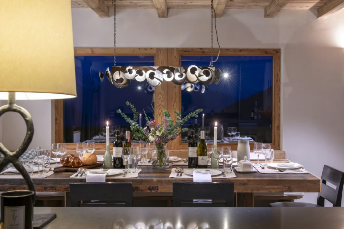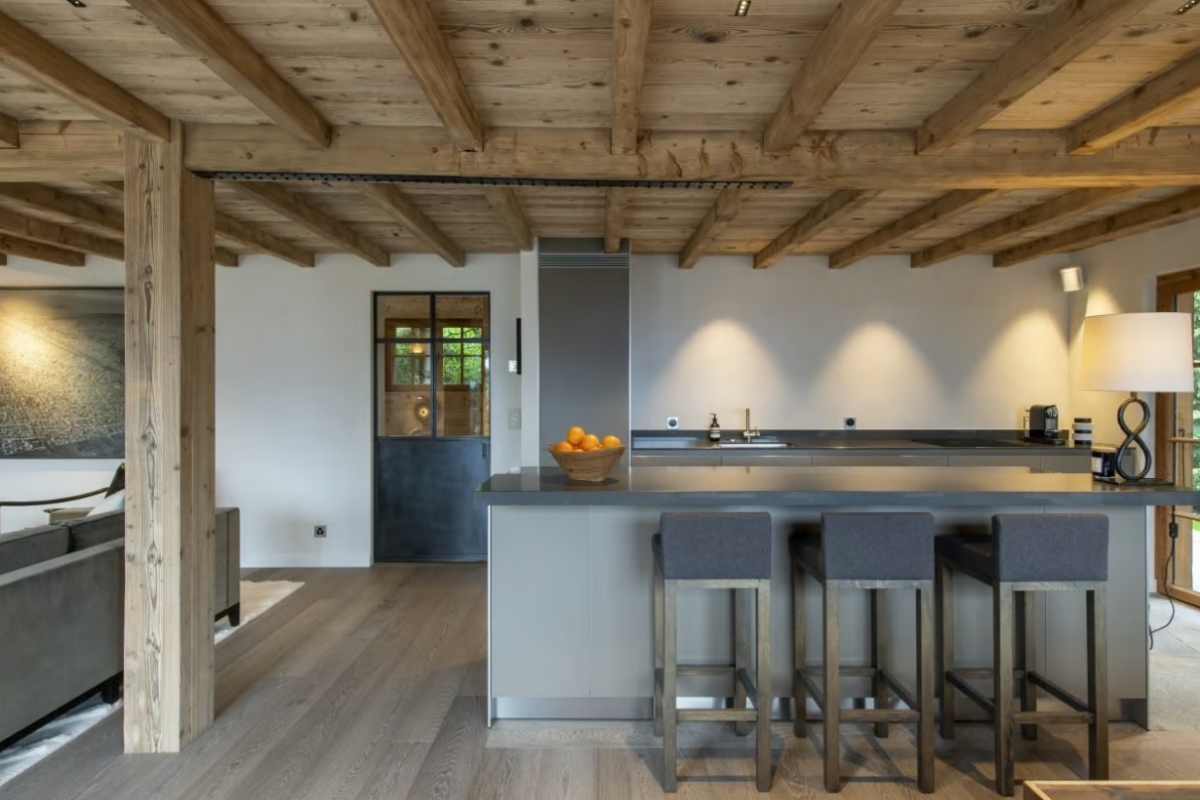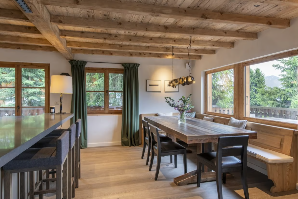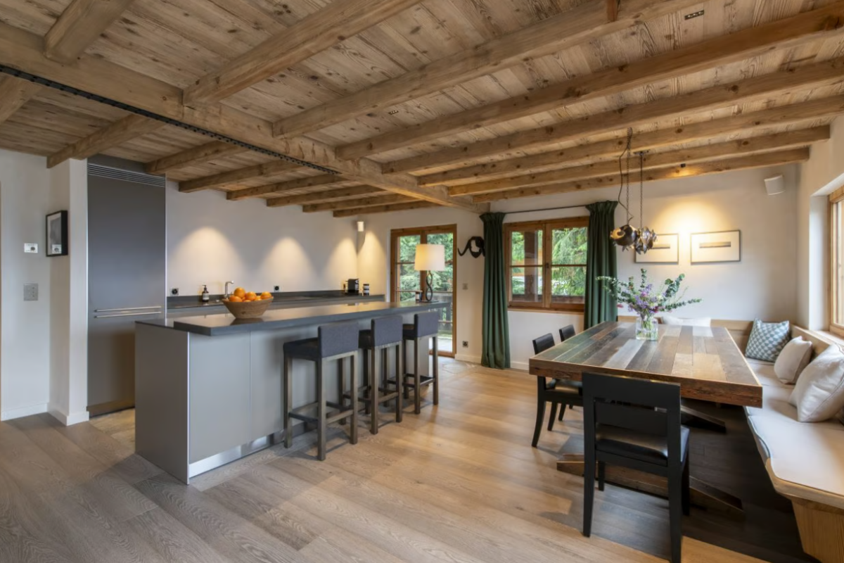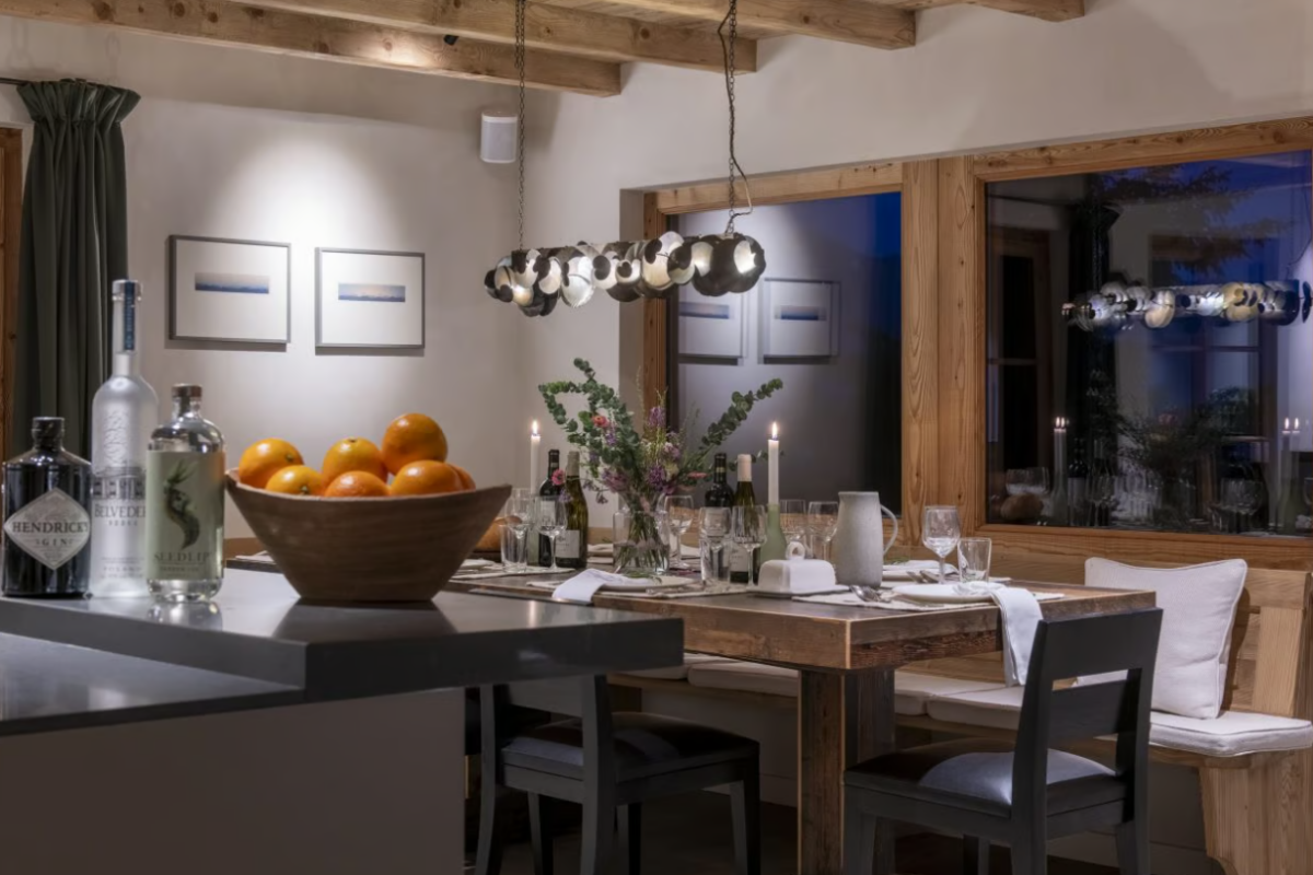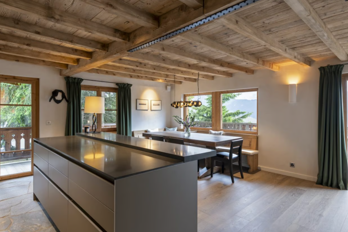 Step inside this three-story haven, where the main floor unveils a uniquely designed open-plan kitchen and living area. The Scandinavian-inspired aesthetic is evident throughout, characterized by its beautiful layout and neutral tones. The fully equipped kitchen features an island with sleek grey counters and cabinetry, along with counter seating perfect for evening entertaining. The kitchen overlooks a dining table that seats up to eight guests, and the entire space is bathed in natural light from the surrounding windows and large doors that lead out onto a wrap-around balcony. Here, you can enjoy breathtaking mountain views, al fresco meals and hours of sunshine thanks to the balcony's south-facing aspect.