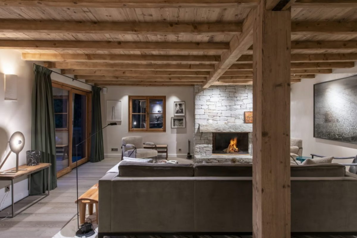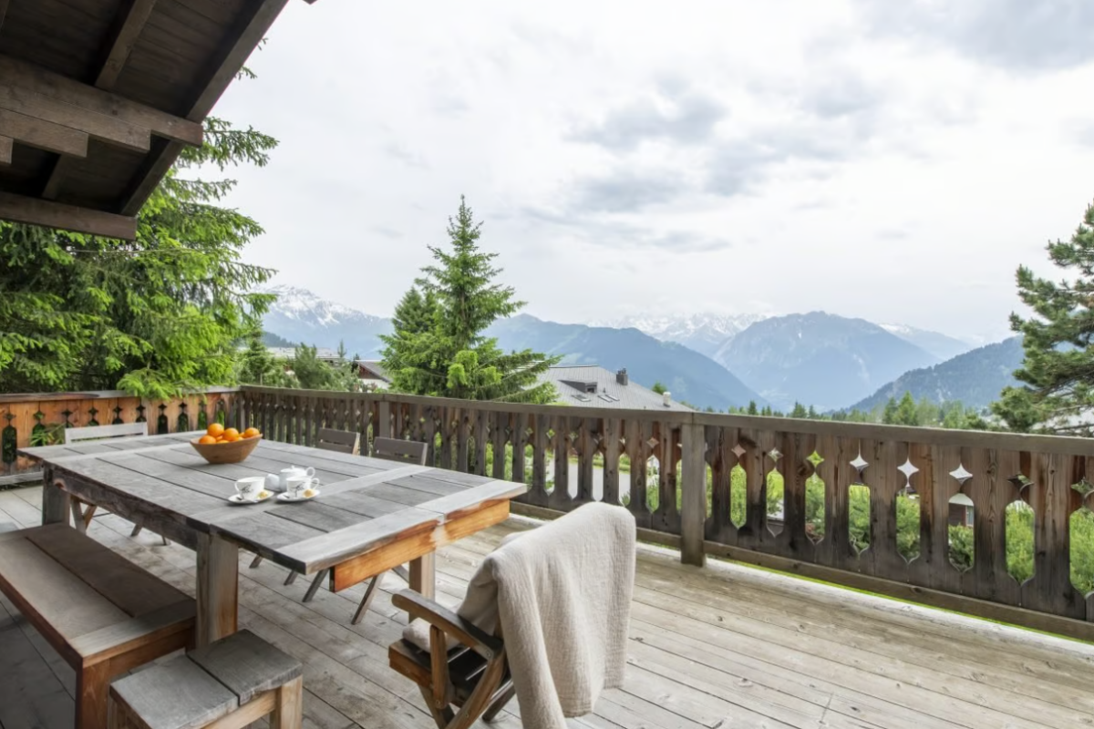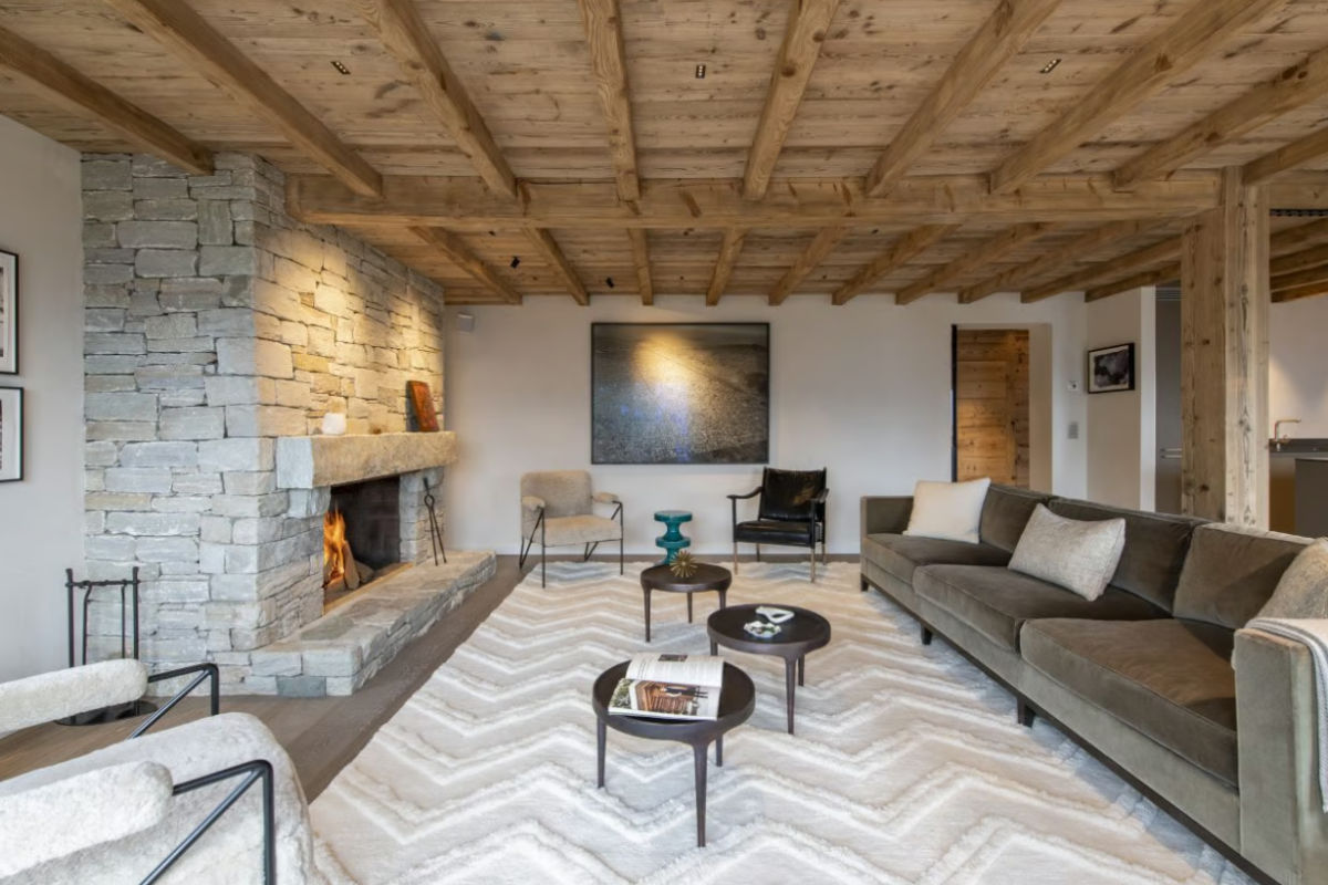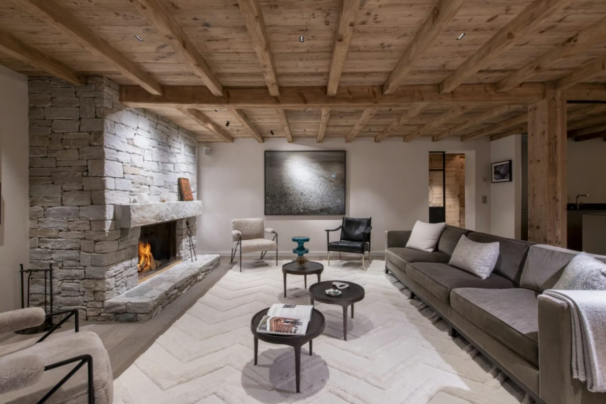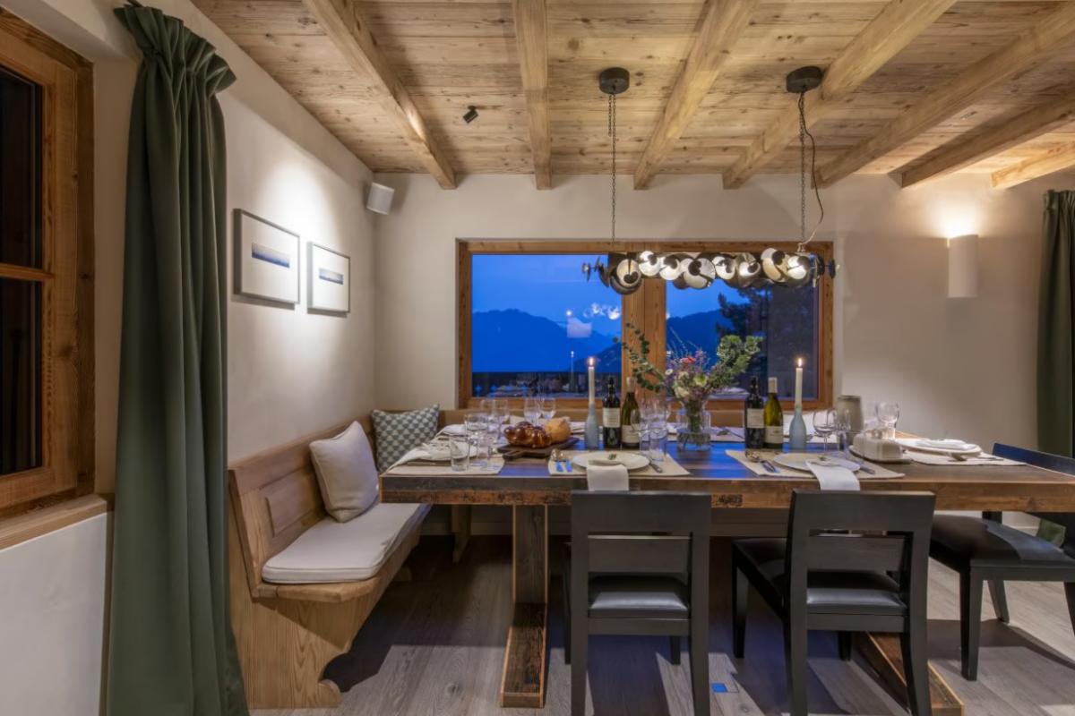 Step inside this three-story haven, where the main floor unveils a uniquely designed open-plan kitchen and living area. The Scandinavian-inspired aesthetic is evident throughout, characterized by its beautiful layout and neutral tones. The fully equipped kitchen features an island with sleek grey counters and cabinetry, along with counter seating perfect for evening entertaining. The kitchen overlooks a dining table that seats up to eight guests, and the entire space is bathed in natural light from the surrounding windows and large doors that lead out onto a wrap-around balcony. Here, you can enjoy breathtaking mountain views, al fresco meals and hours of sunshine thanks to the balcony's south-facing aspect.