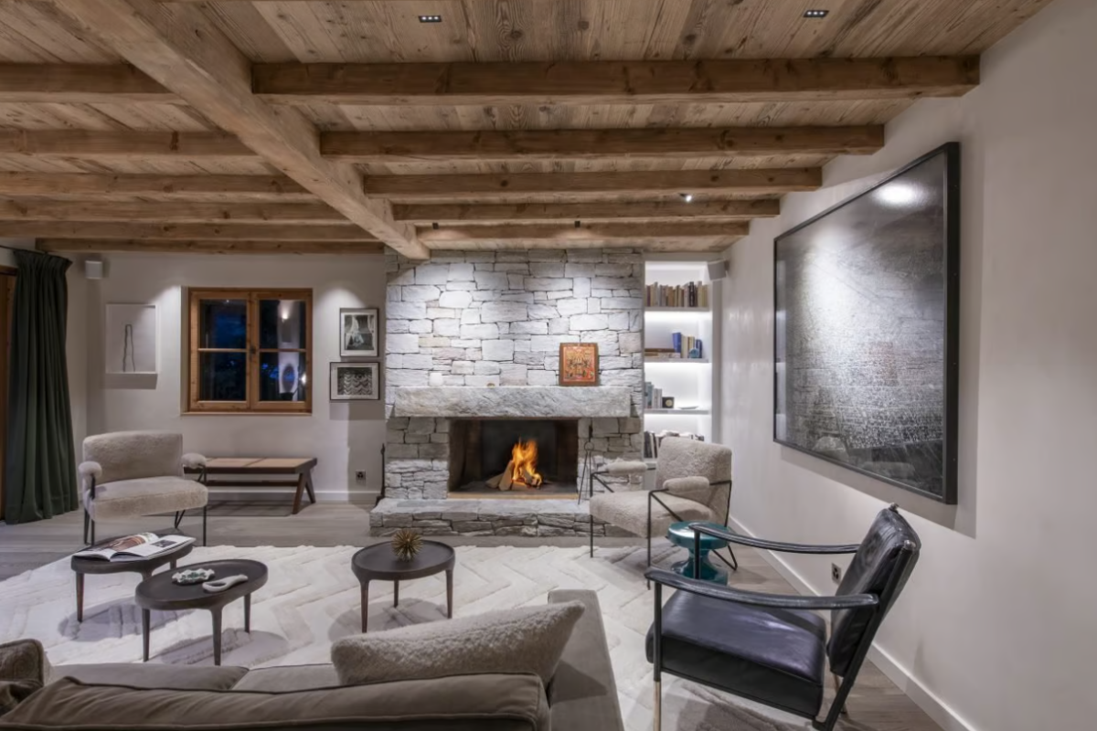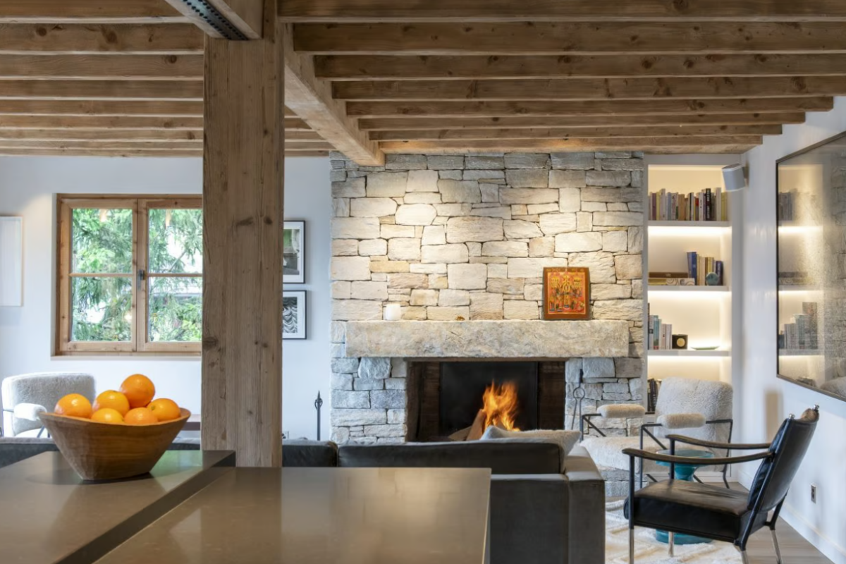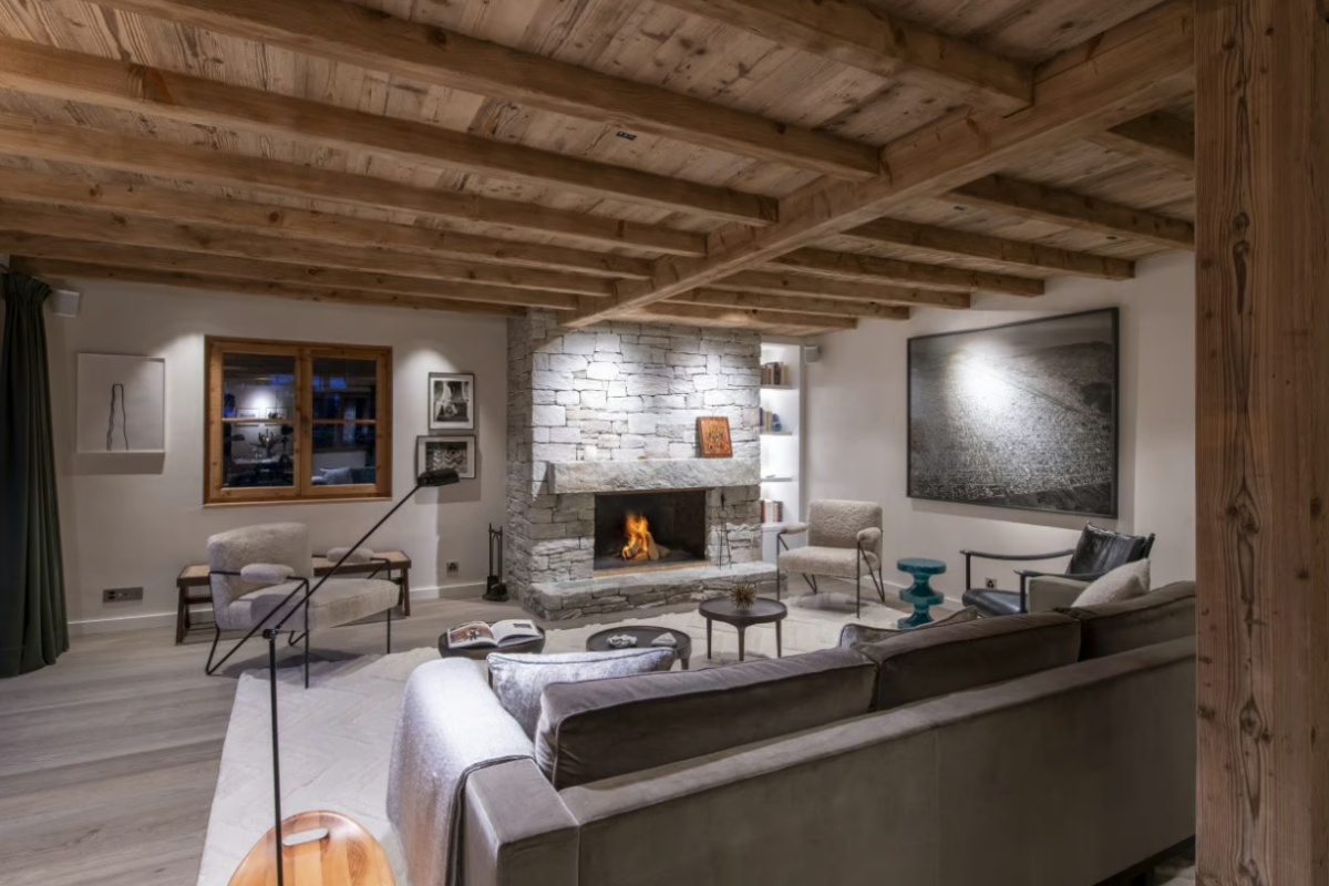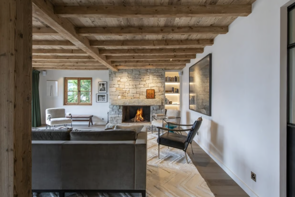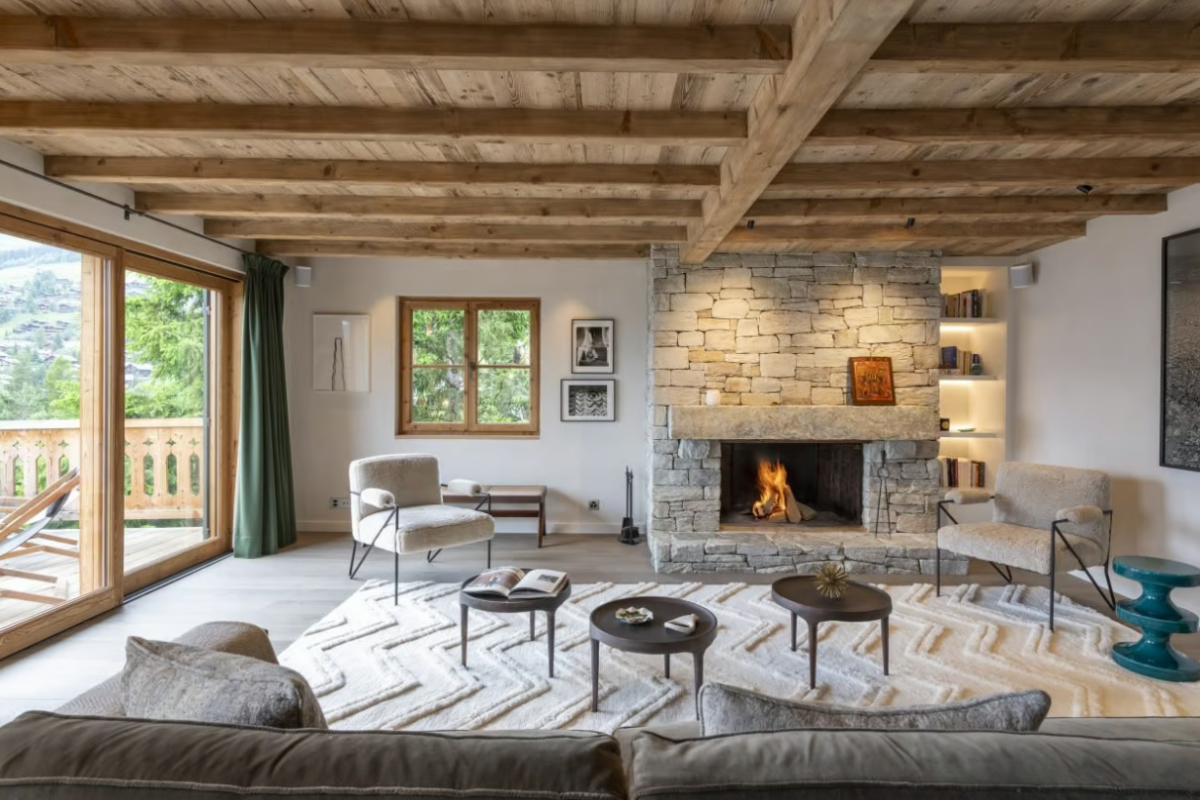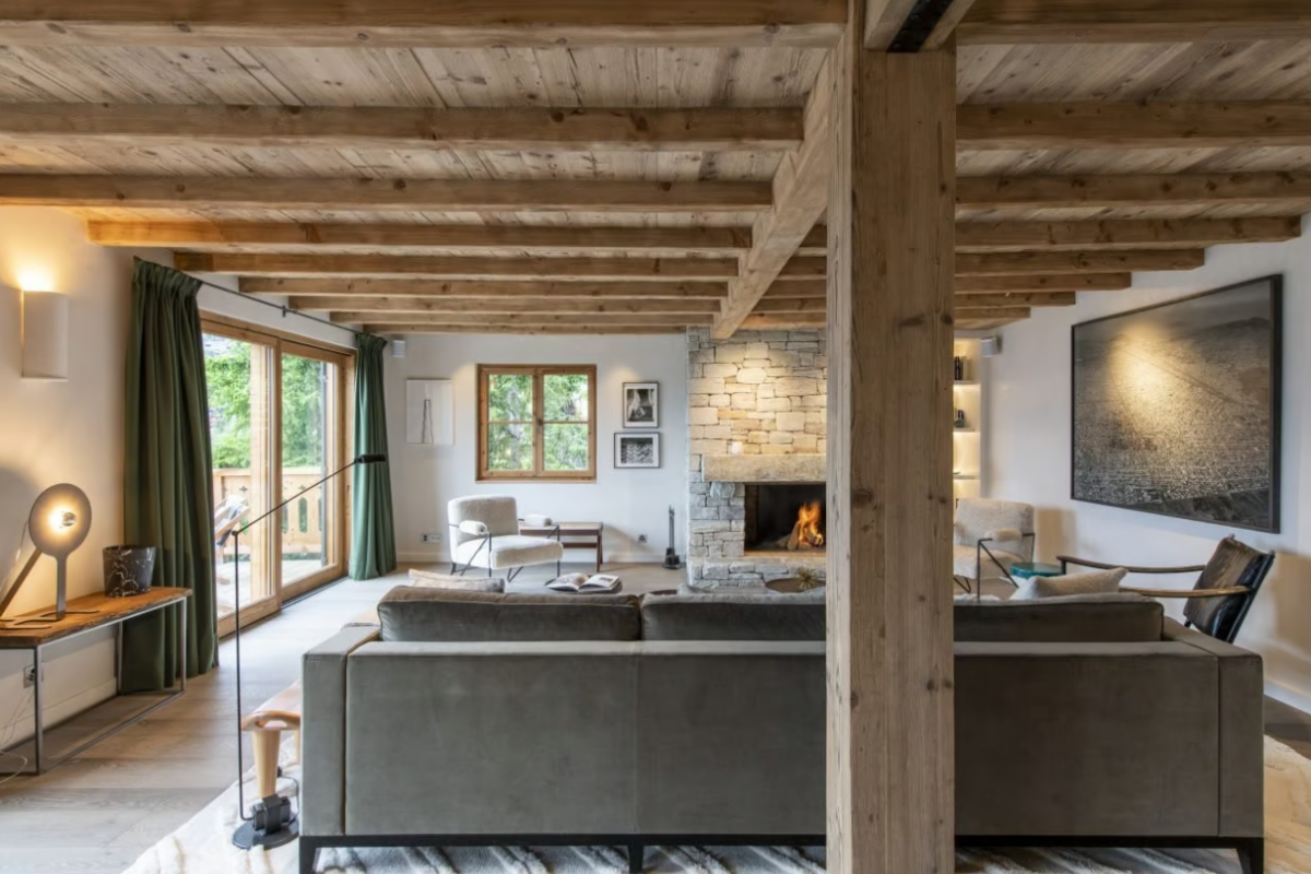 Step inside this three-story haven, where the main floor unveils a uniquely designed open-plan kitchen and living area. The Scandinavian-inspired aesthetic is evident throughout, characterized by its beautiful layout and neutral tones. The fully equipped kitchen features an island with sleek grey counters and cabinetry, along with counter seating perfect for evening entertaining. The kitchen overlooks a dining table that seats up to eight guests, and the entire space is bathed in natural light from the surrounding windows and large doors that lead out onto a wrap-around balcony. Here, you can enjoy breathtaking mountain views, al fresco meals and hours of sunshine thanks to the balcony's south-facing aspect.