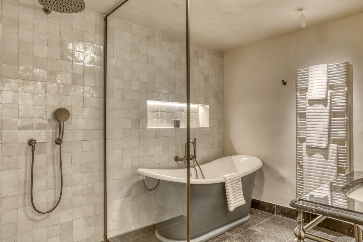 > Bedroom n°3 : Double or twin beds 2 x 90cm, terrace access, en-suite bathroom with bathtub, shower, and toilet