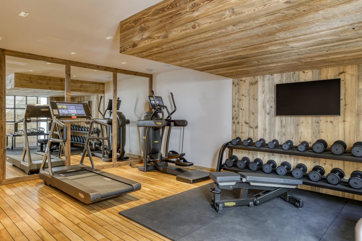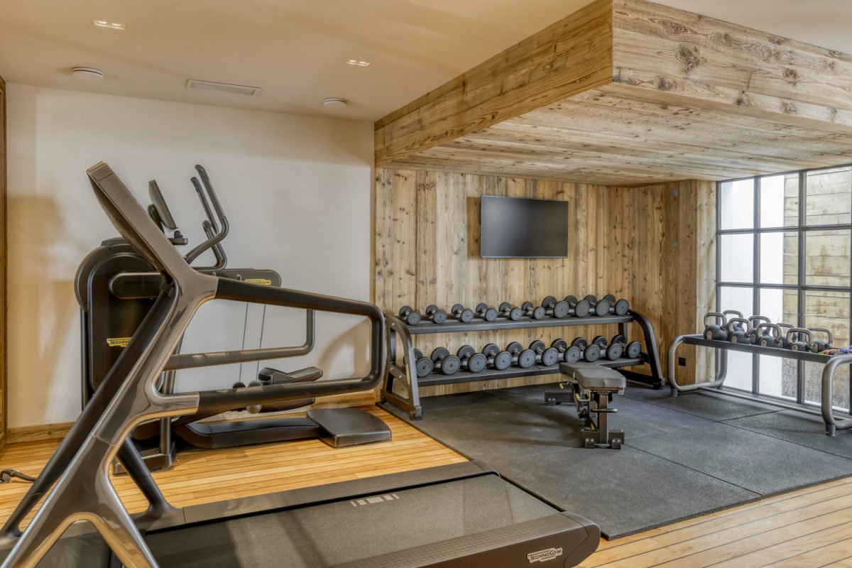 > Fitness room with multigym, treadmill, elliptical bike, weights
