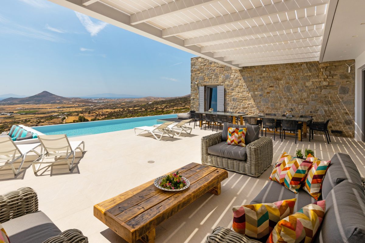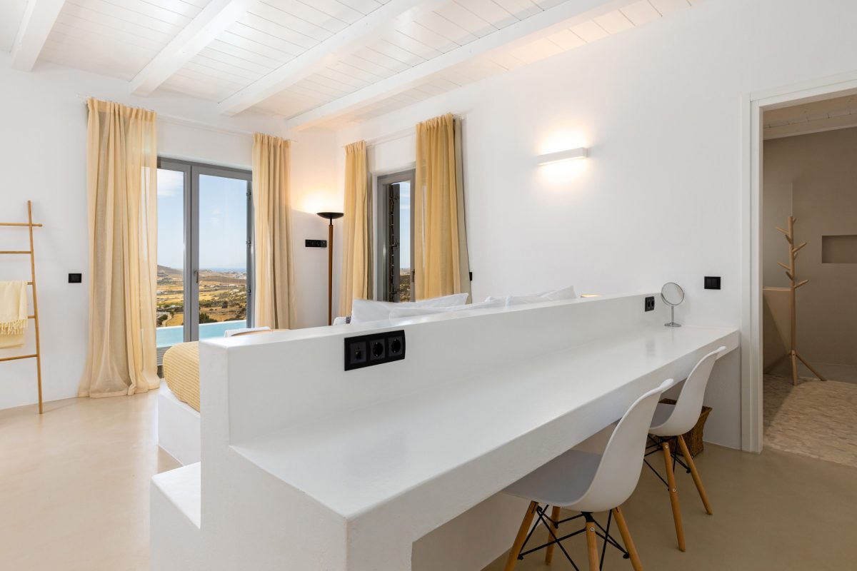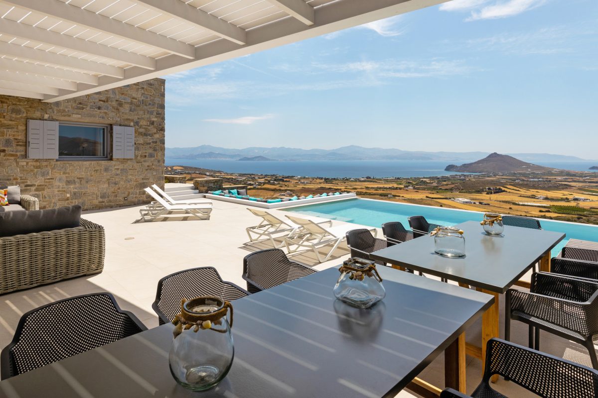Villa Chiaro Di Luna is a modern villa located in the Kostos area, offering excellent privacy and a stunning panoramic view of the countryside below, stretching out to the sea and the island of Naxos in the background. Some popular beaches, such as Tsoukalia and Santa Maria, are easily accessible within a few minutes by car, as is the lively town of Naoussa, filled with bars, restaurants, and shops for every taste.