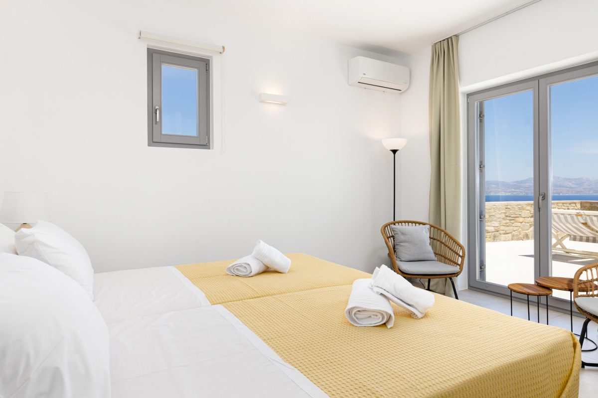 1 Master Bedroom with double bed, air conditioning, en-suite bathroom with shower, direct access to pool terrace, sea view
