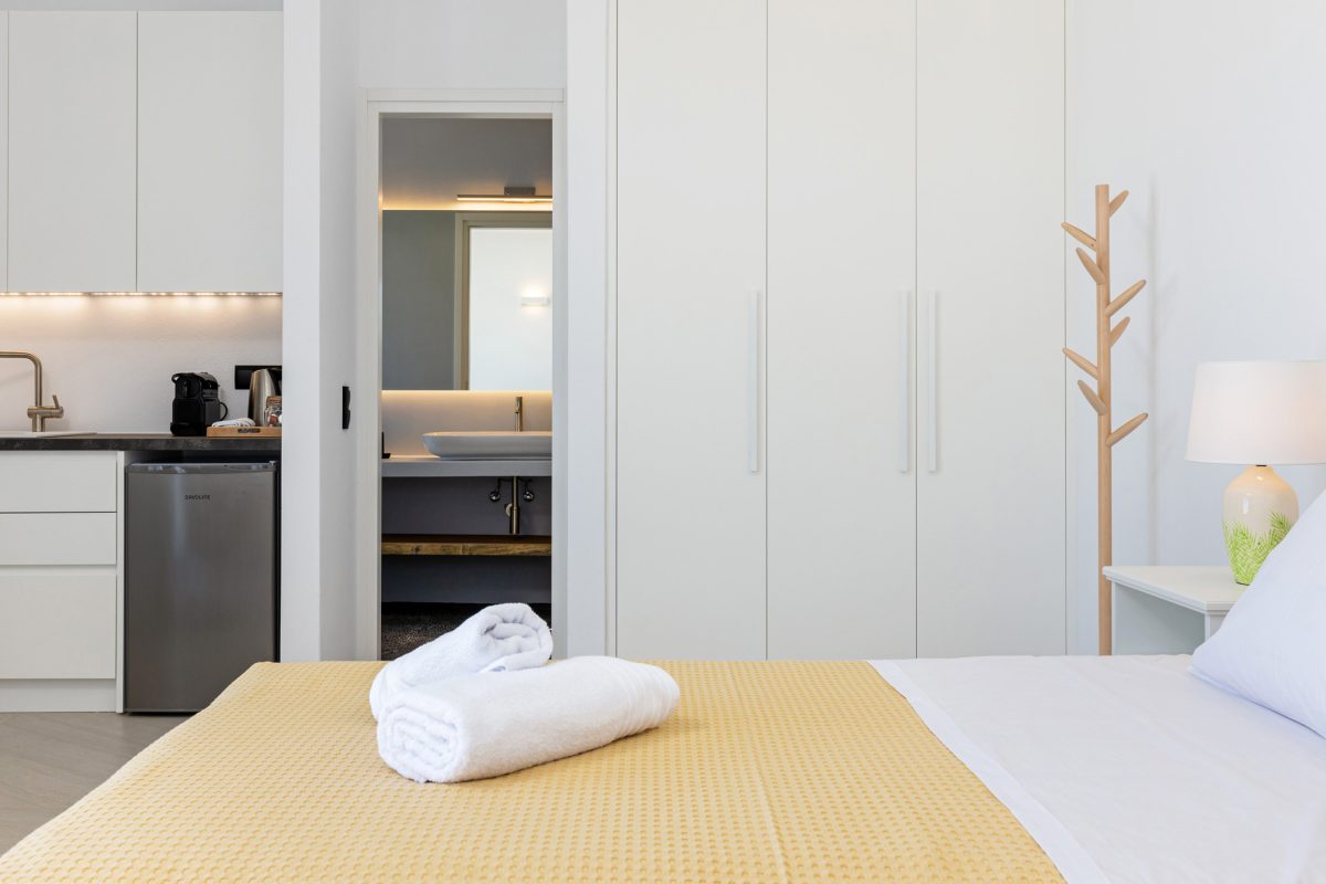 1 Guest Bedroom with twin beds, air conditioning, en-suite bathroom with shower, kitchenette, independent access from outside, sea view.