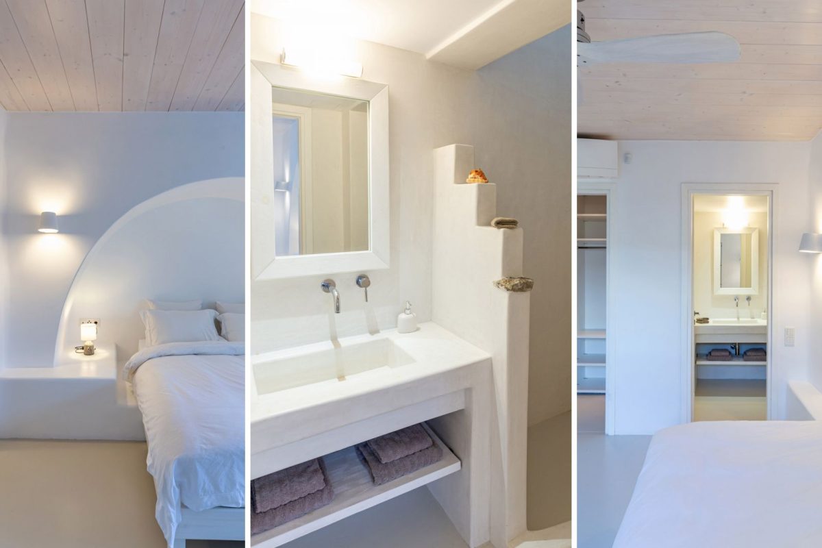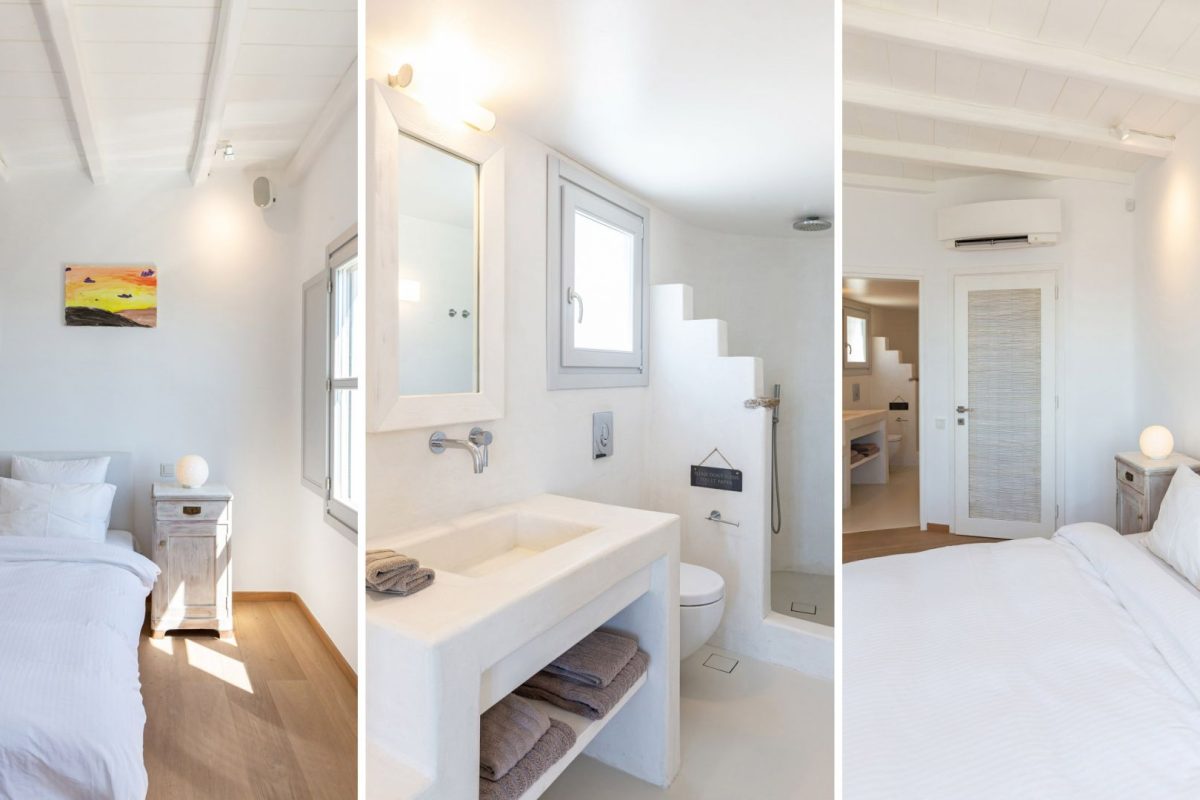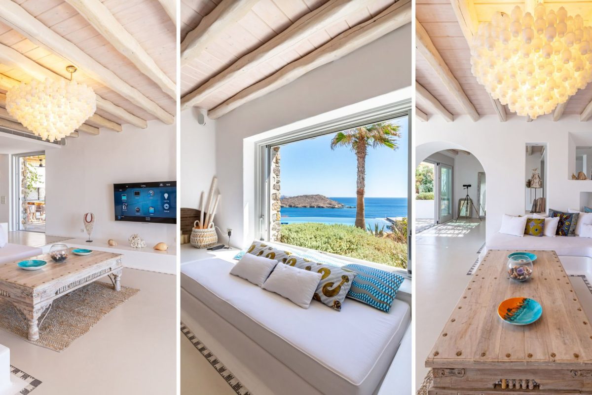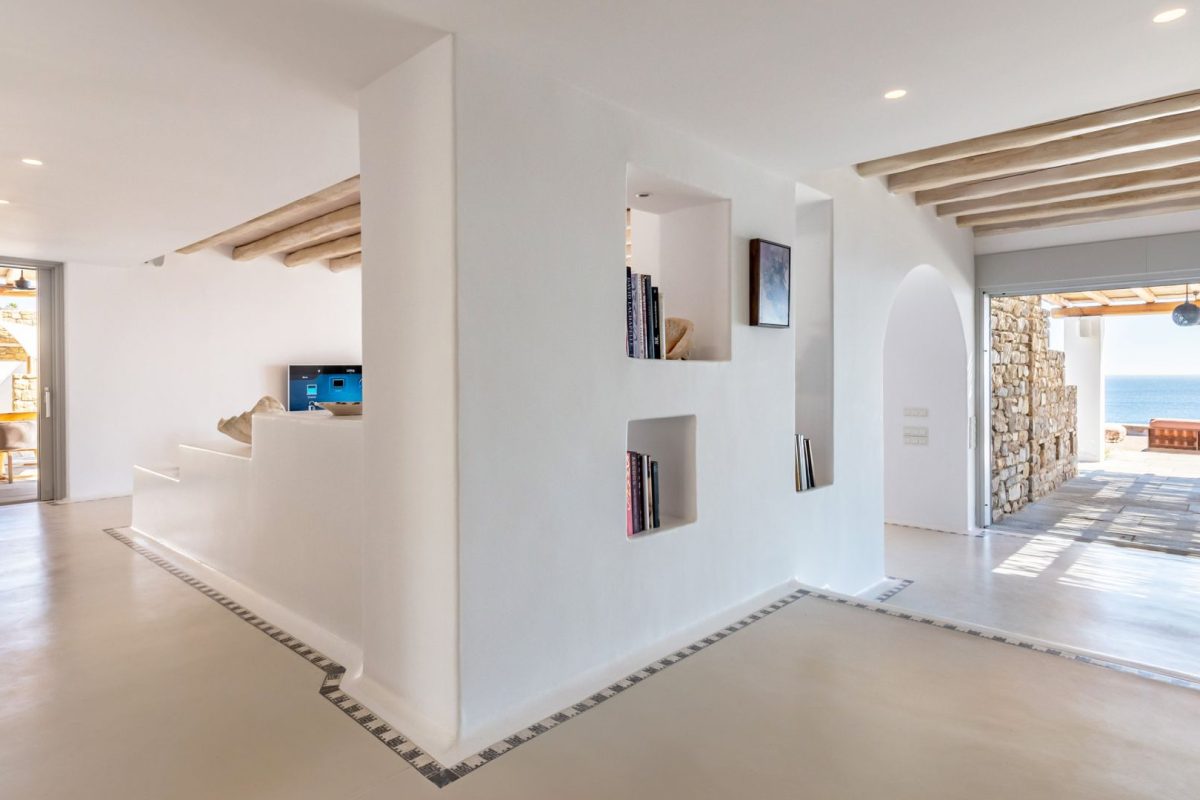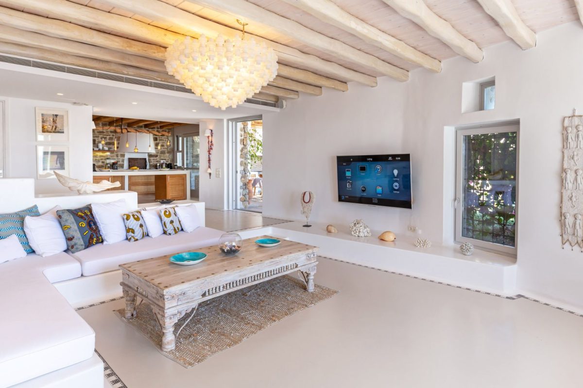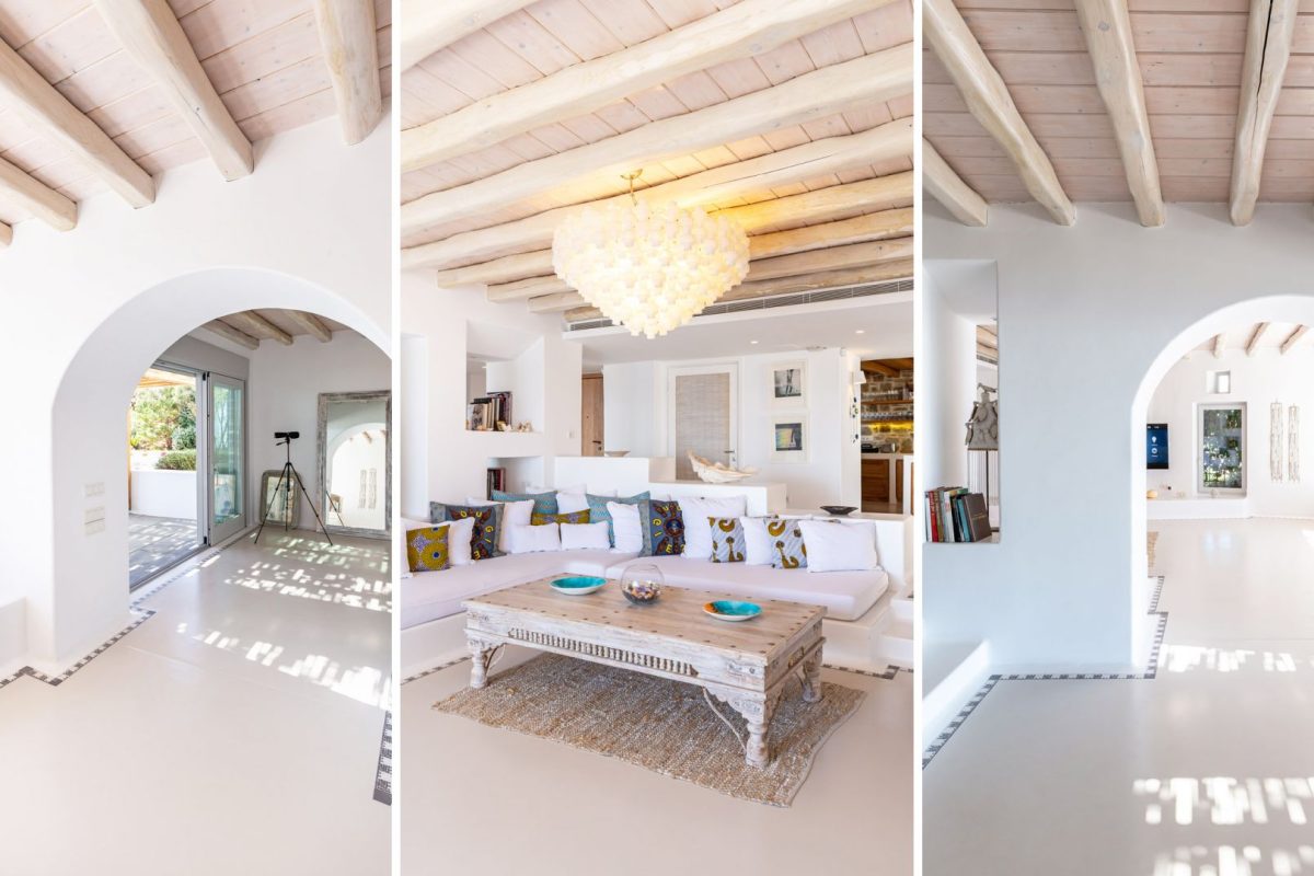 Inside, the villa is characterized by a clean and occasionally traditional style. The common spaces and all the rooms are comfortable and well-furnished, with carefully integrated technological amenities, without unnecessary excess or extravagance. The environment is consistently fresh and inviting, with a predominant use of light colors and natural materials.
