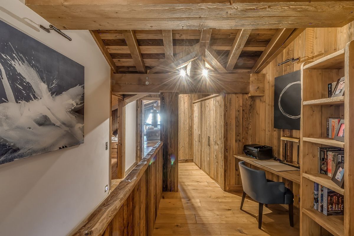The main living area is located on the lower floor featuring an open plan seating arrangement around a cosy, atmospheric fireplace. Adjoining this is an elegant dining room and separate kitchen which opens onto a balcony with mountain views. Upstairs you will find a study area for those who need a quiet space to catch up with some work.
