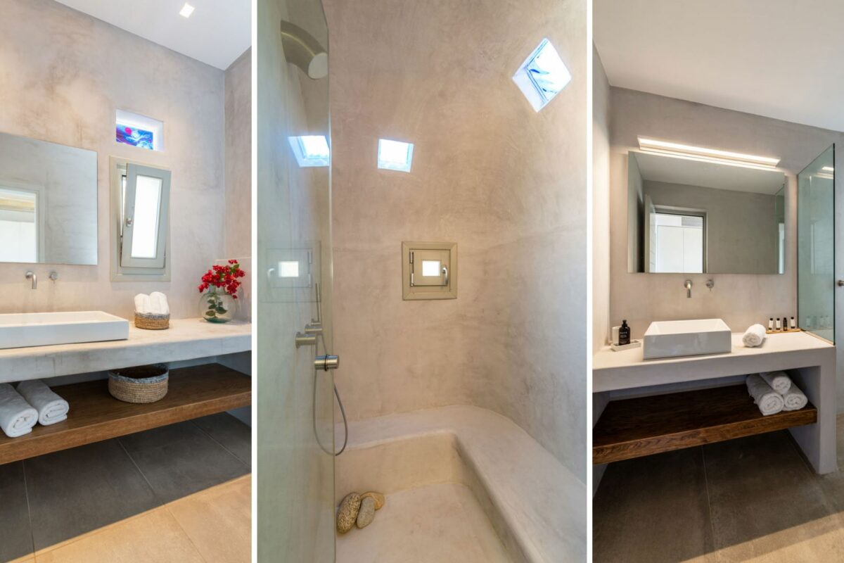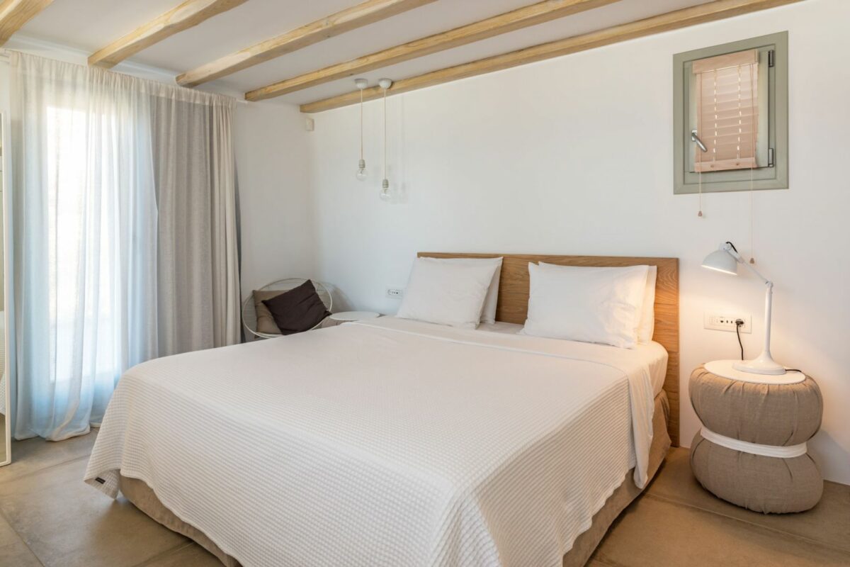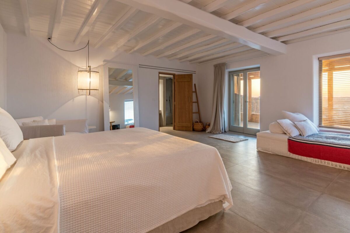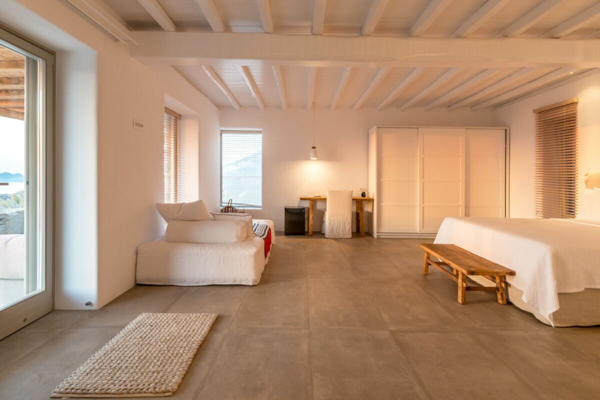 A remarkable attention to details is evident throughout the indoor spaces of Villa 9617. Each room is appointed with style, each piece of furniture was carefully chosen to contribute to an airy, elegant atmosphere. Modern amenities and domotics complete the picture, ensuring guests feel both pampered and entertained. For the ultimate relaxation experience a new hammam, massage room and small private gym were added to the property near the lower guest suite. True to Cycladic style the property was built in units, with some bedrooms having independent access for added privacy.