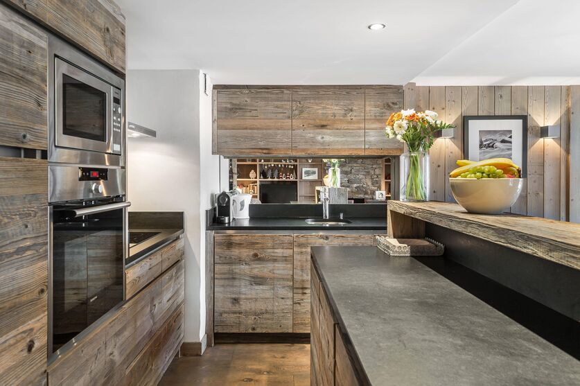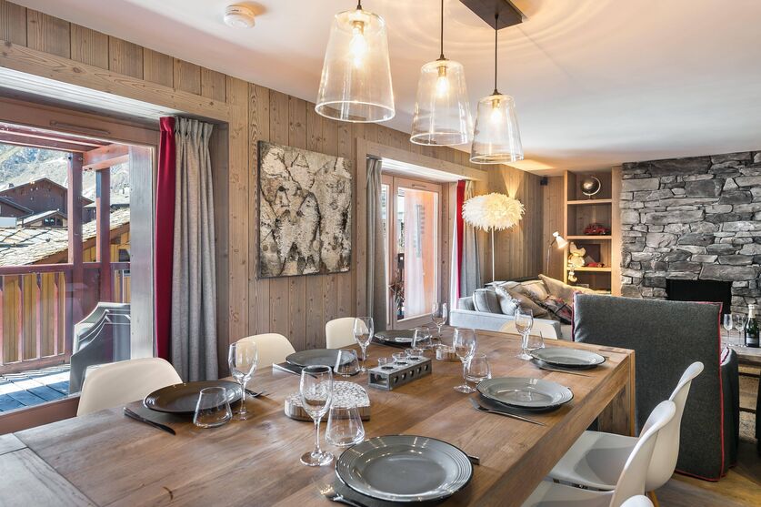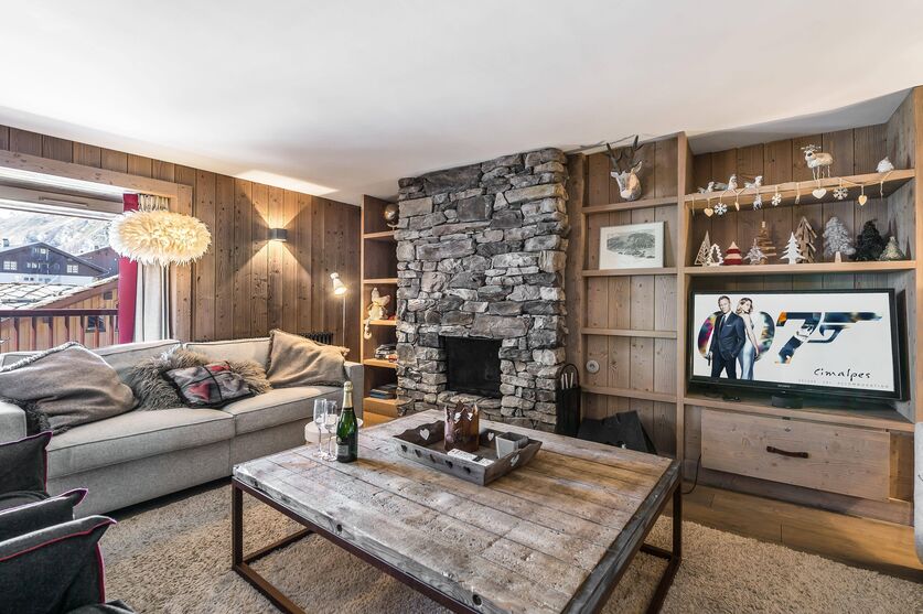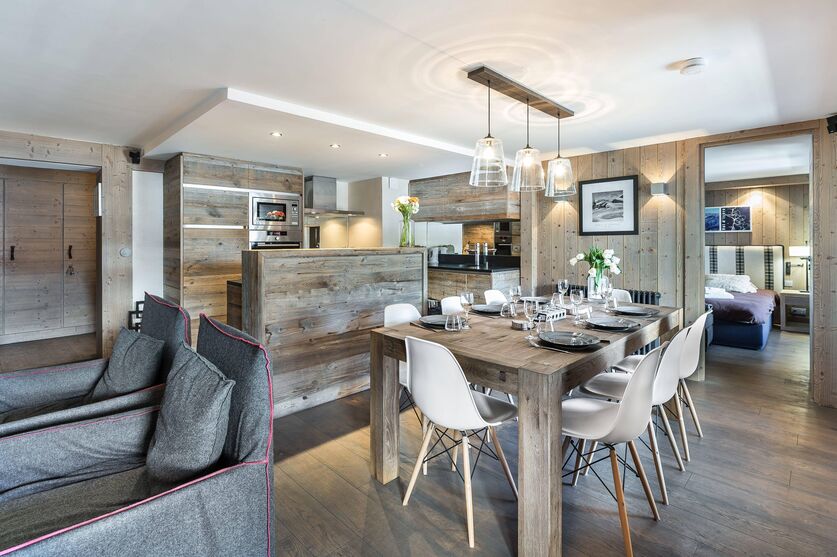 L'appartement Glacier 2 dispose d'une cuisine américaine ouverte sur un séjour spacieux, décoré dans une ambiance qui allie à la fois modernité et tradition. Le séjour accueille une belle cheminée en pierres où vous pourrez partager de beaux moments de convivialité, en famille ou entre amis, au coin du feu.