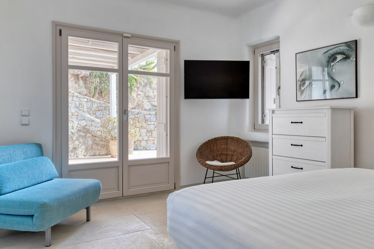 1 Guest Bedroom with Queen Size double bed, A/C, en-suite bathroom with shower, direct access to pool terrace, sea view
