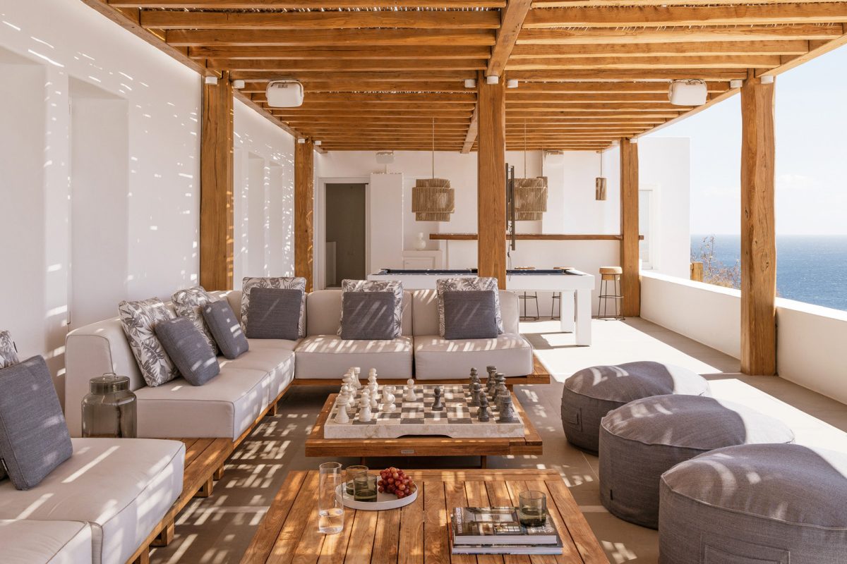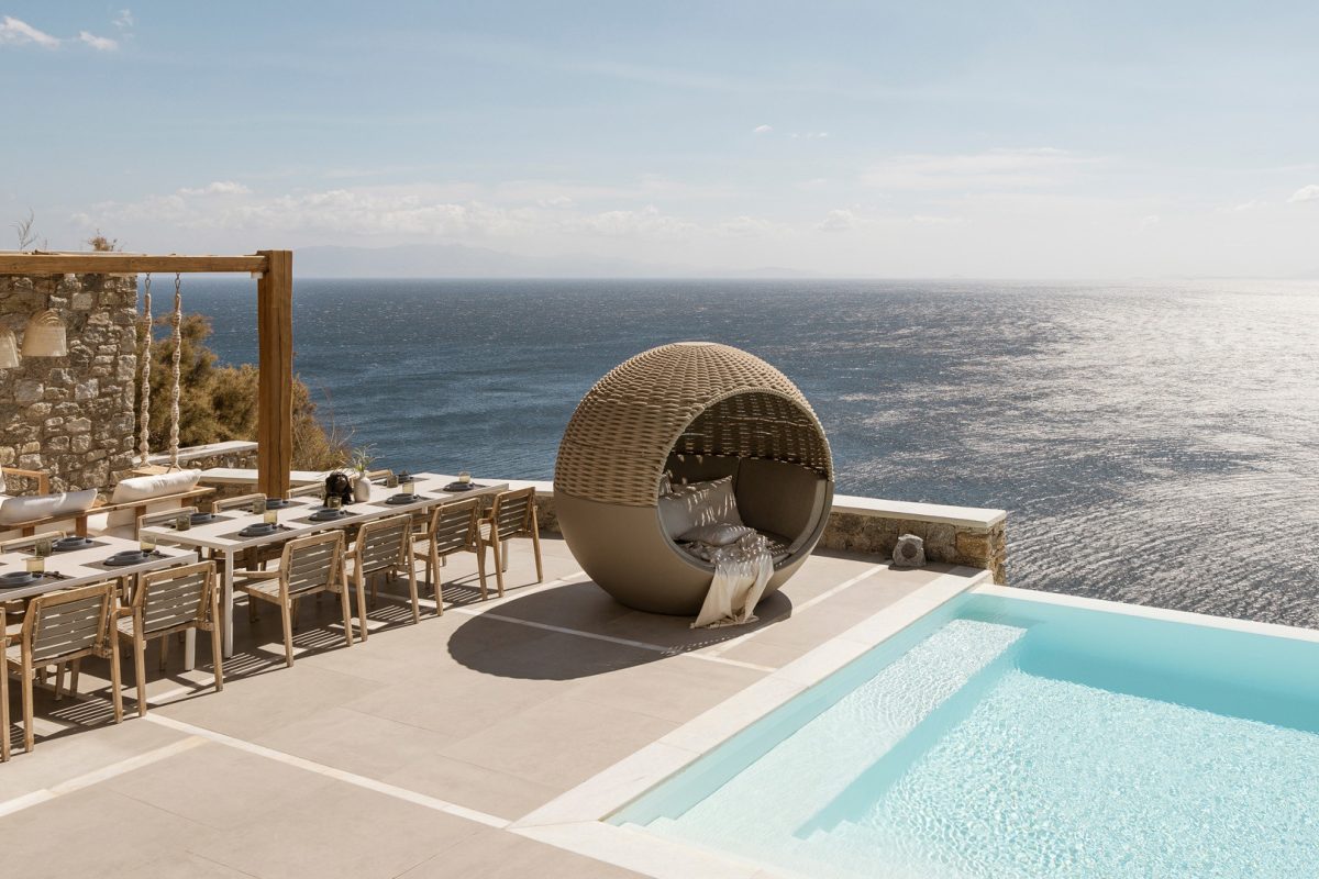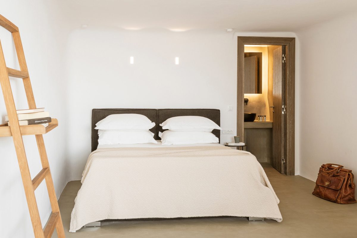 The architecture is in a Cycladic style revisited with a contemporary eye. The building, with its classic white walls, is spread over three distinct levels. The upper level hosts a pleasant covered dining area connected to the interior, while the lower level features the inviting infinity pool.