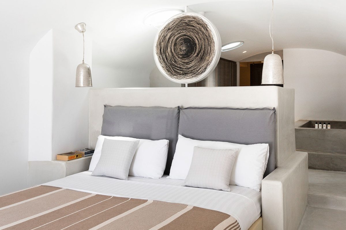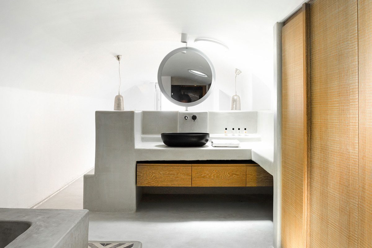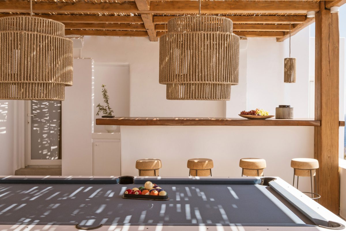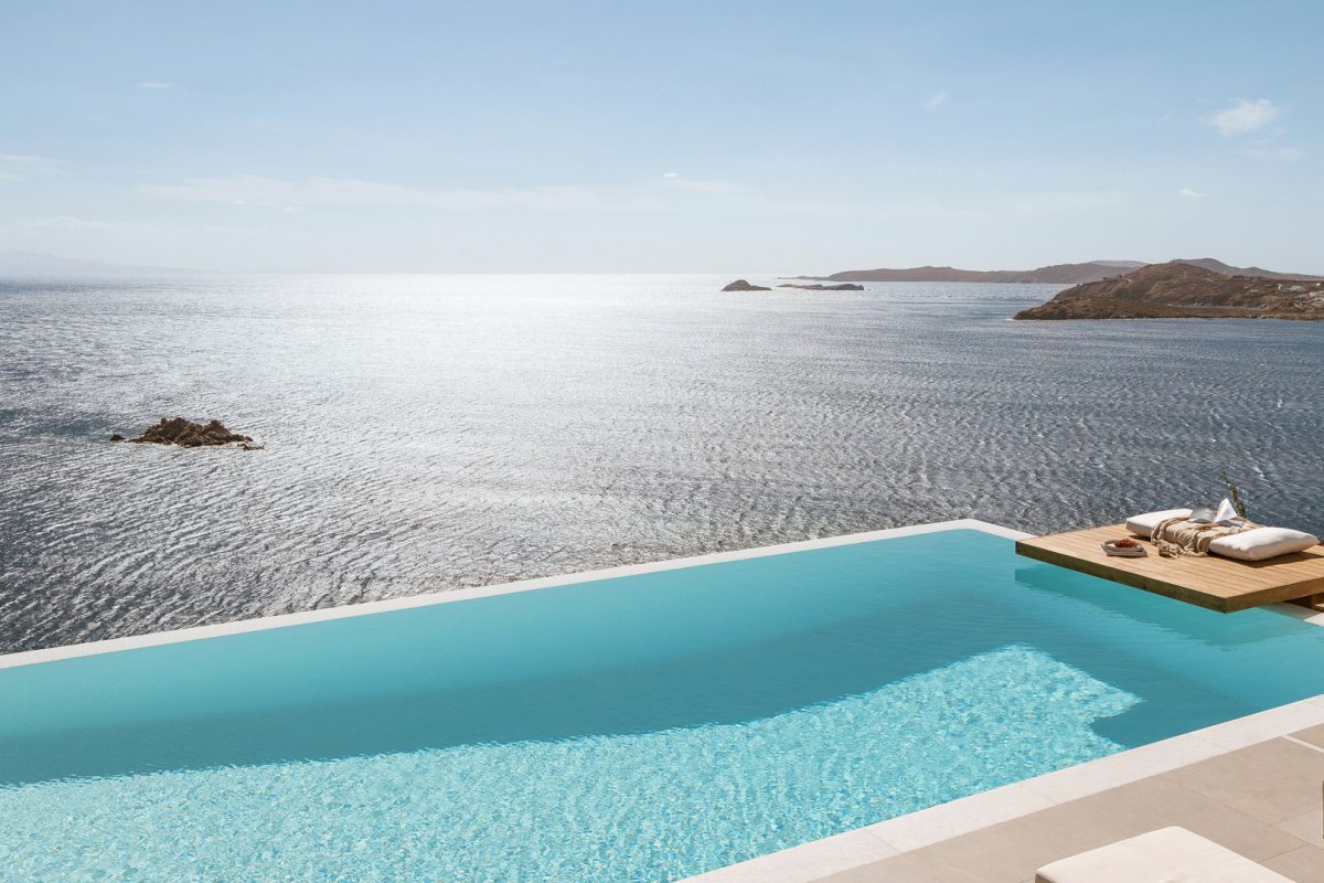 The architecture is in a Cycladic style revisited with a contemporary eye. The building, with its classic white walls, is spread over three distinct levels. The upper level hosts a pleasant covered dining area connected to the interior, while the lower level features the inviting infinity pool.