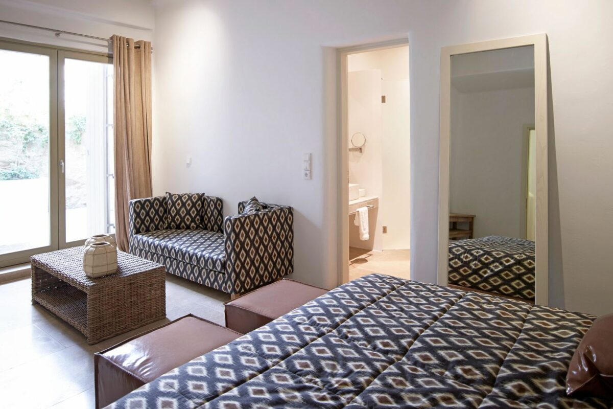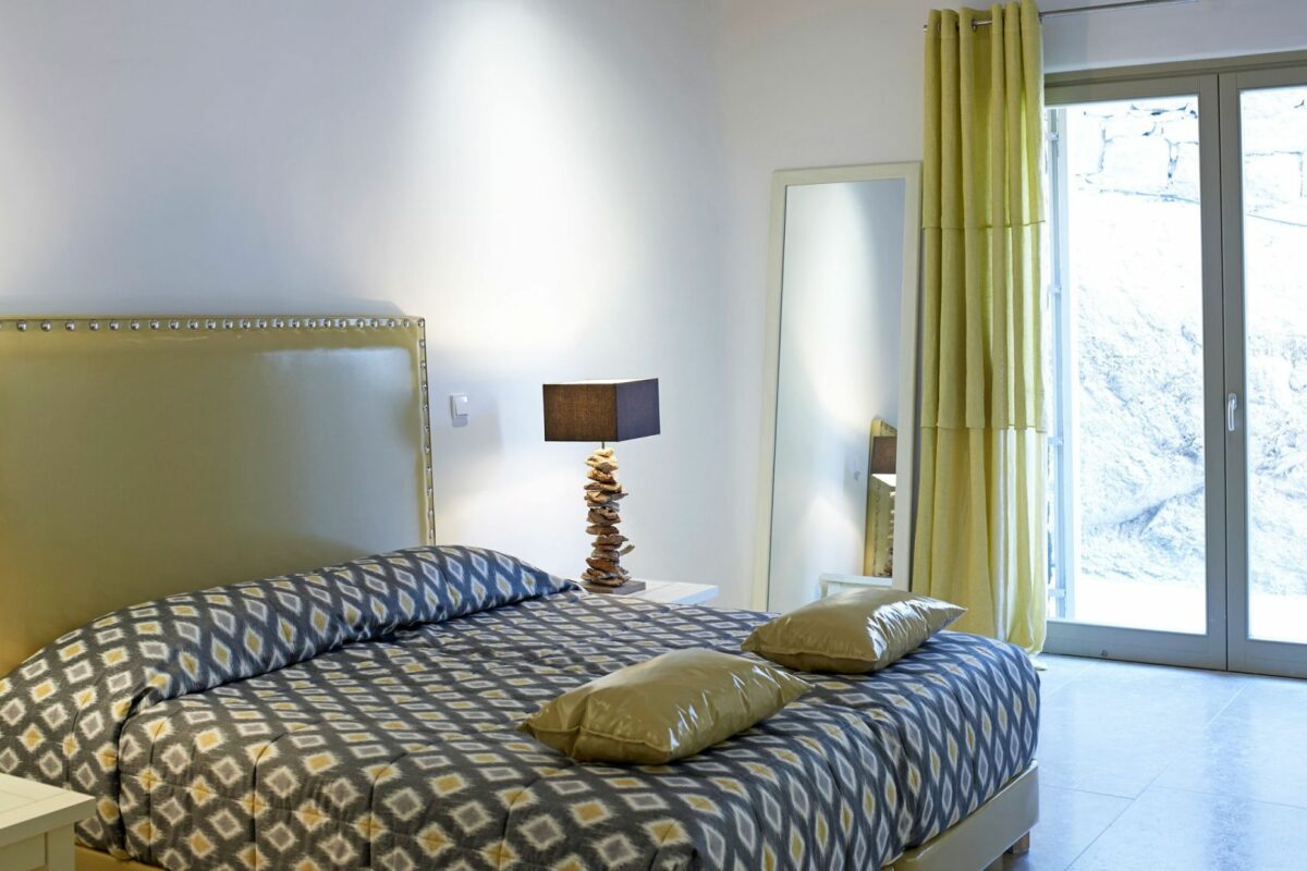 1 Guest Bedroom with double bed, A/C, en-suite bathroom with shower, TV, ceiling fan, direct access to pool terrace, sea view